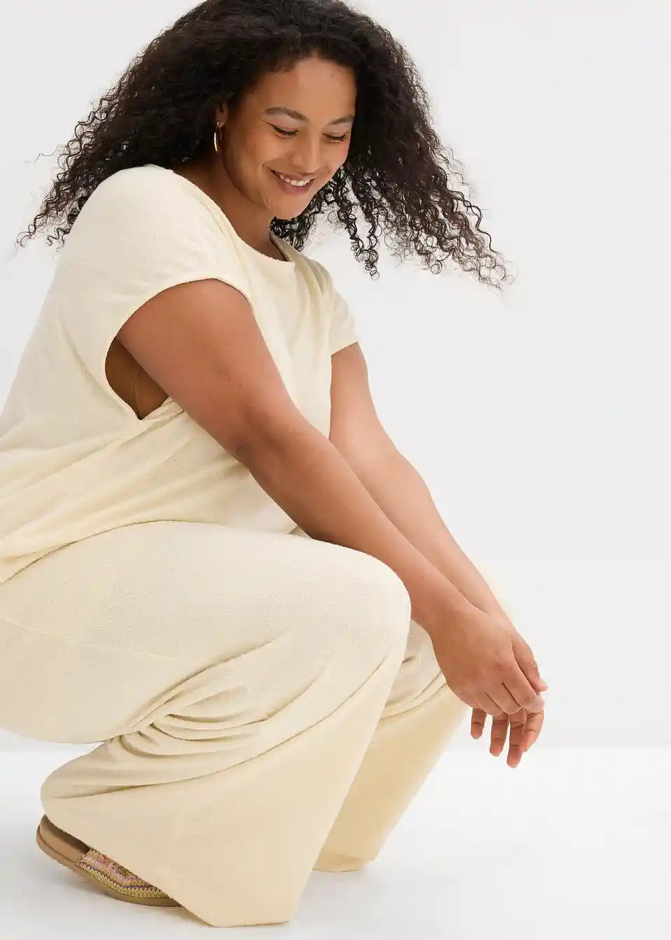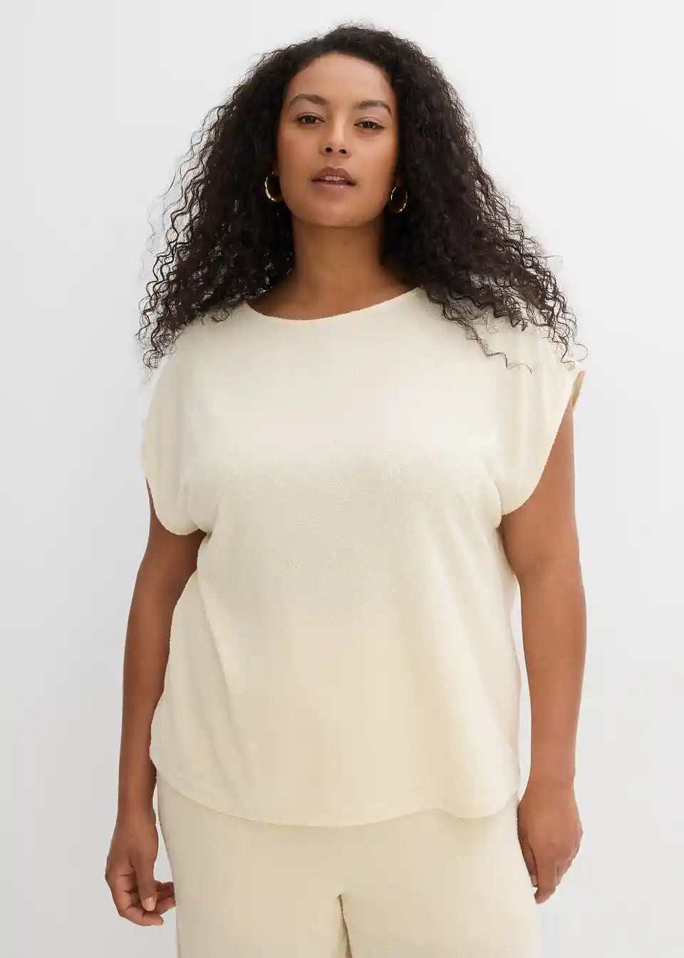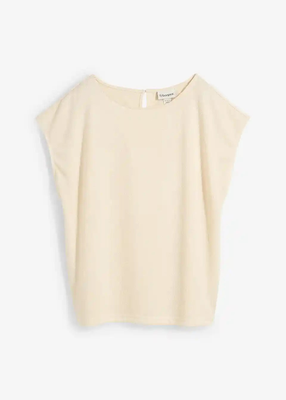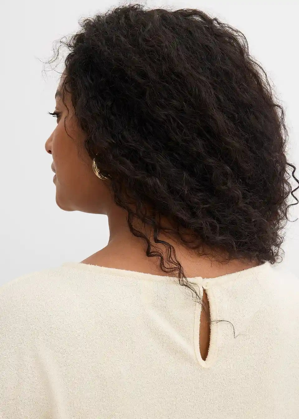 Majica v Oversize kroju s kimono rokavi. Odprtina v obliki ključavnice in zapenjanje na gumb na sredini zatilja.