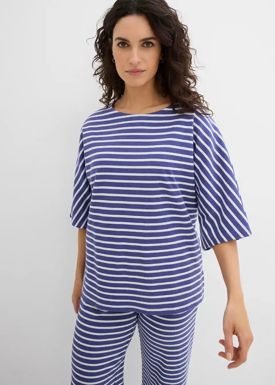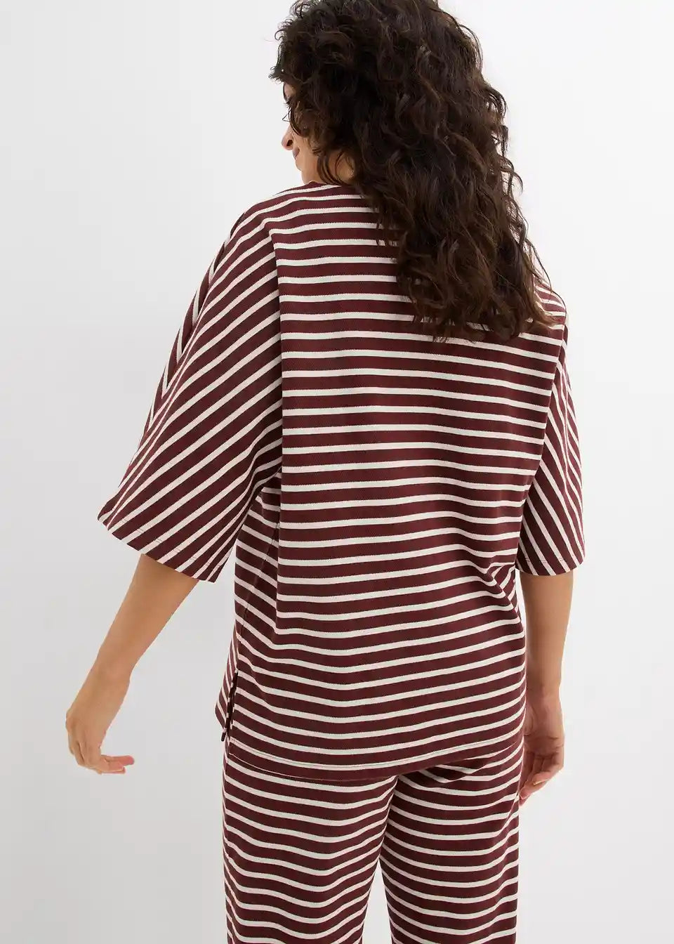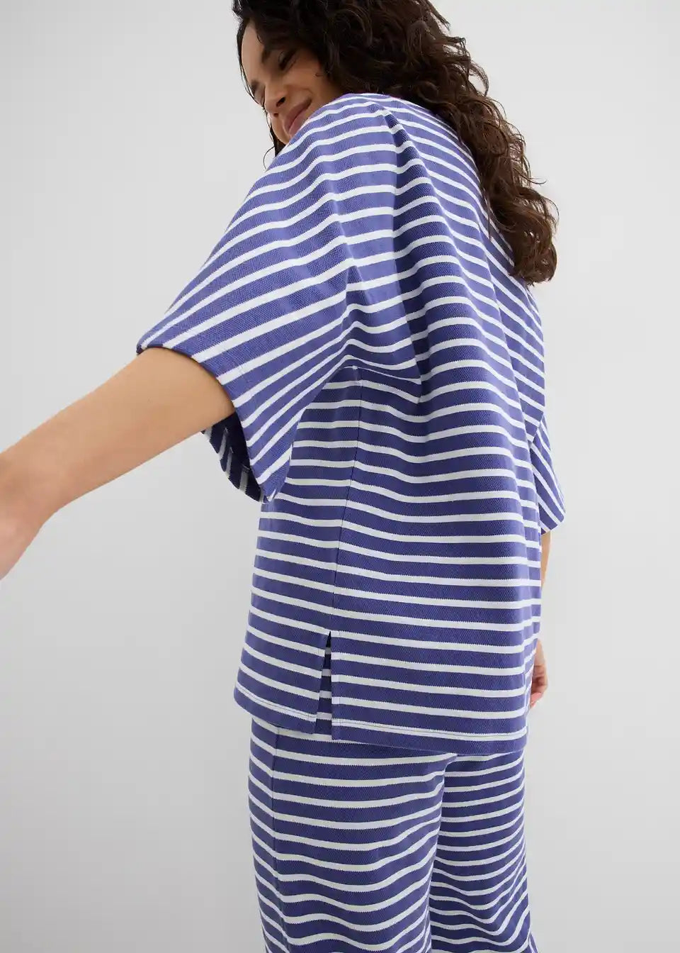 Majica iz strukturiranega materiala. Model z okroglim ovratnikom v kroju oversize s kimono rokavi in stranskimi razporki.