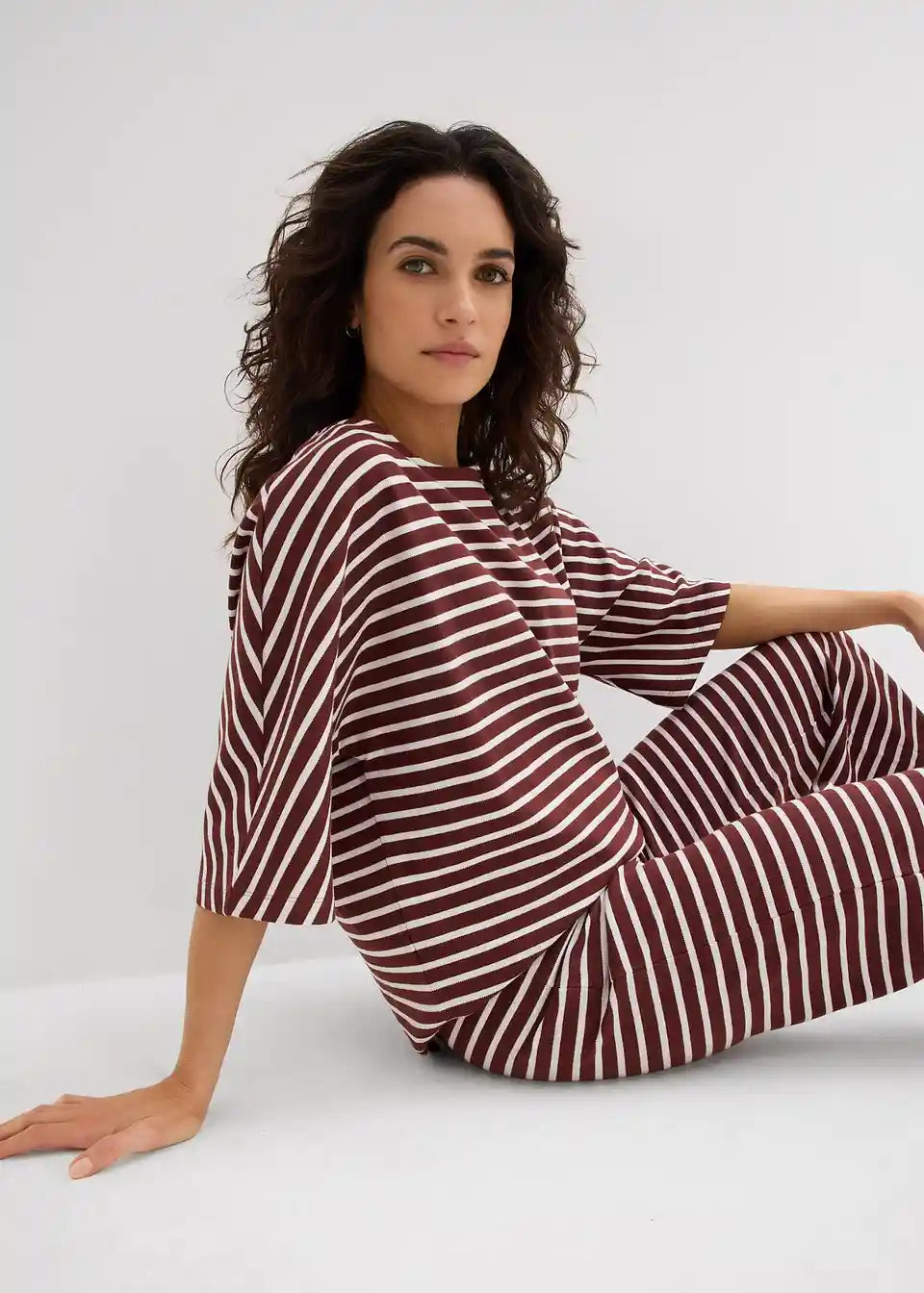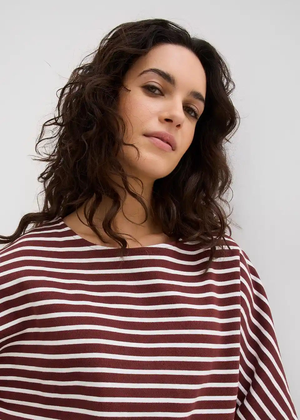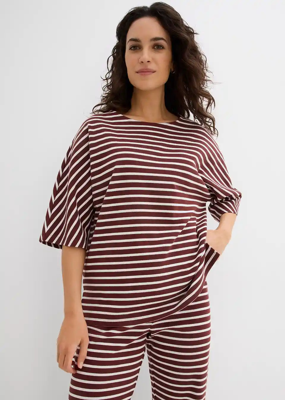 Majica iz strukturiranega materiala. Model z okroglim ovratnikom v kroju oversize s kimono rokavi in stranskimi razporki.