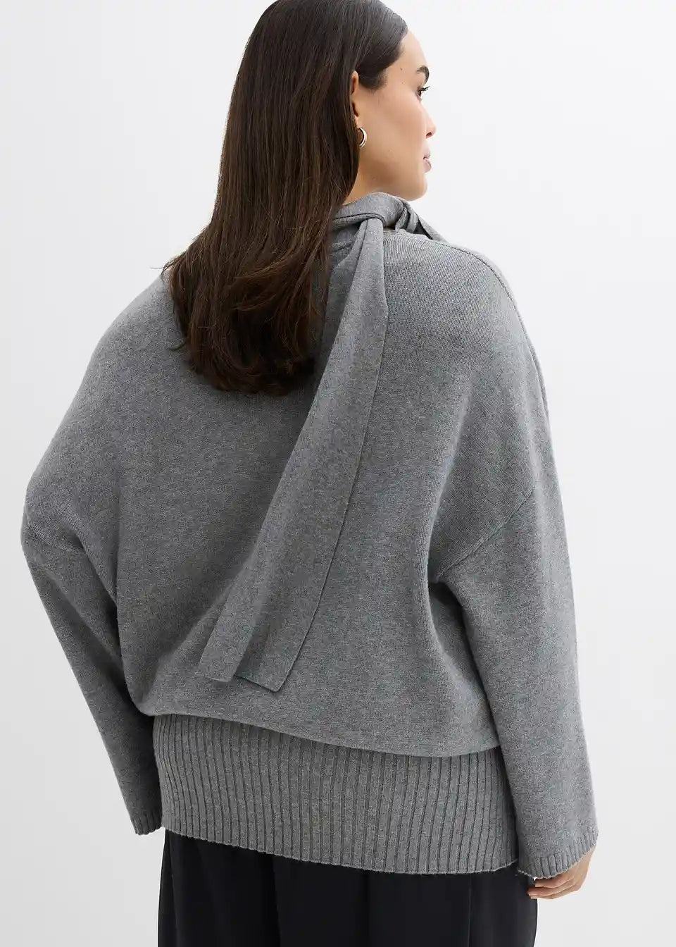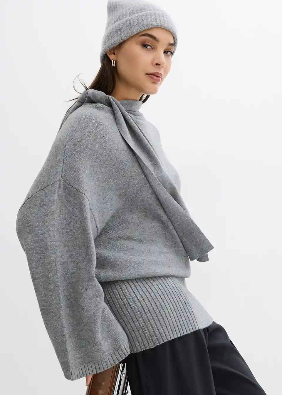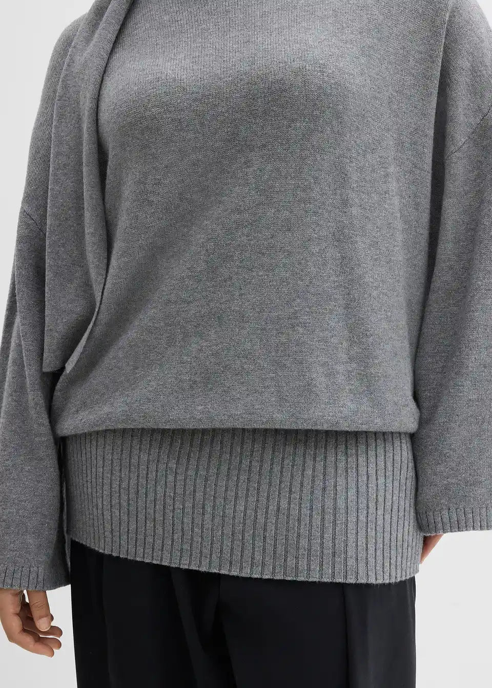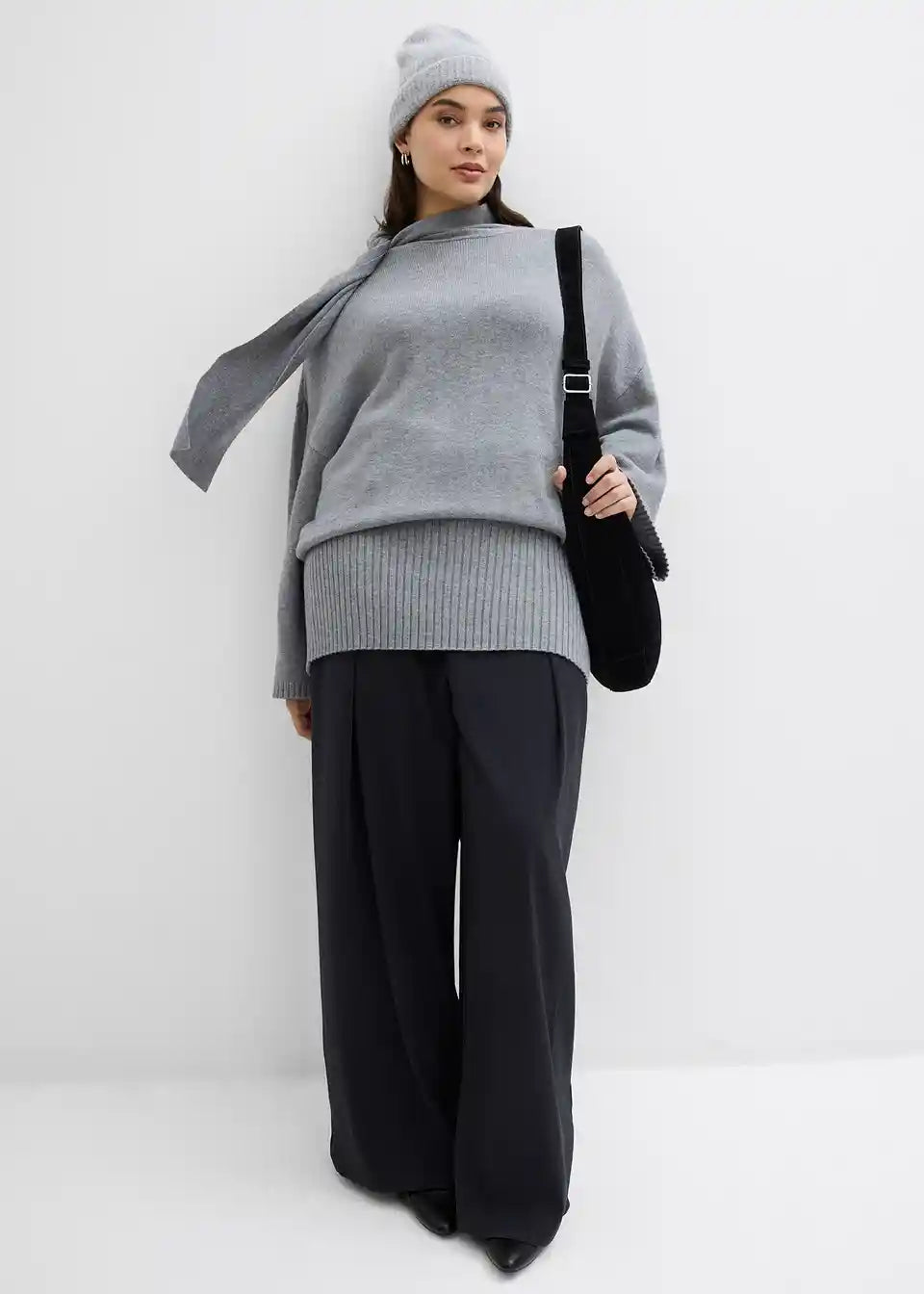 Ohlapen pulover s širokim rebrastim pasom in šalom na vratu