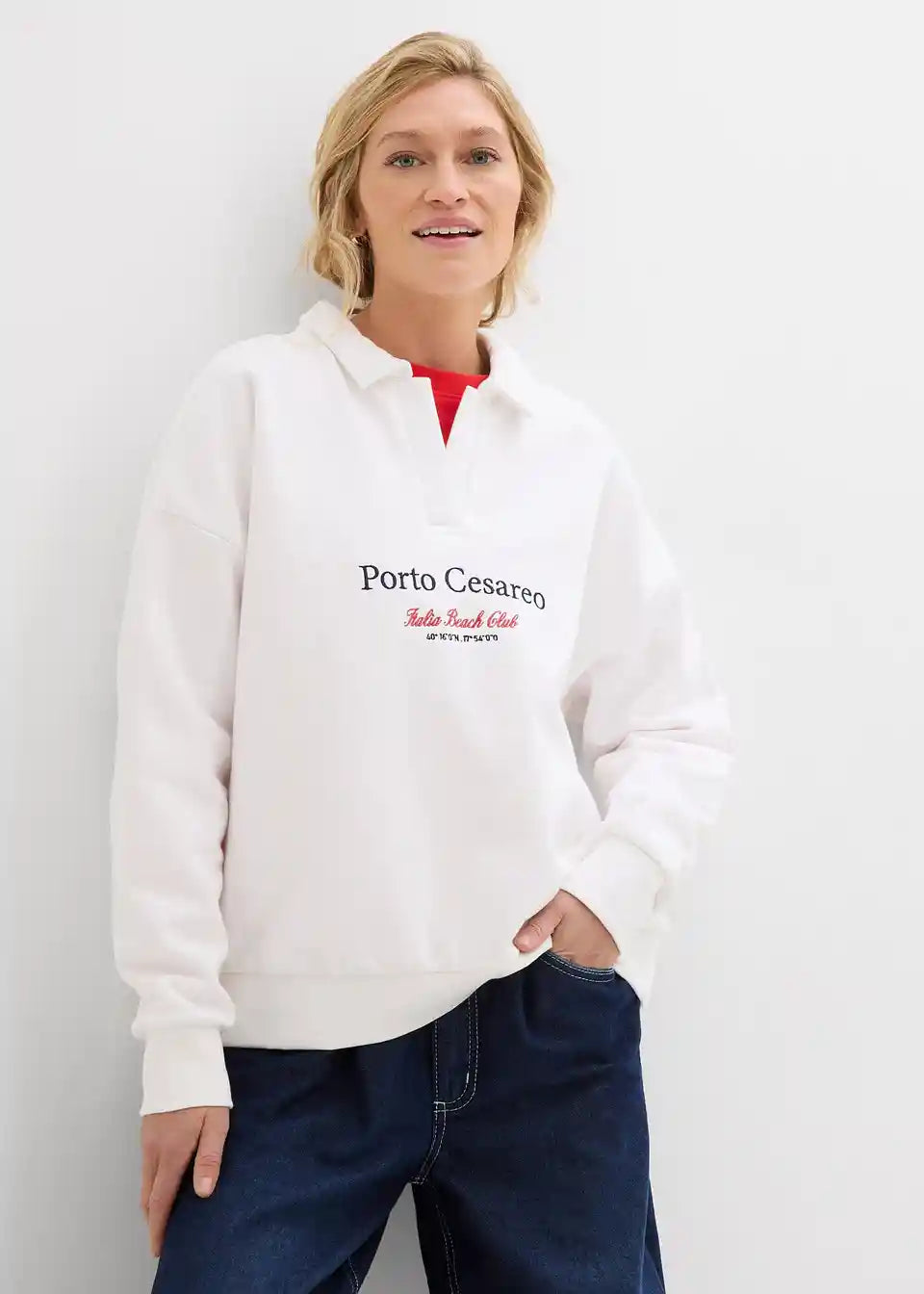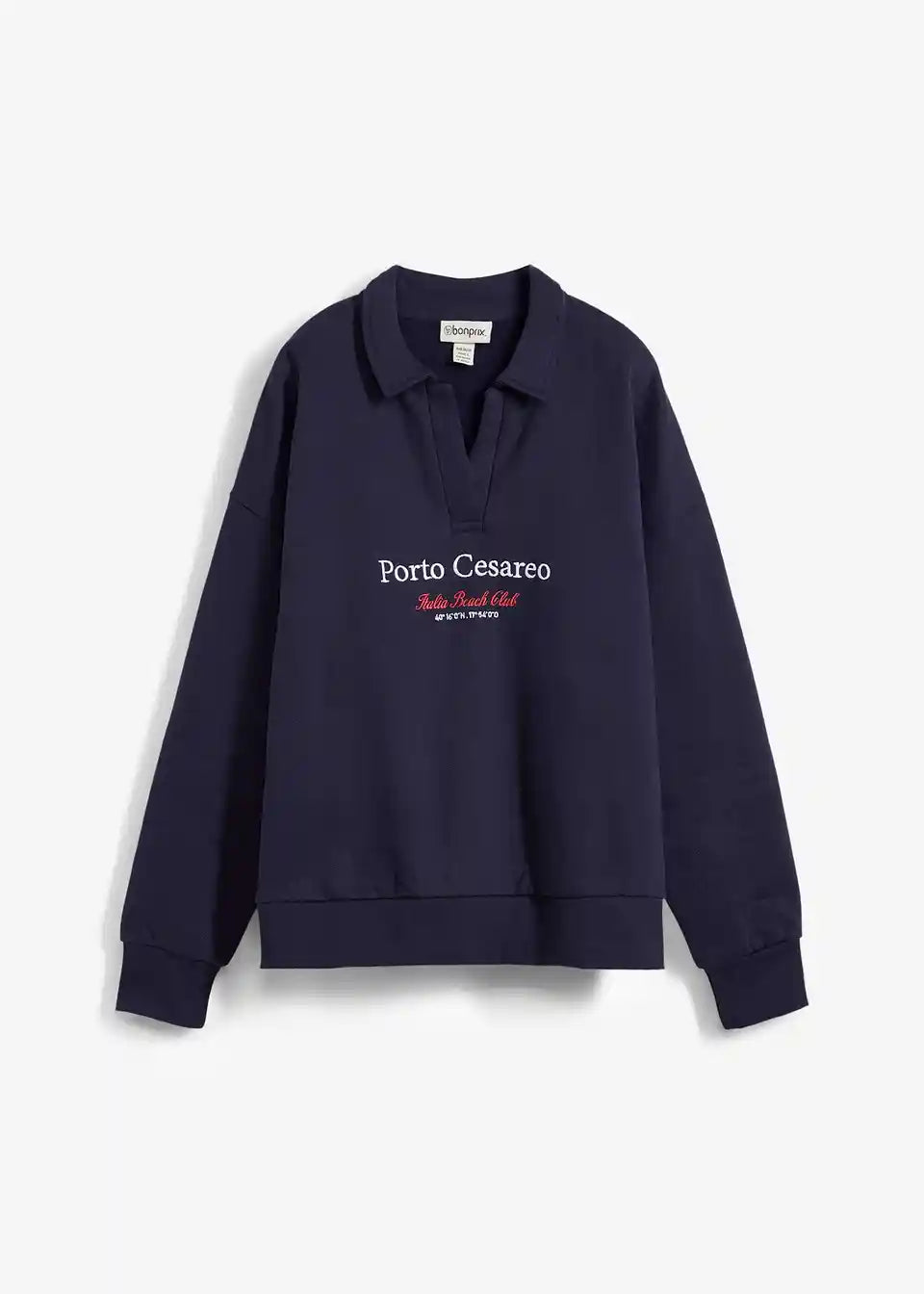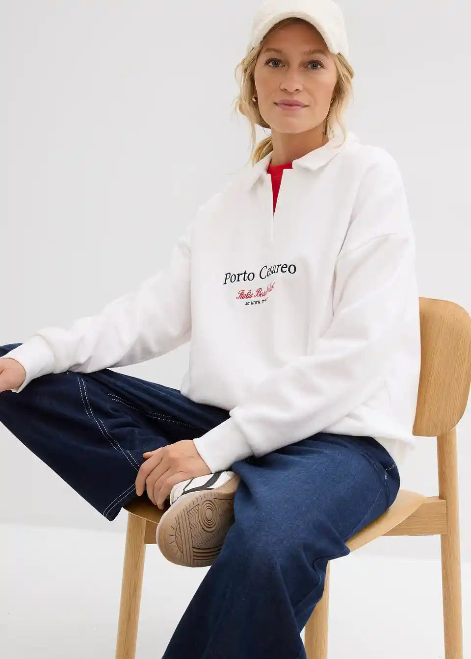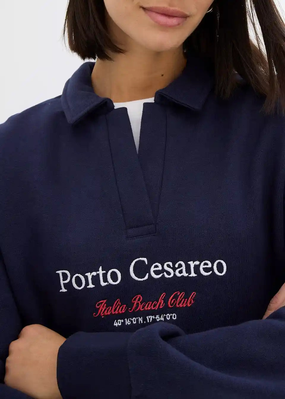 Pulover s polo ovratnikom in vezenino - oversize kroj