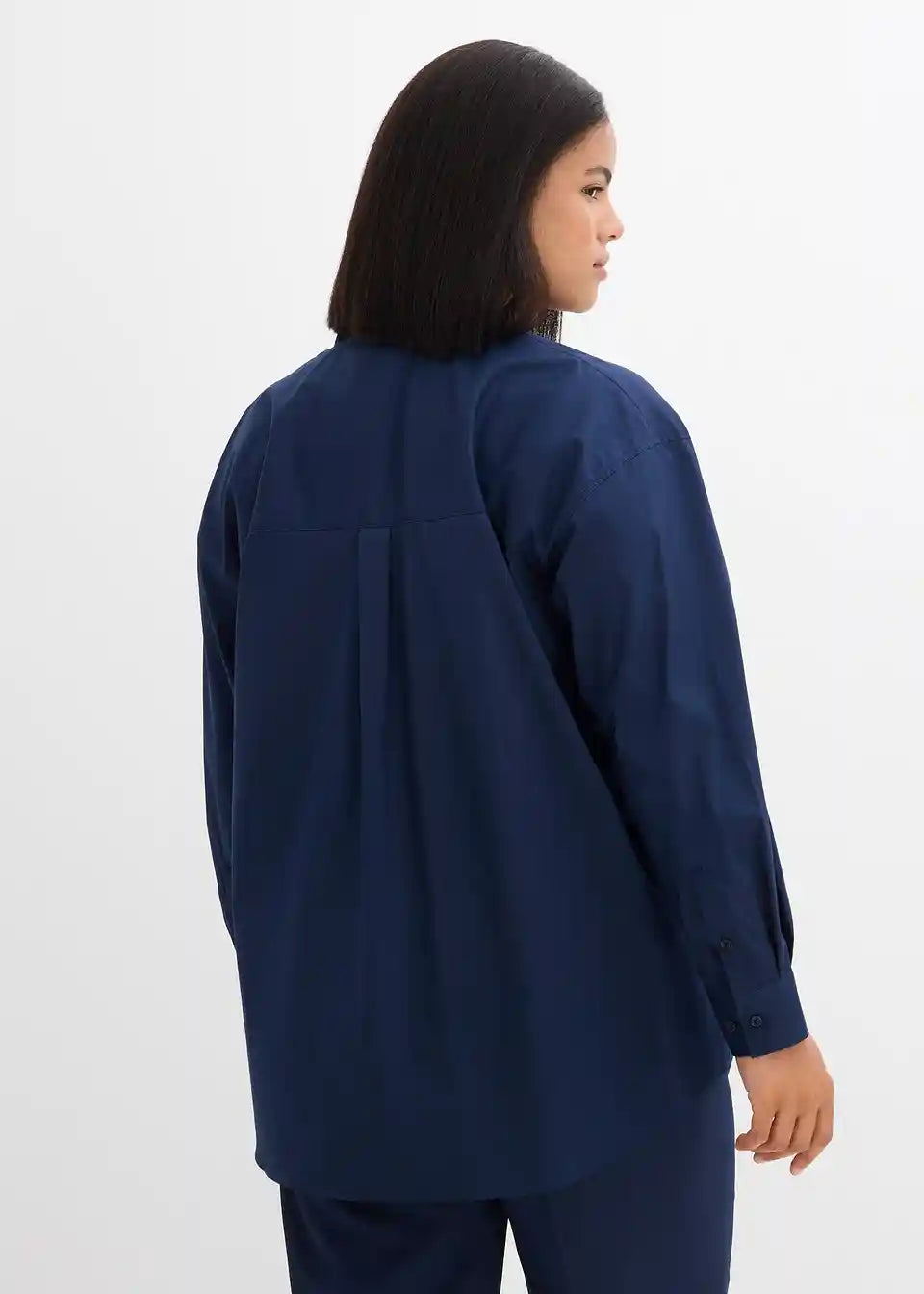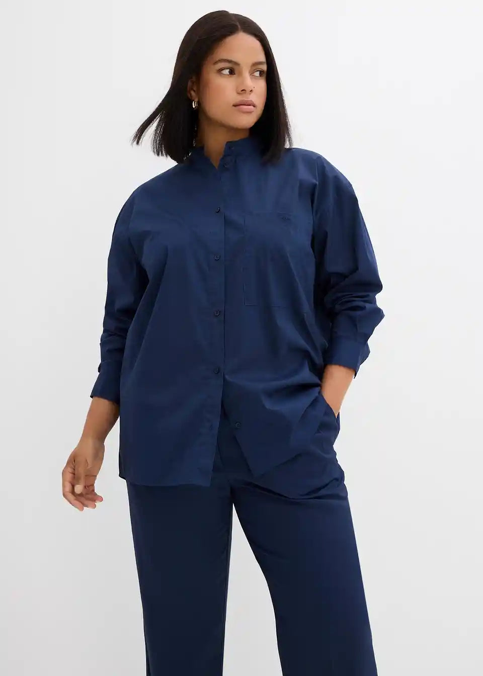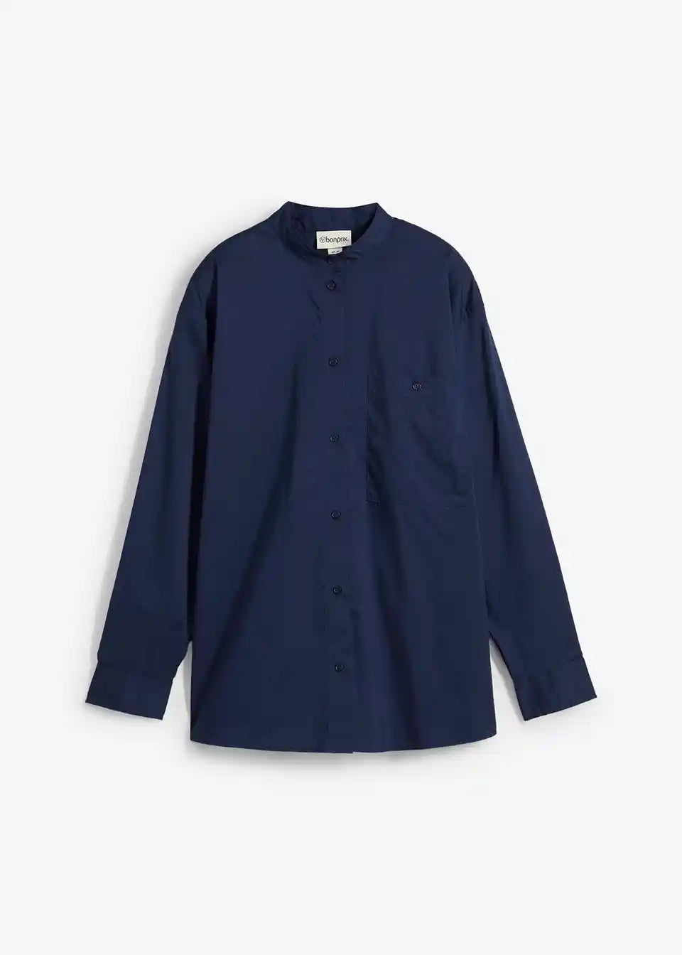 Oversize srajca s stoječim ovratnikom in našitim prsnim žepom. Spredaj z zapenjanjem na gumbe.