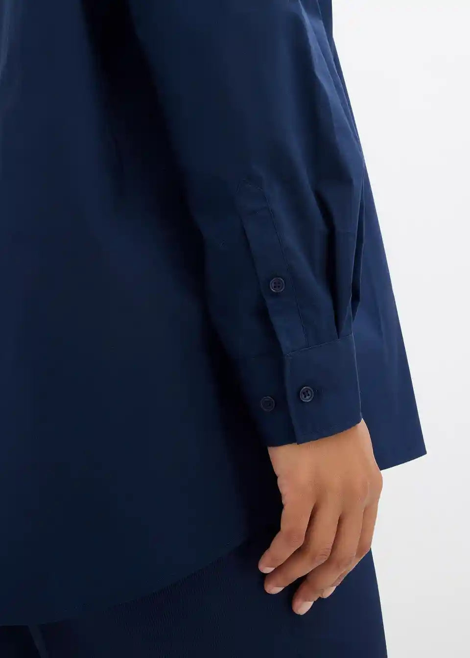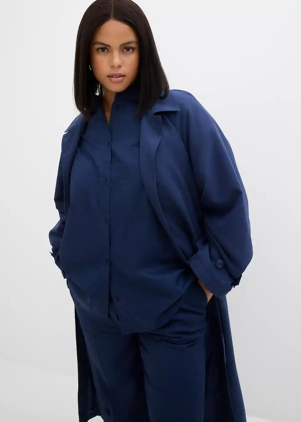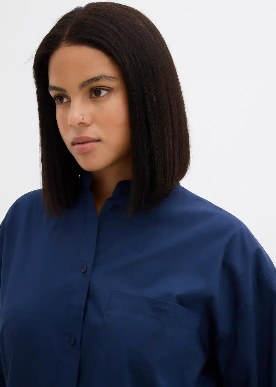 Oversize srajca s stoječim ovratnikom in našitim prsnim žepom. Spredaj z zapenjanjem na gumbe.