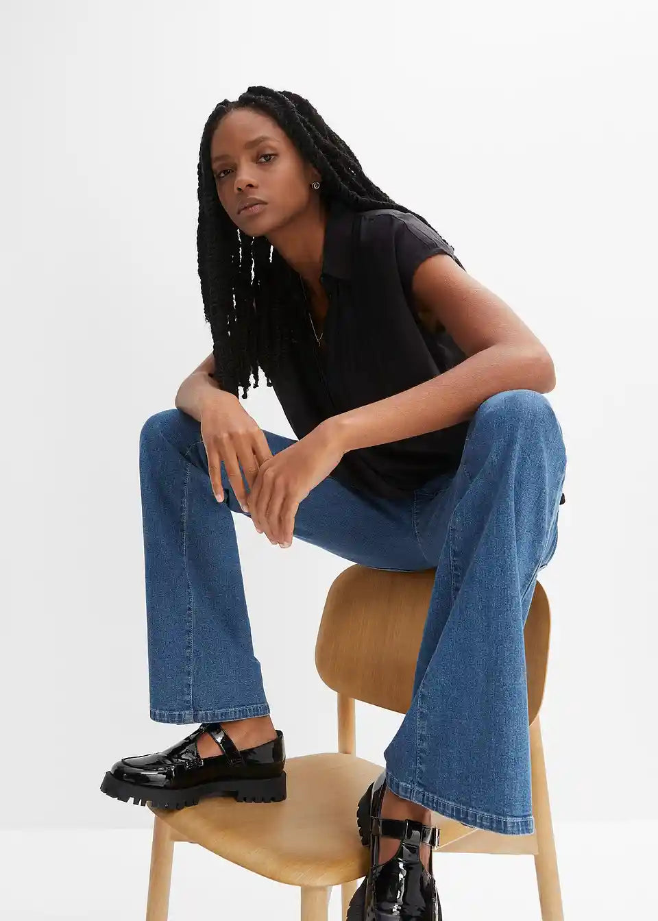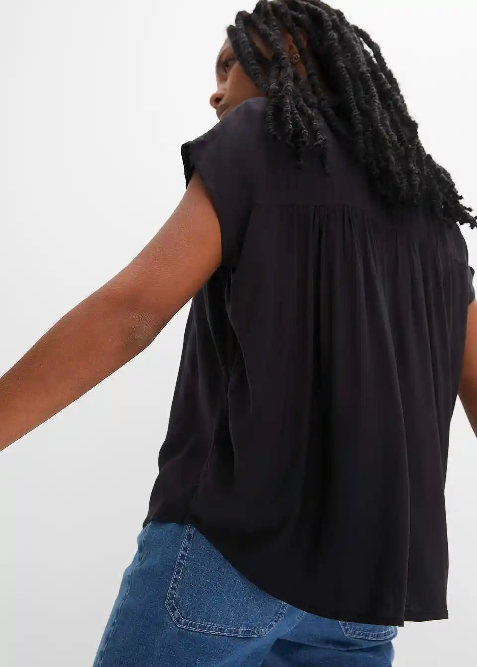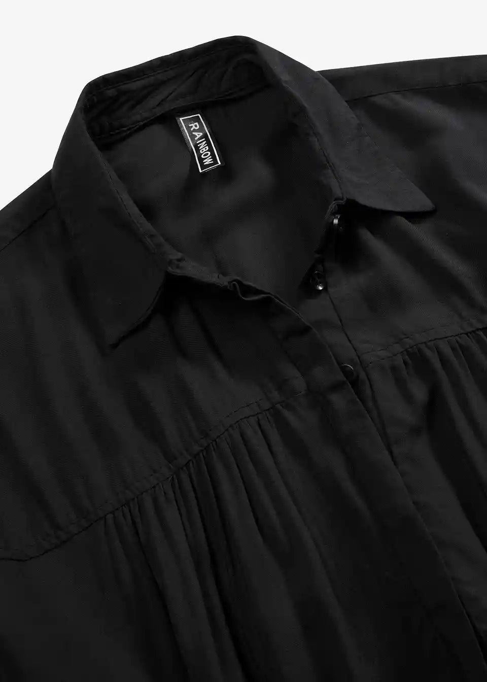 Ta kratko majica z rokavi navdušuje s svojim ravnim krojem in spuščenimi rameni. Srajčni ovratnik se nadaljuje v skrito zapiranje z gumbi. Na višini prsi pade v oči nabrani del šiva, ki daje širino in igriv videz.