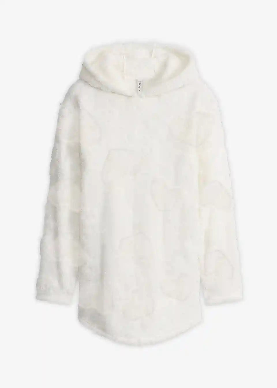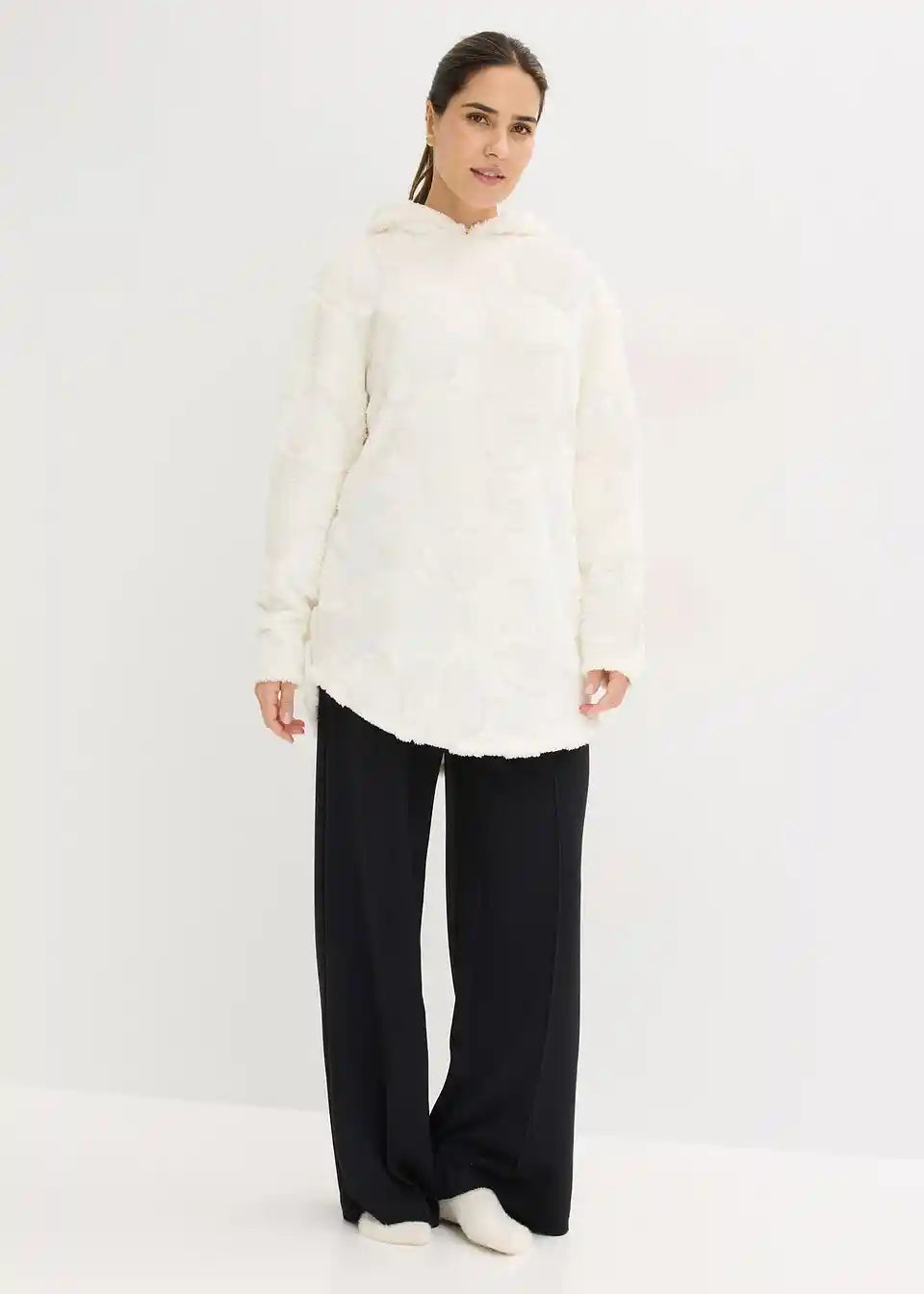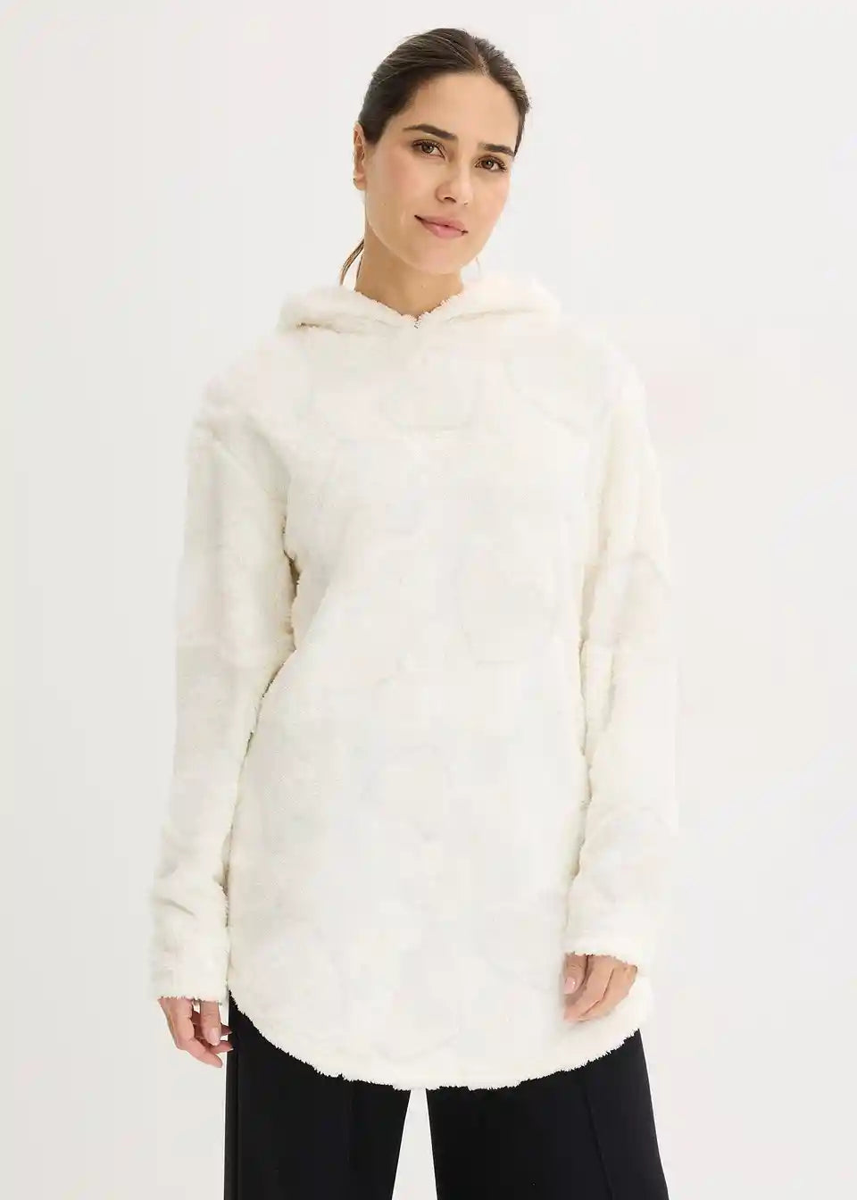 Udoben široko krojen dolg pulover s kapuco in zaokroženim spodnjim robom