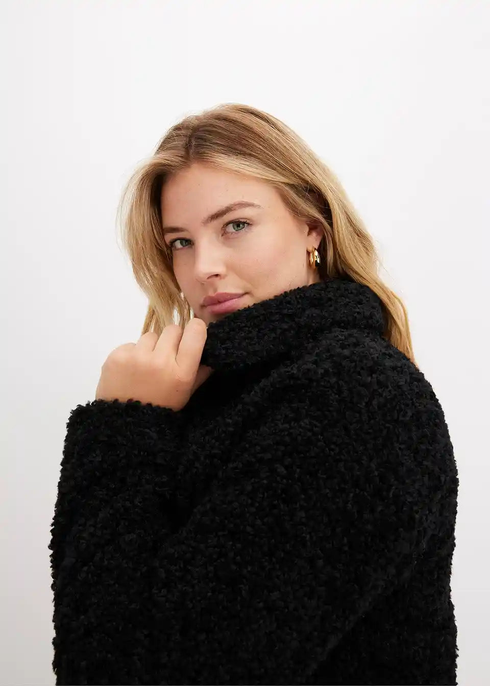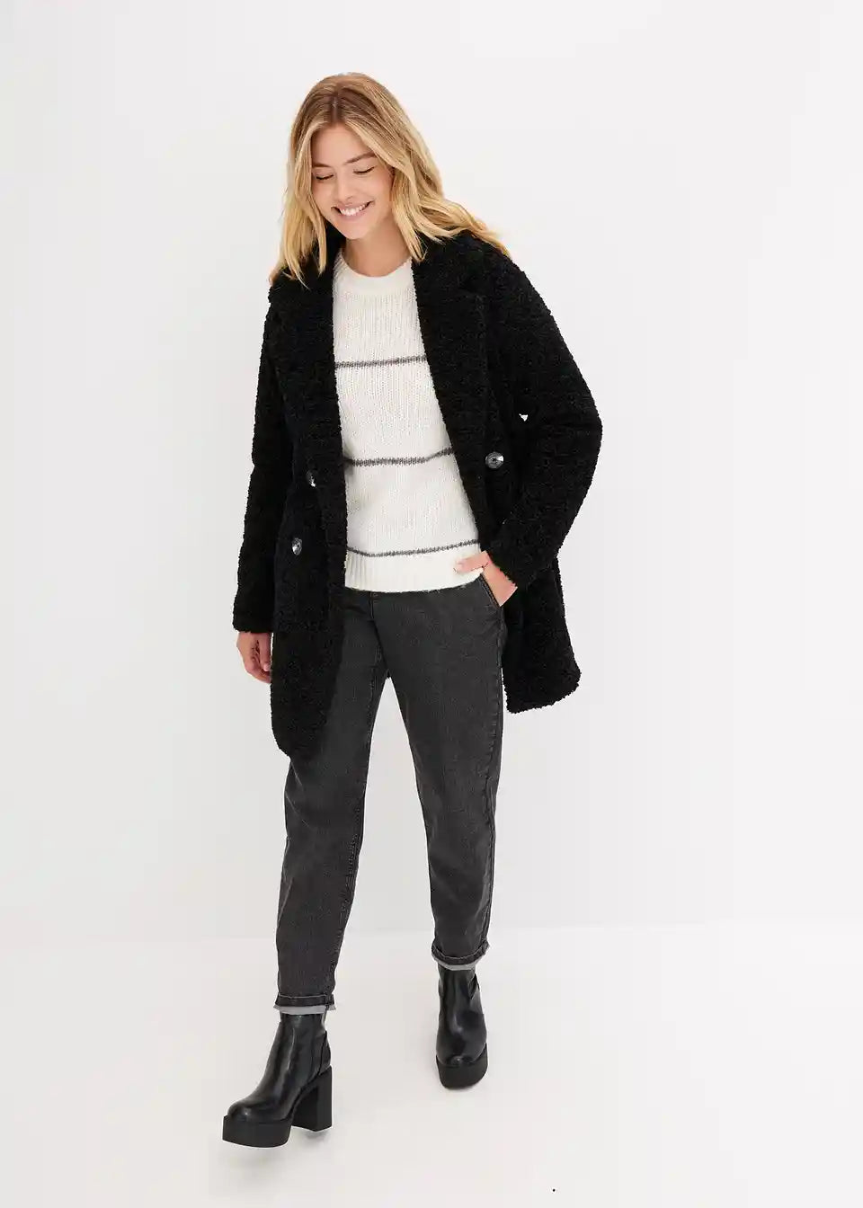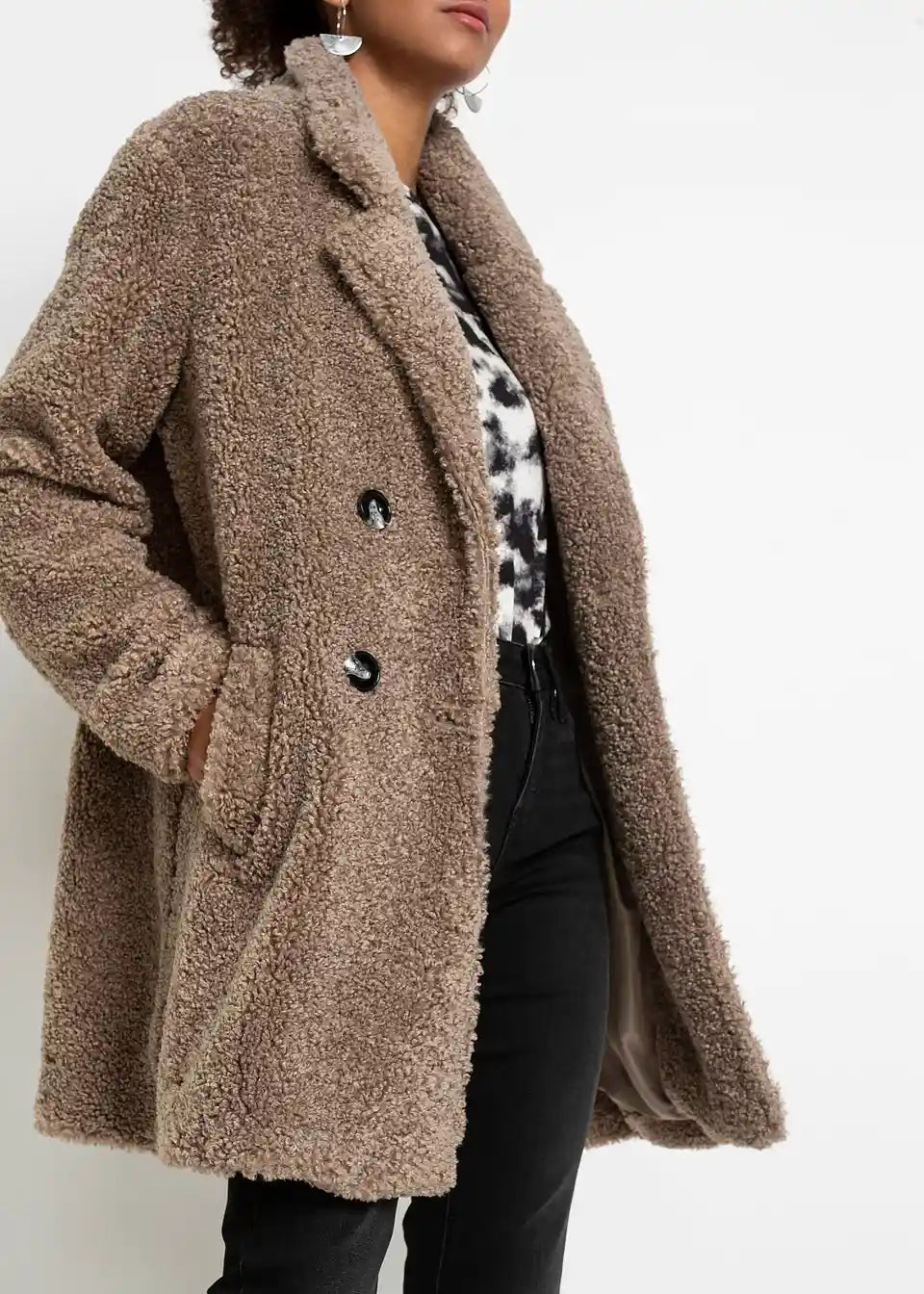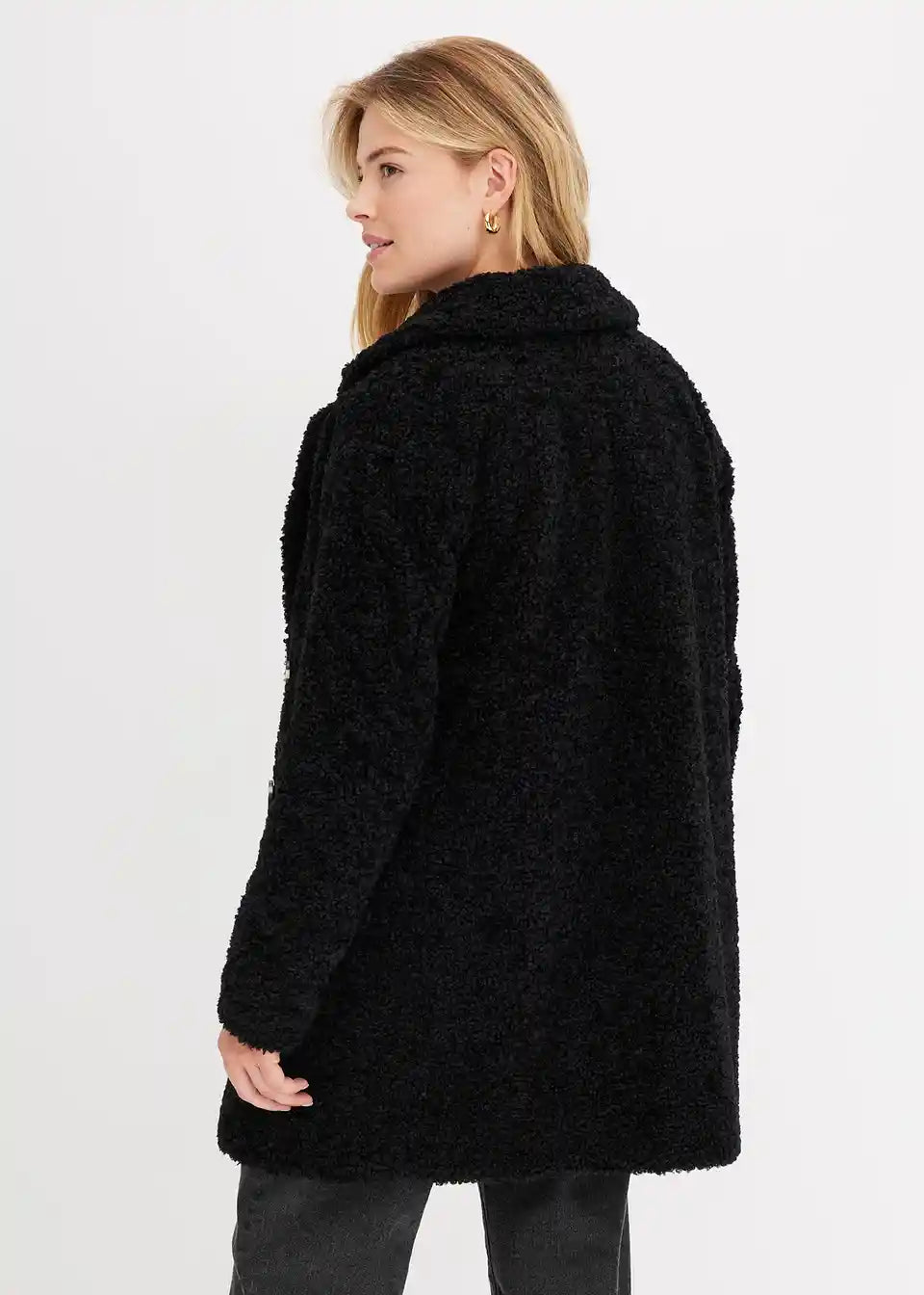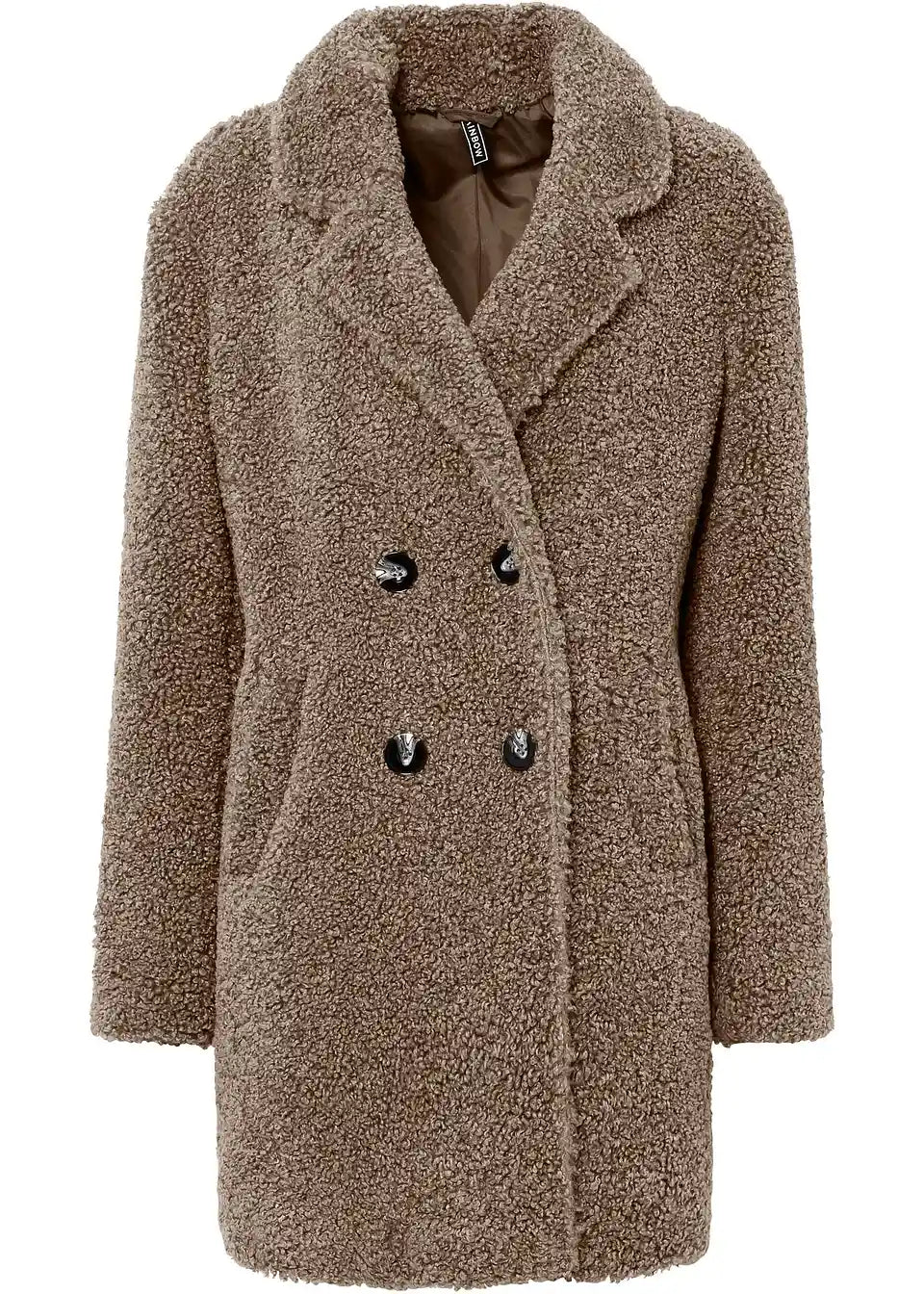 Kratek in prijeten plašč v videzu volne z dvorednim zapenjanjem na gumbe