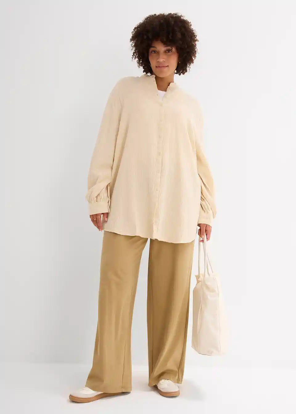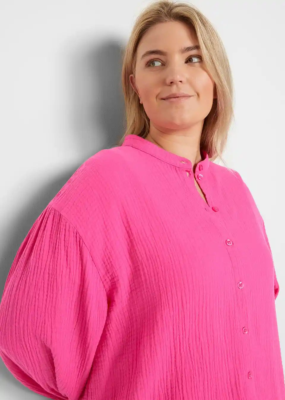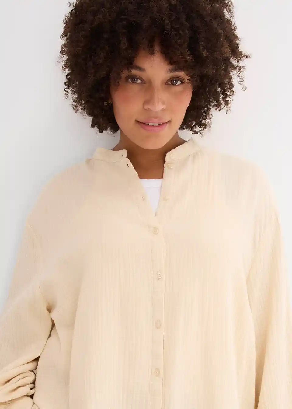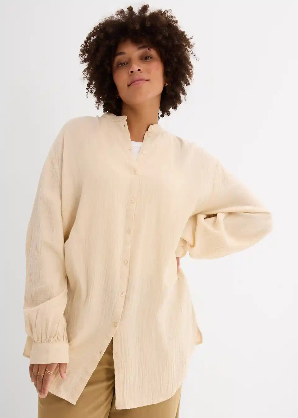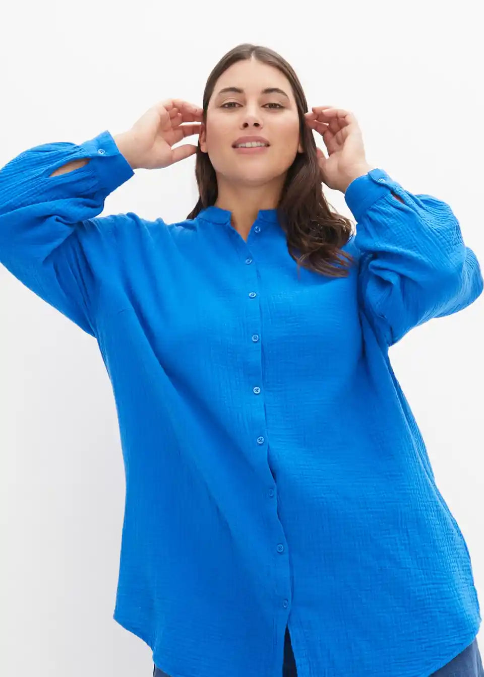 Sproščena Oversized Musselin-bluza s stranskimi razporki in zapenjanjem na gumbe