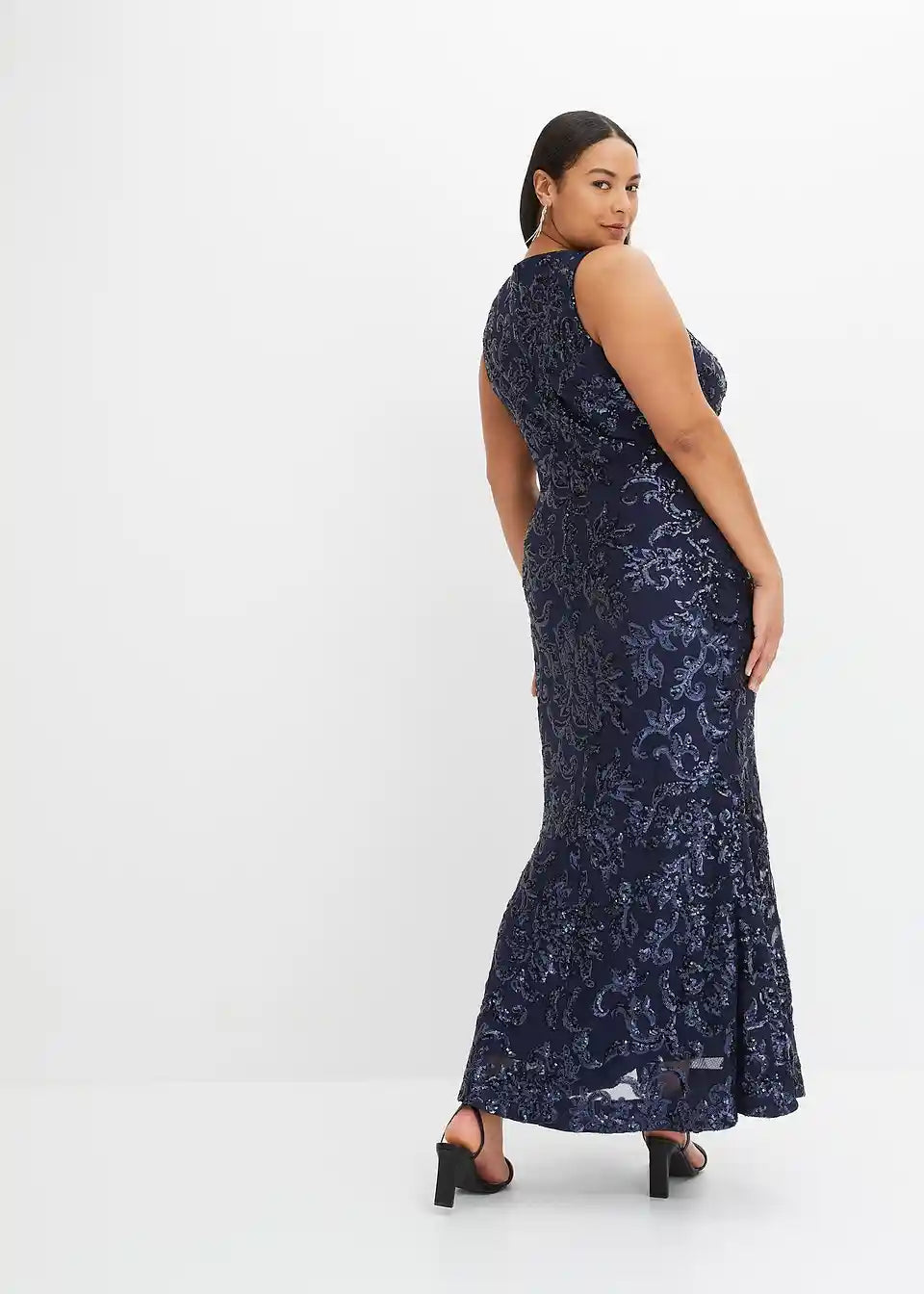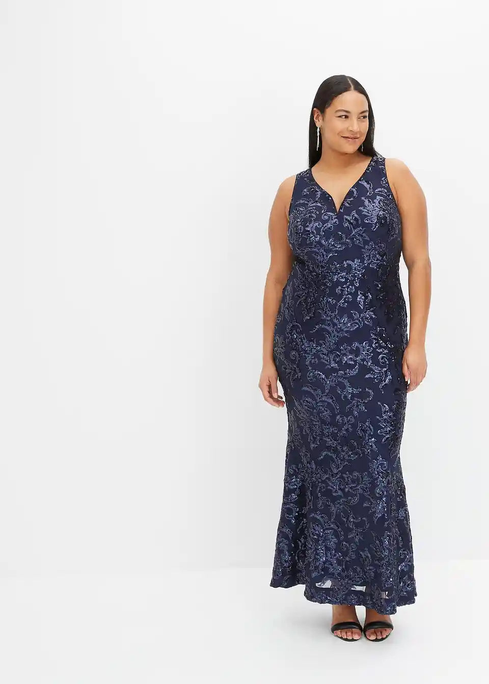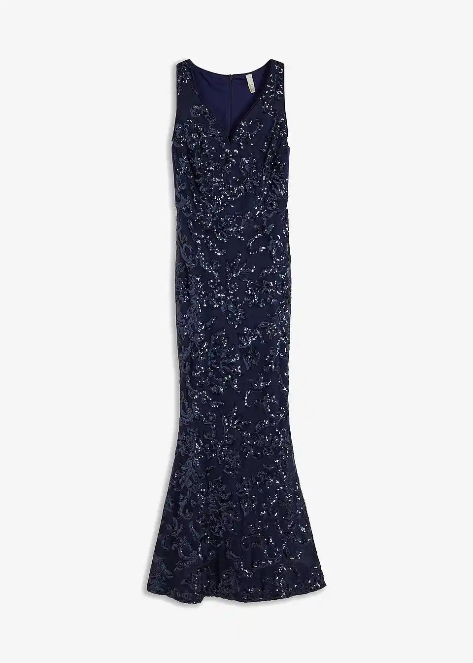 Ekstravagantna večerna obleka v obliki morske deklice z vzorčastimi bleščicami in globokim izrezom