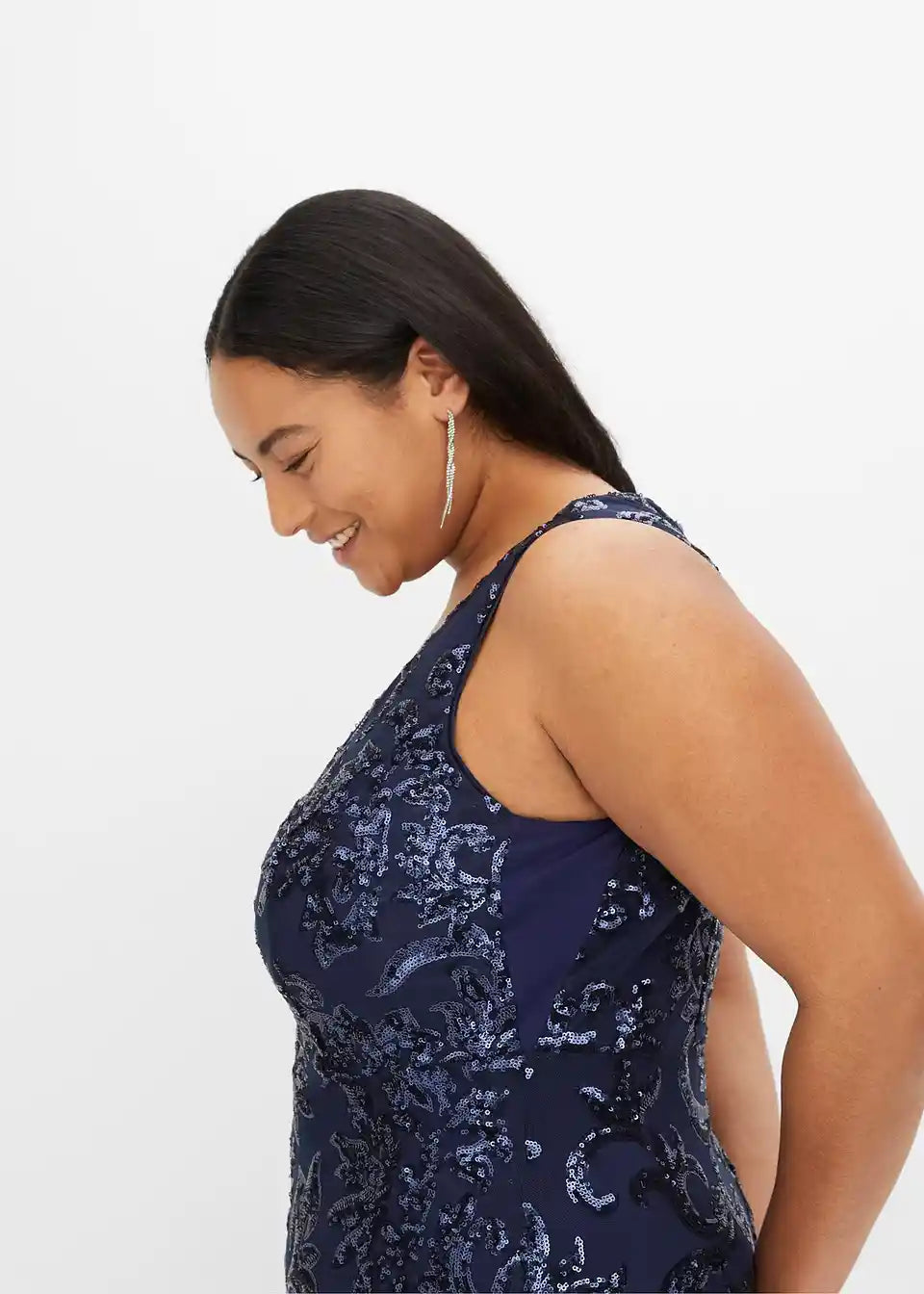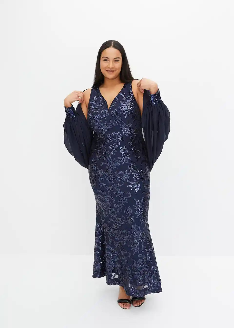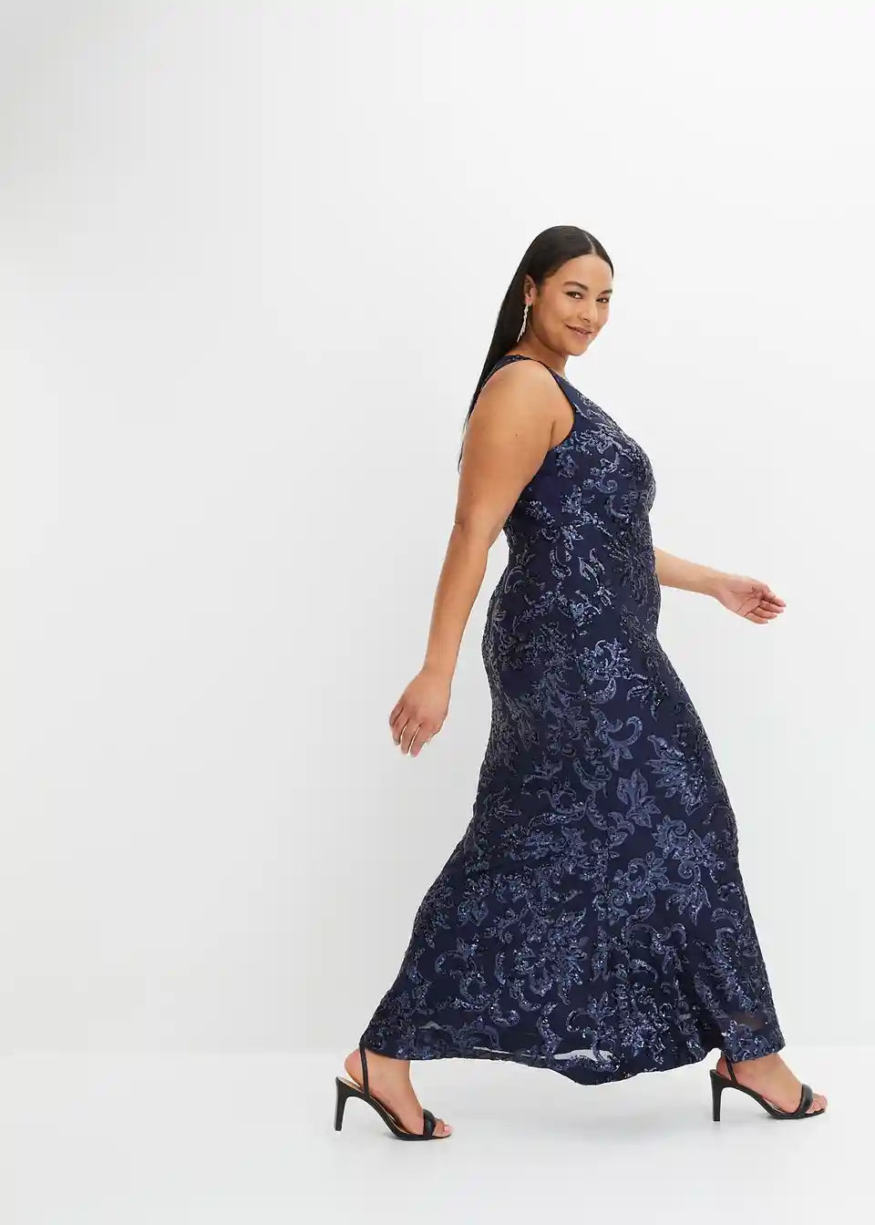 Ekstravagantna večerna obleka v obliki morske deklice z vzorčastimi bleščicami in globokim izrezom