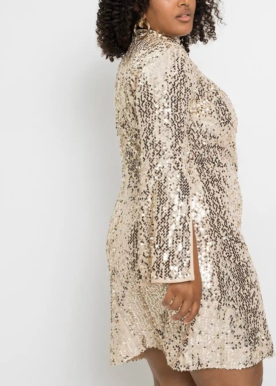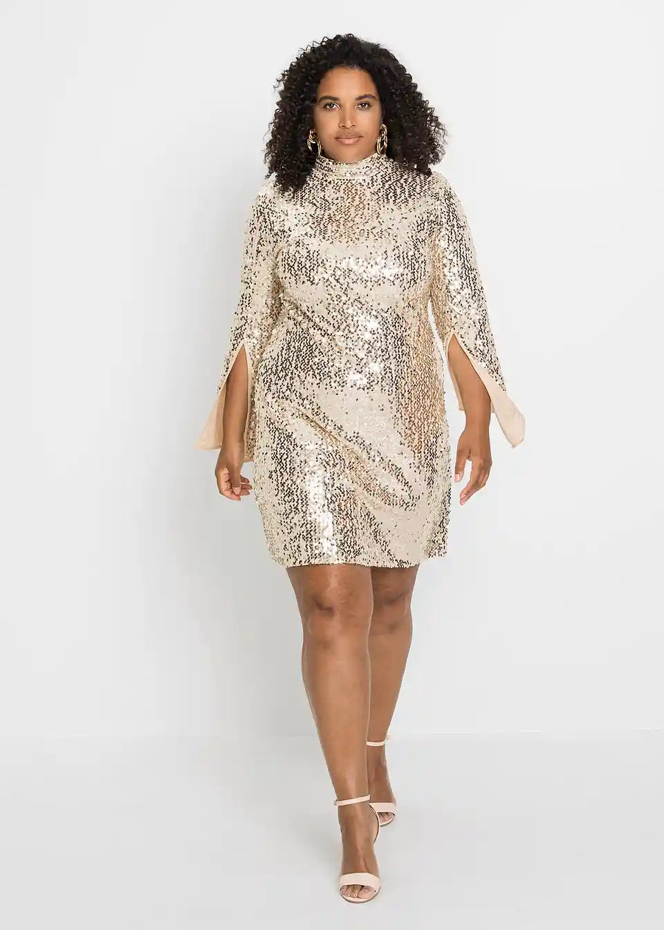 Obleka z bleščicami in trobentastimi rokavi