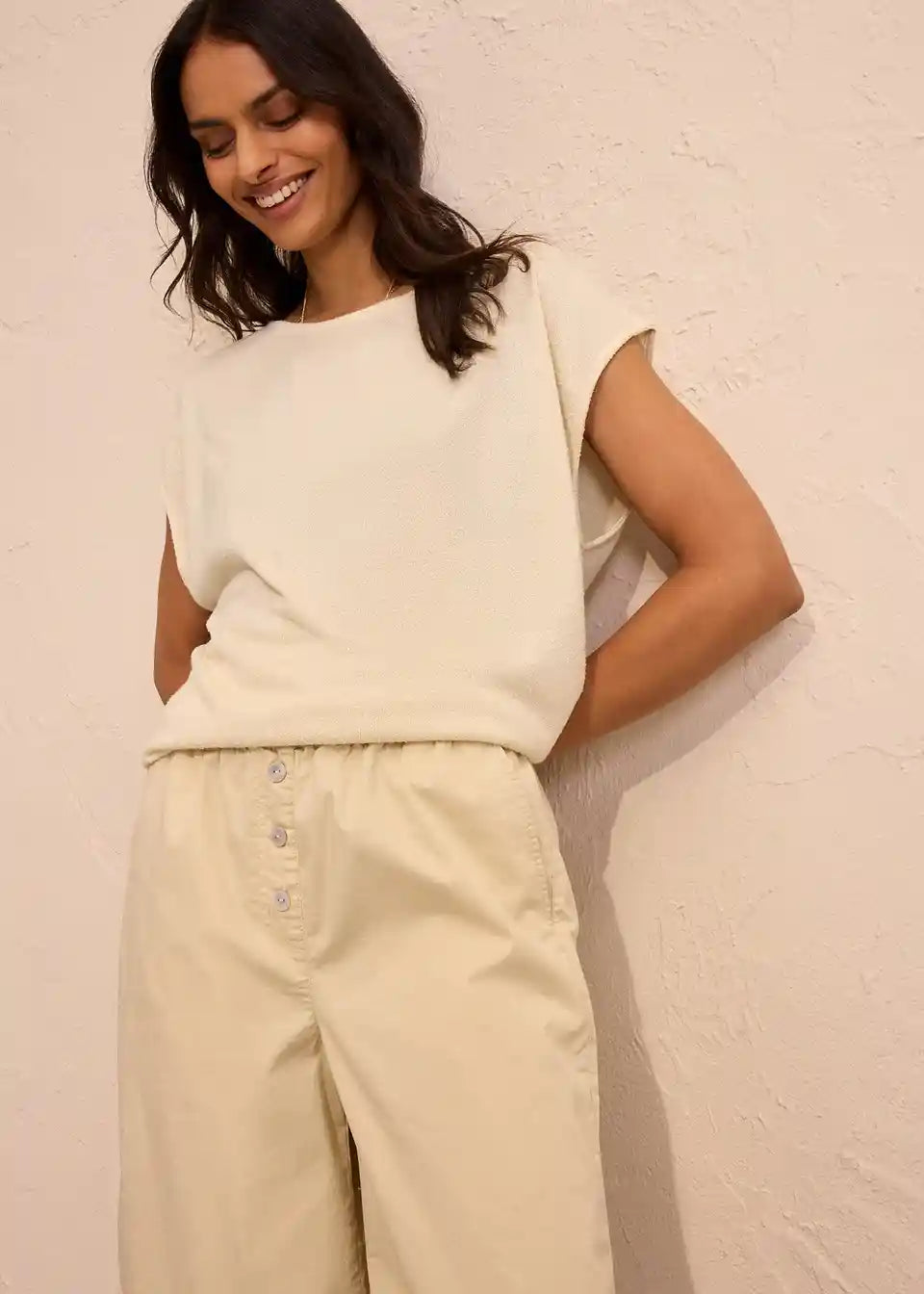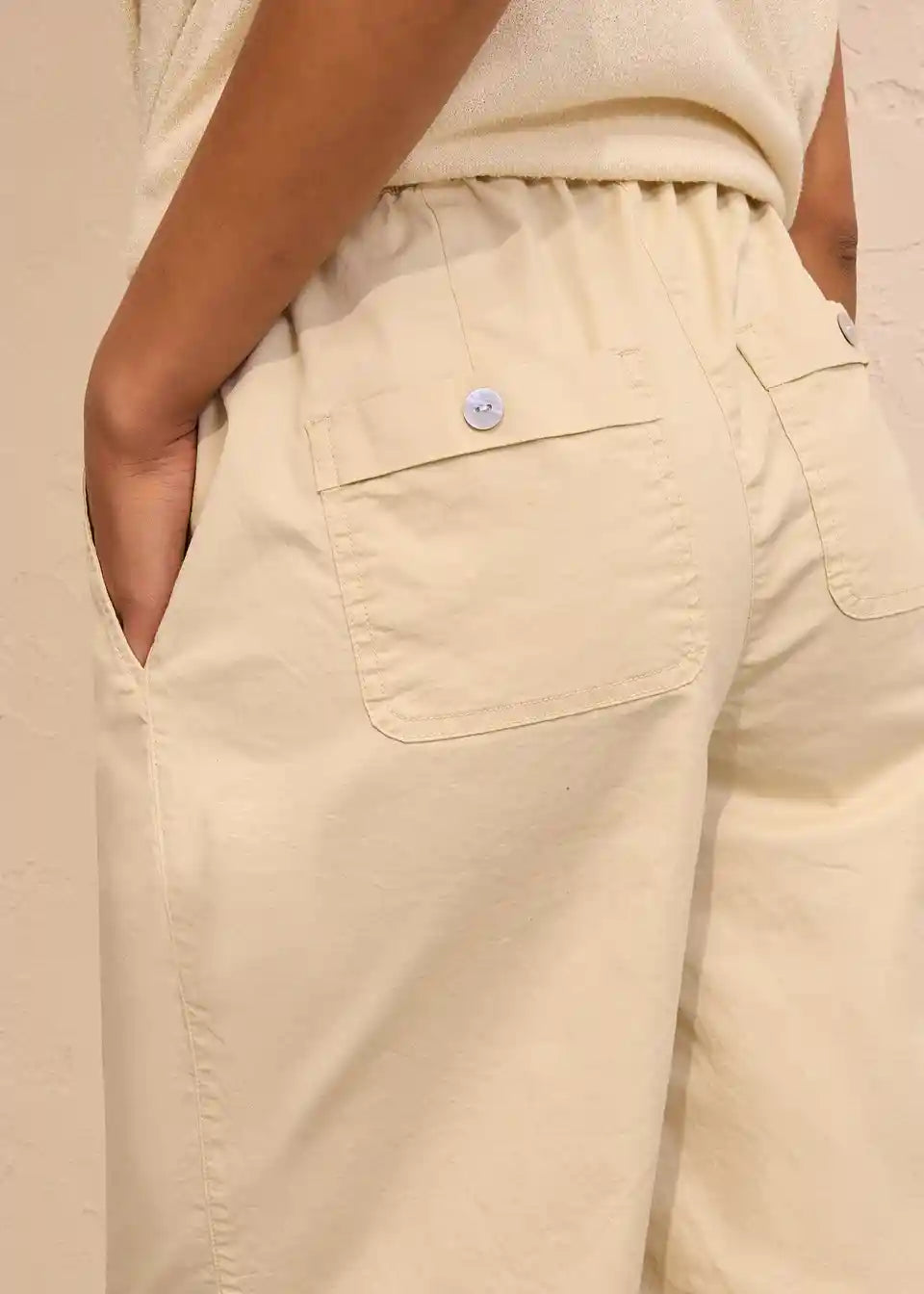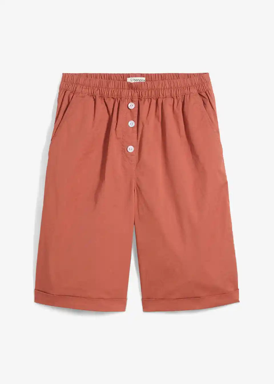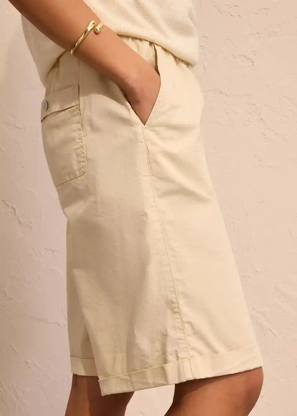 Bermuda z visokim, elastičnim pasom in stranskimi žepi.