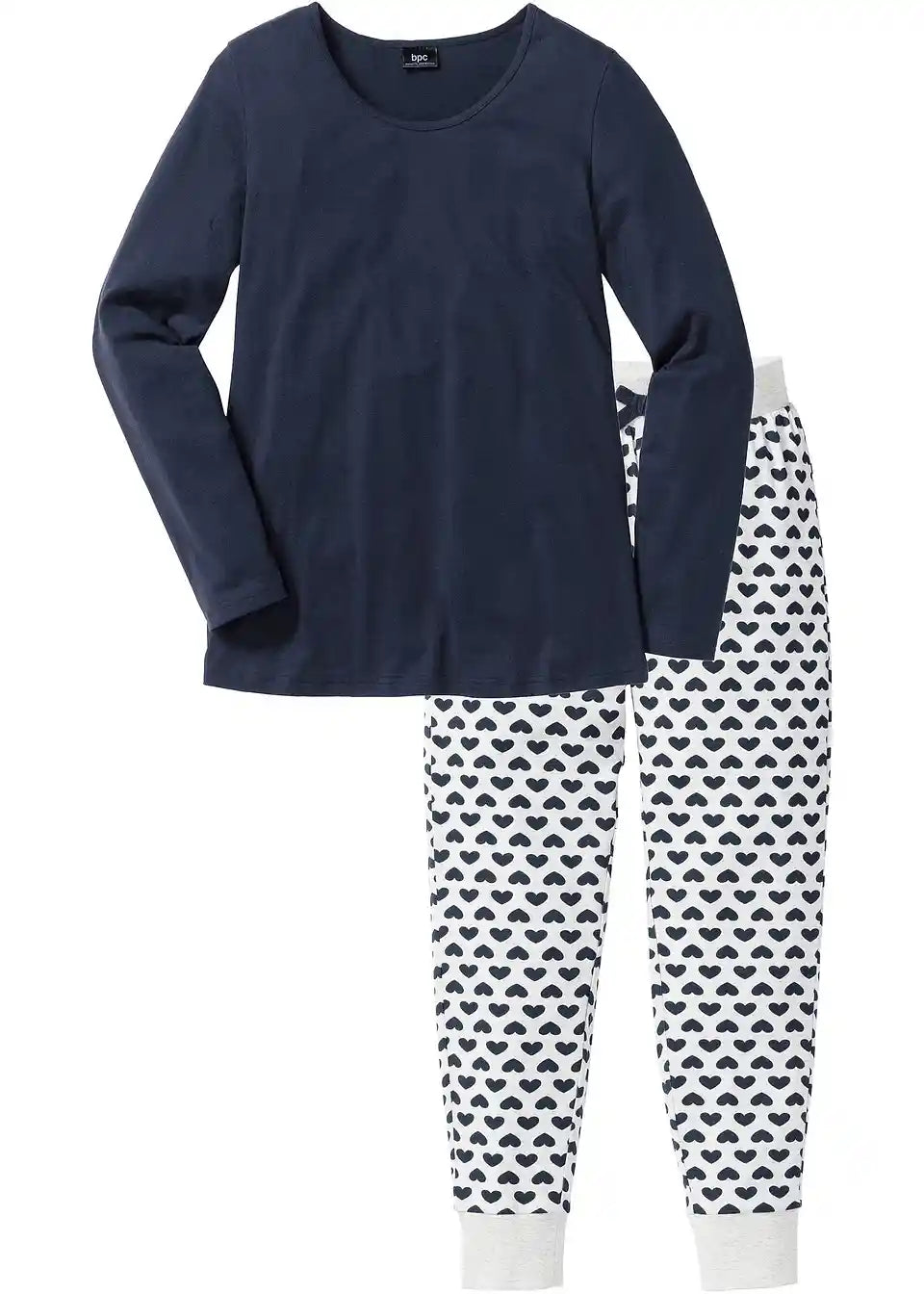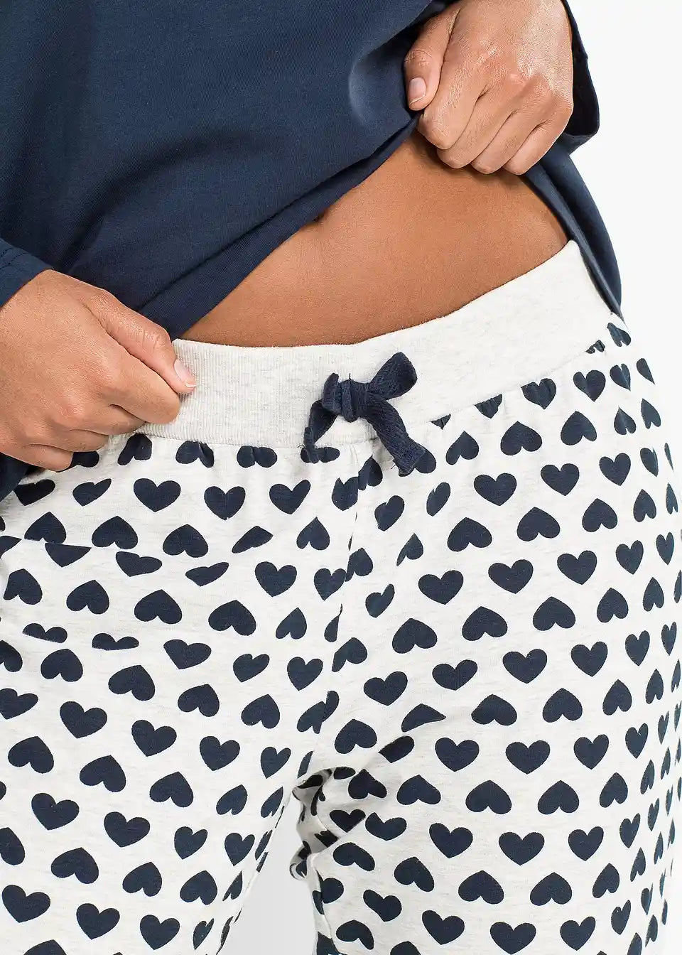 Mehka in prijetna za nošenje je pižama iz trajnostnega bombaža v trendovski zasnovi. Zgornji del z dolgimi rokavi in okroglim izrezom se s svojo sproščeno krojno obliko lepo prilega. Hlače z ozkim krojem izstopajo z udobnim pasom na bokih, ki je okrašen s simpatično pentljo. Elastični široki rebrasti robovi na hlačnicah dajejo pajkicam rahlo športen videz.