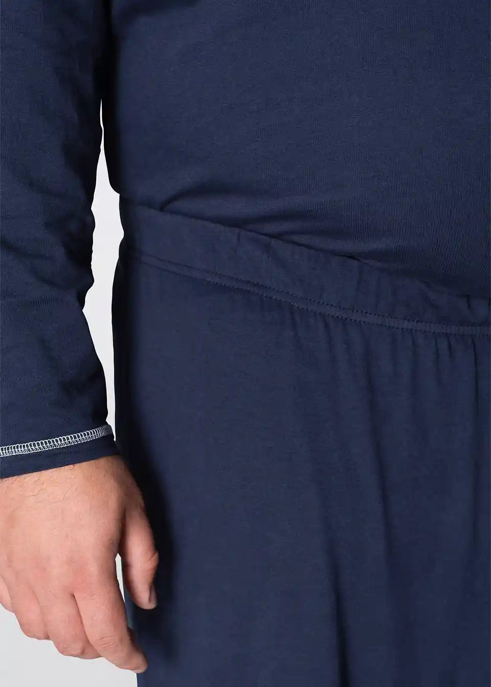 Ta moška pižama je na voljo kot dvodelni komplet. Komplet sestavlja udobni zgornji del z dolgimi rokavi in ustrezne pižama hlače z dolgimi hlačnicami.