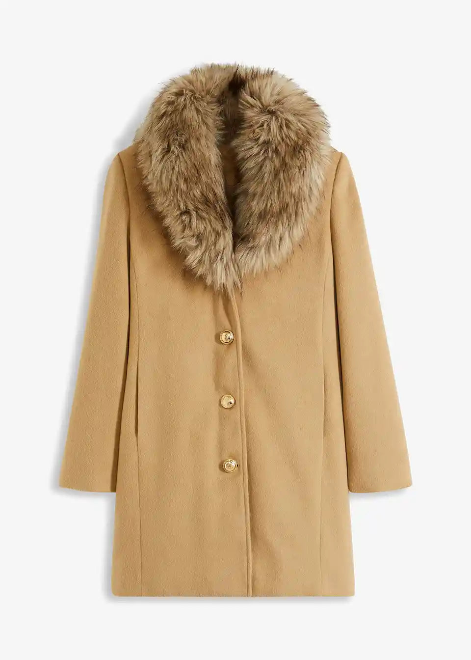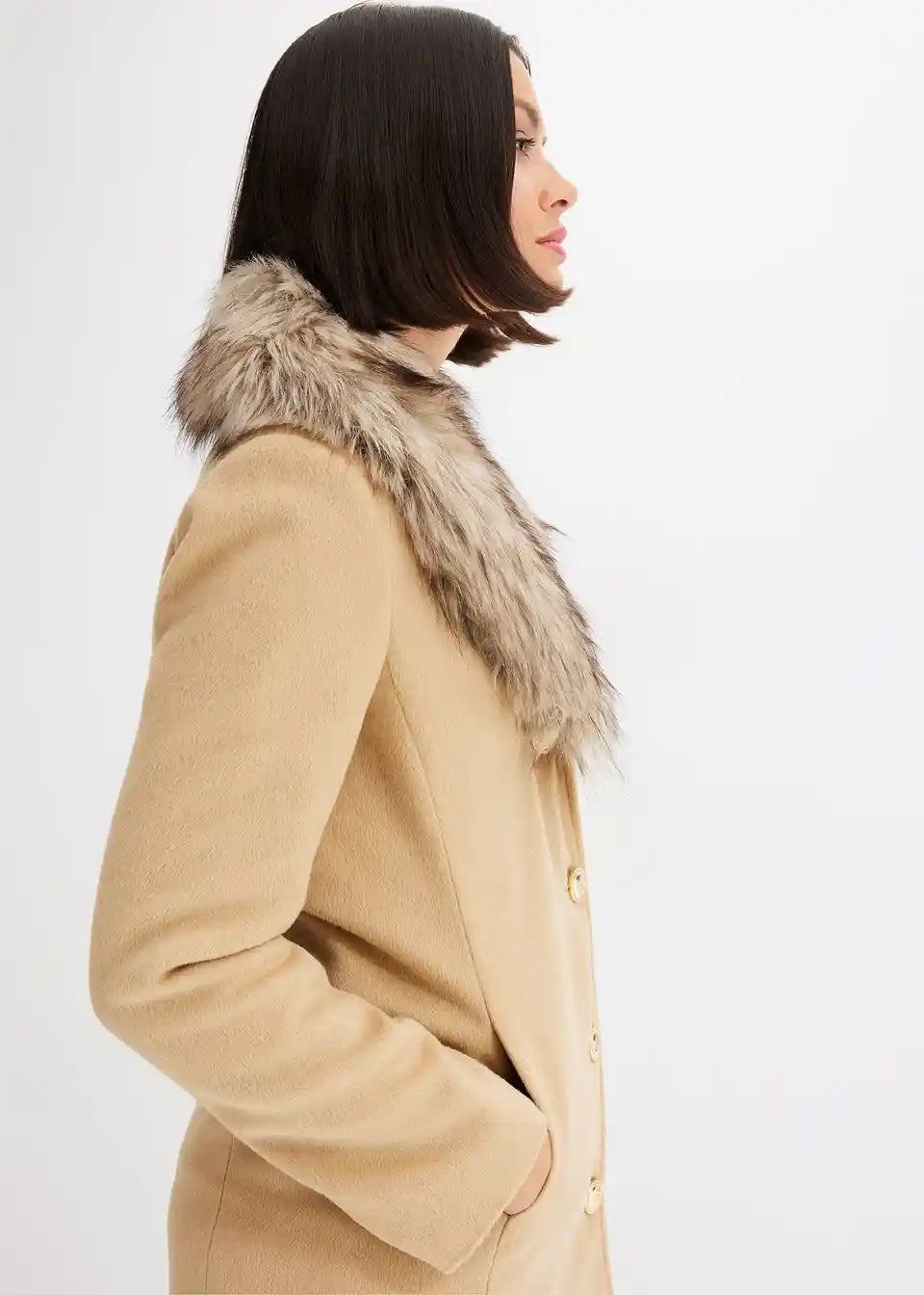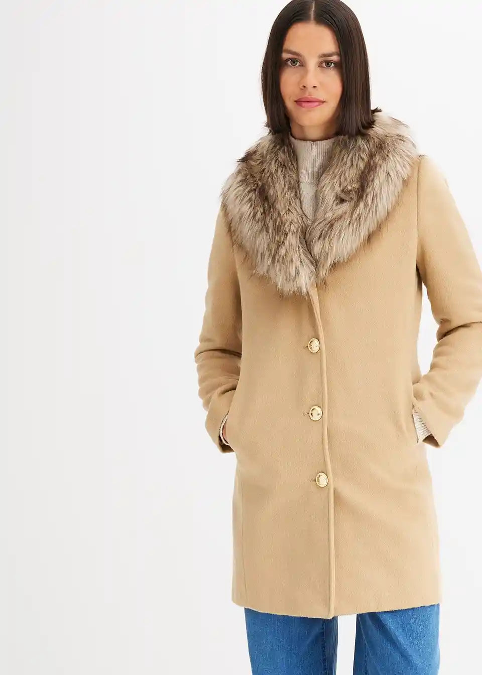 ženstven plašč z odstranljivim ovratnikom iz umetnega krzna in dekorativnimi gumbi spredaj