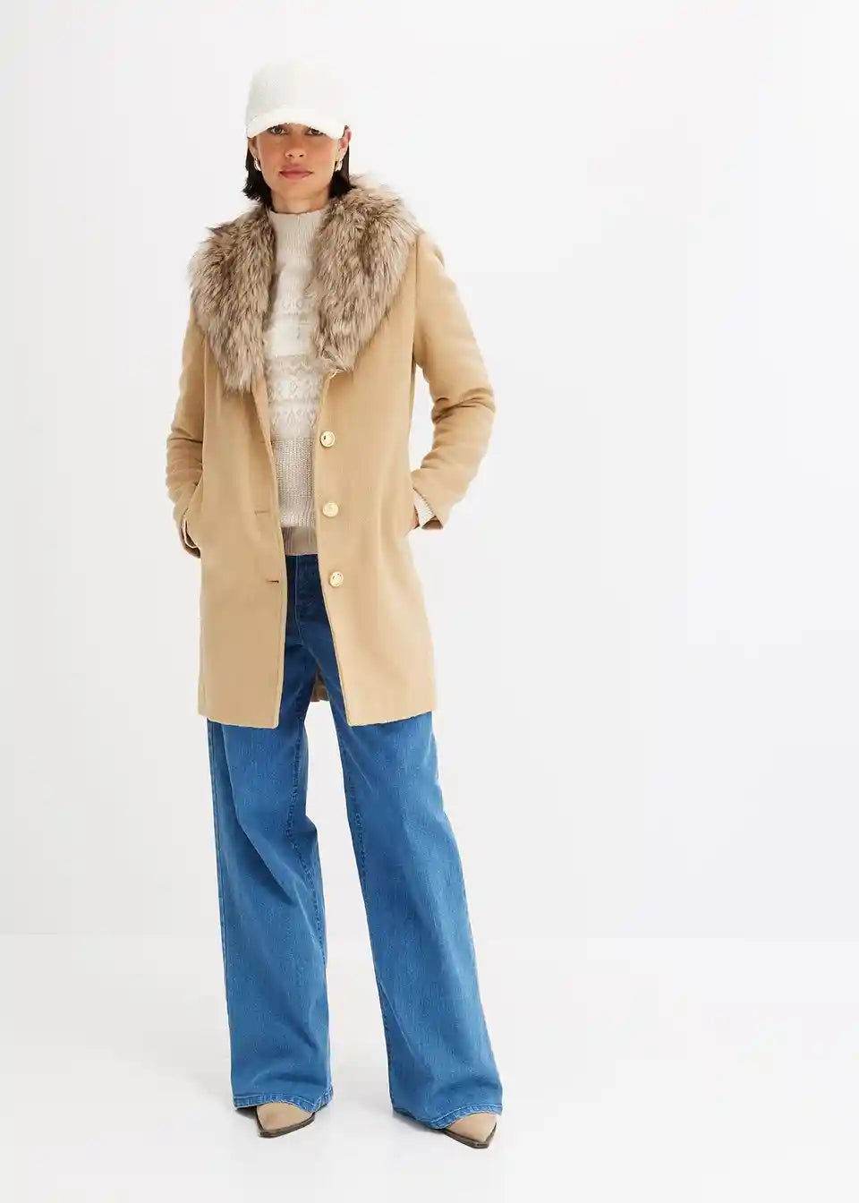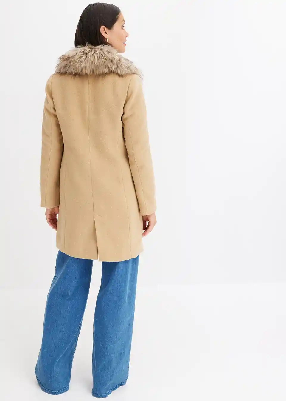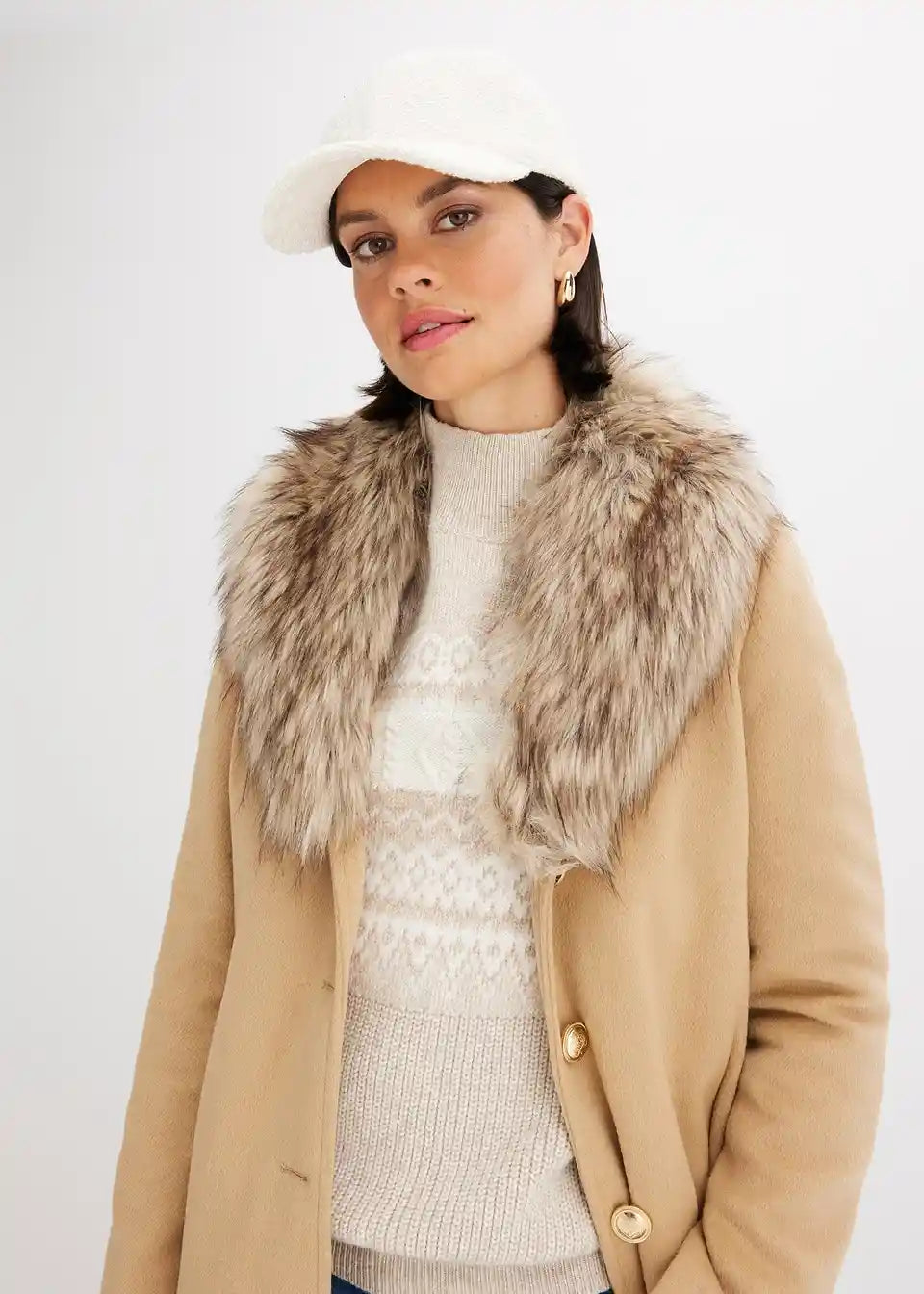 ženstven plašč z odstranljivim ovratnikom iz umetnega krzna in dekorativnimi gumbi spredaj