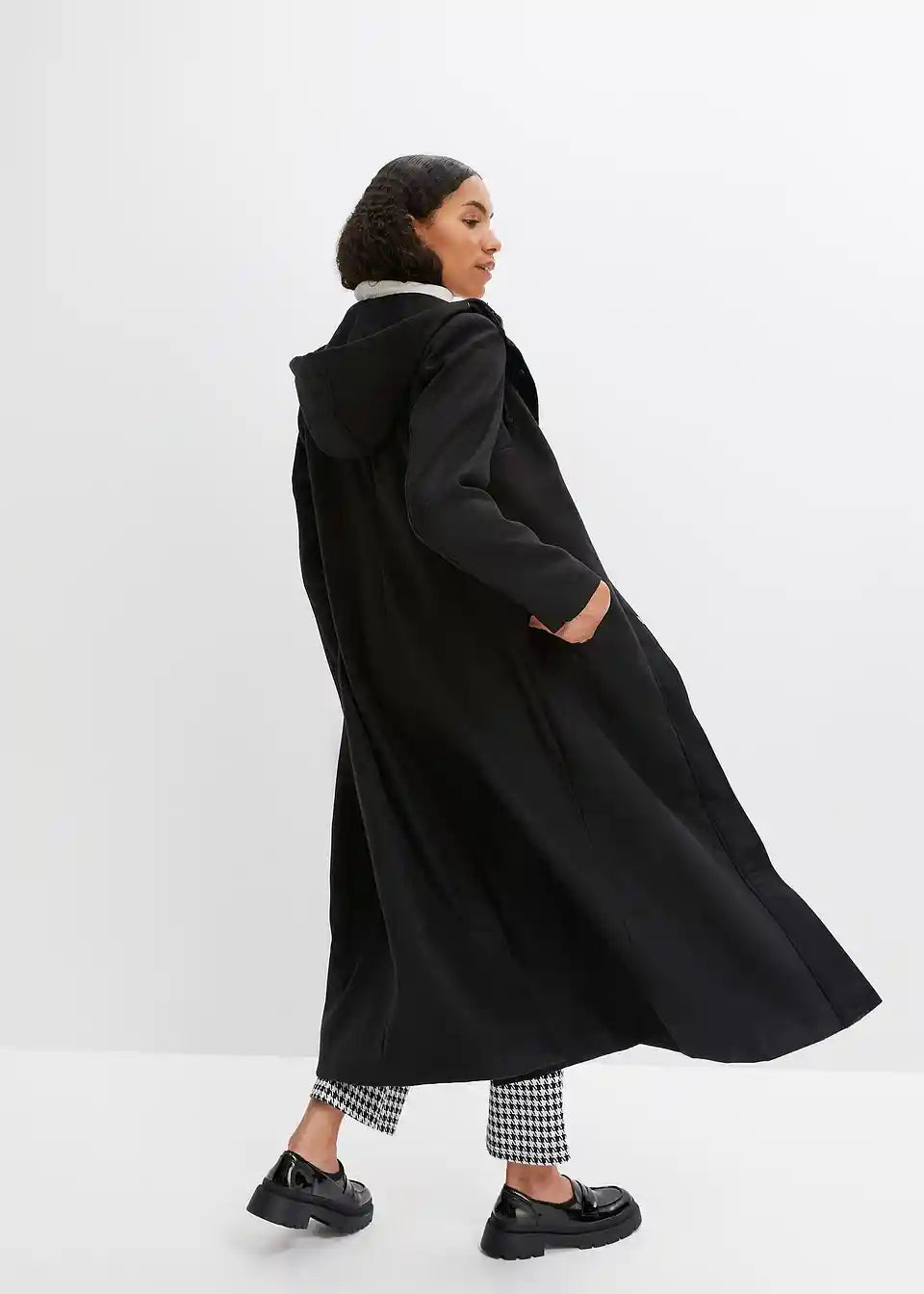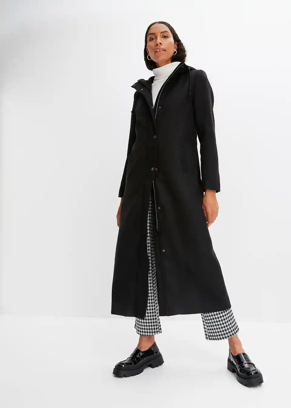 Ležerni dolg plašč v videzu volne s kapuco in vrvico, stranski žepi