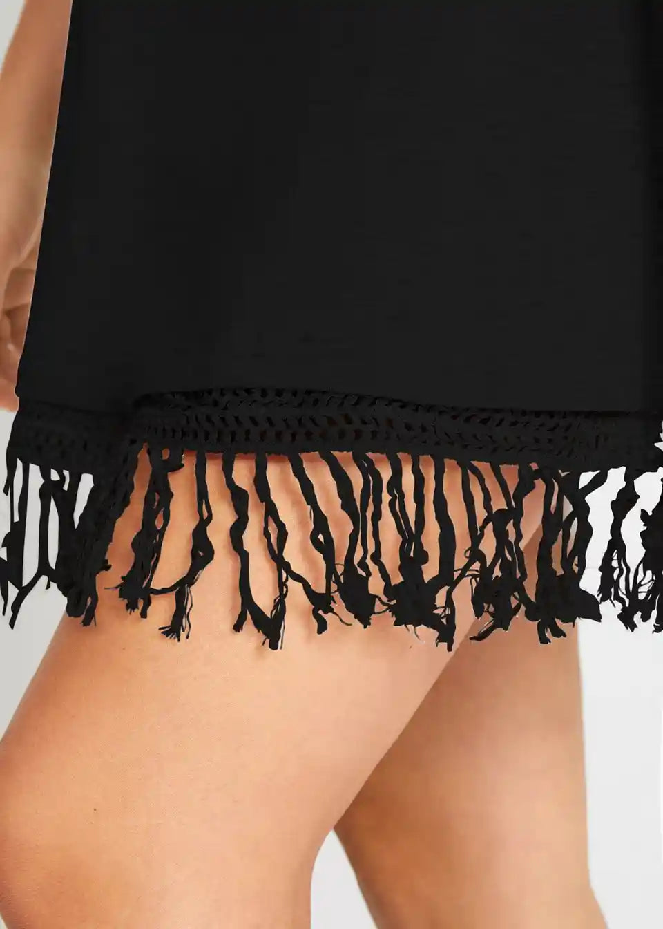 Lahka prosojna obleka za na plažo s kvačkanim okrasjem in resicami
