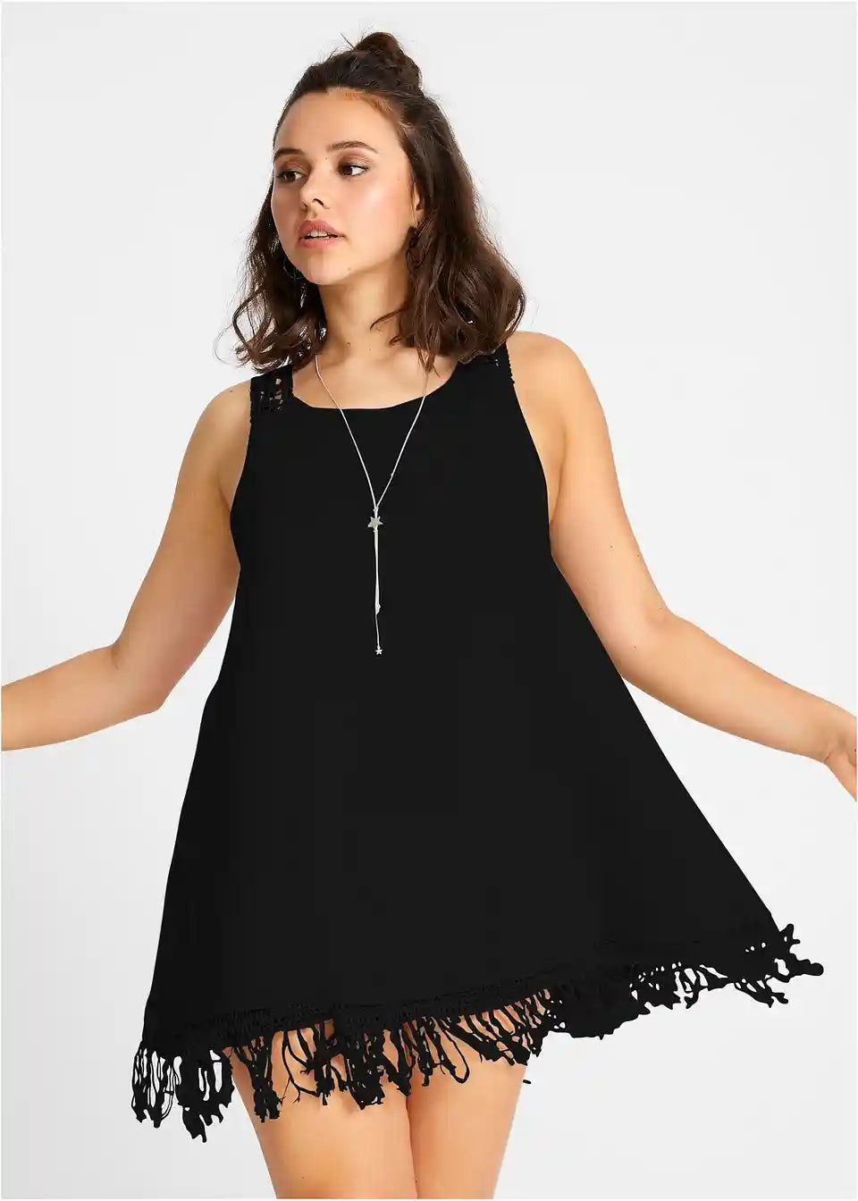 Izstopajoč videz z okrasjem iz čipk, resicami in obrobami naredi modno obleko za plažo poseben privlačen kos. Sproščen kroj brez rokavov v modni A-liniji daje modelu iz prijetno mehke, rahlo prosojne jerseyo kakovosti trendovski videz. Za čudovit poudarek poskrbita rob z obrobo iz luknjičastega vzorca in kul zaključek z resicami. Okrasni detajl kratke obleke z okroglim izrezom je hrbtni del, v celoti izdelan iz fine kvačkane čipke.