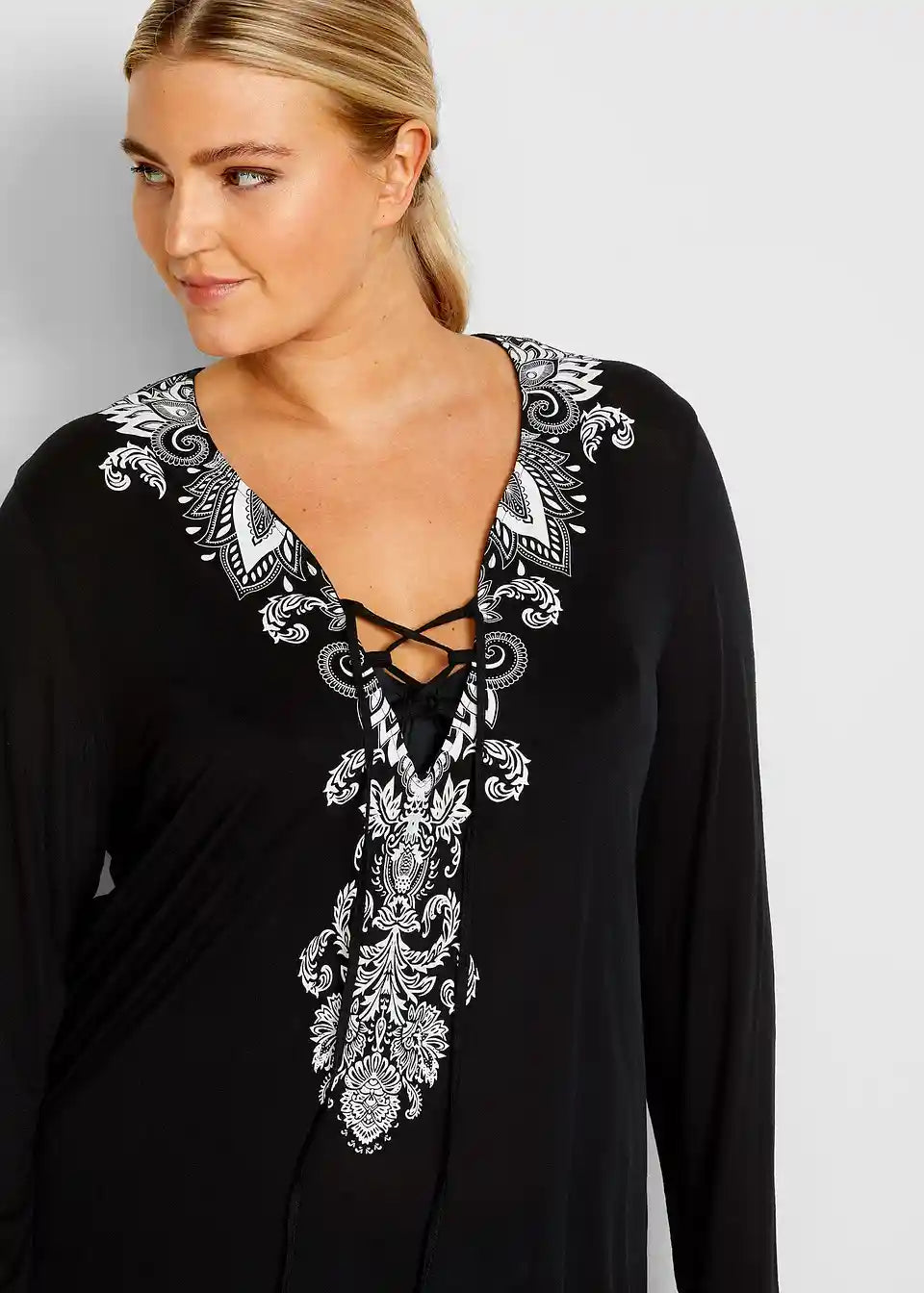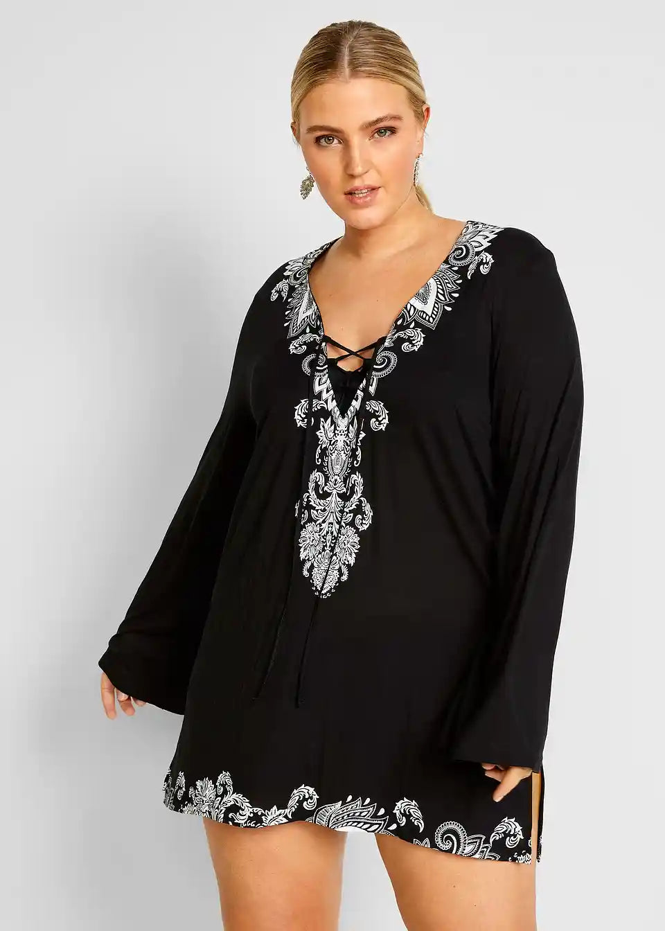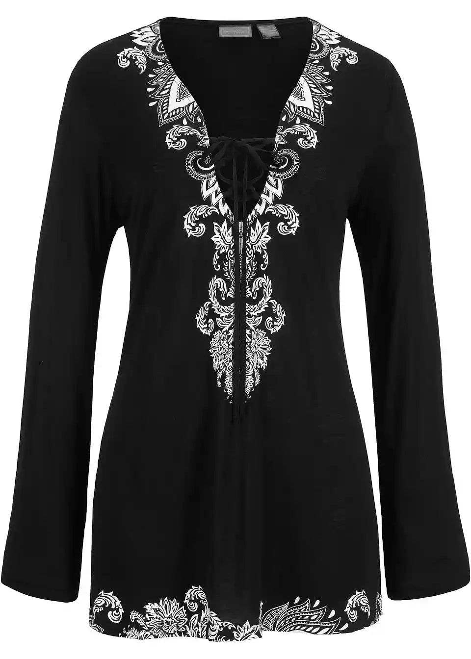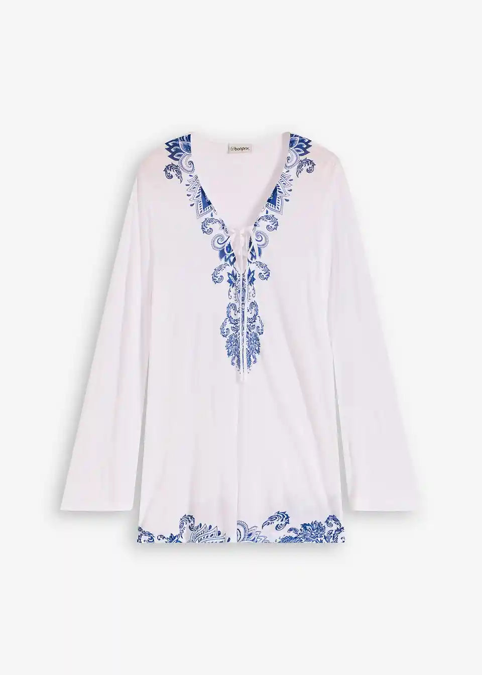 Elegantna plažna tunika z V-izrezom in vezalko. Dolgi rokavi. Postavljen potisk.