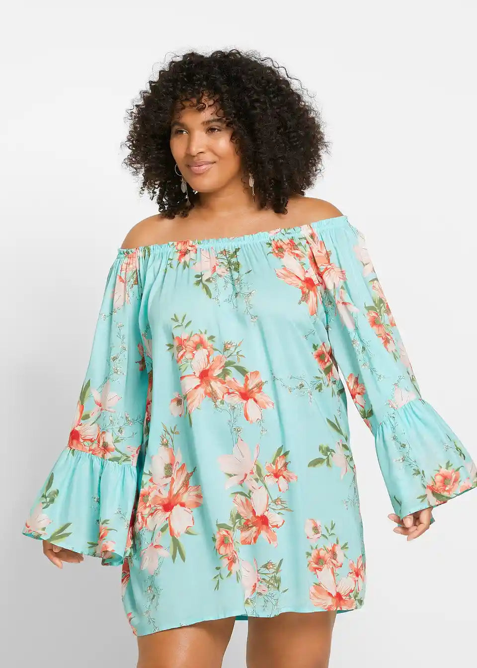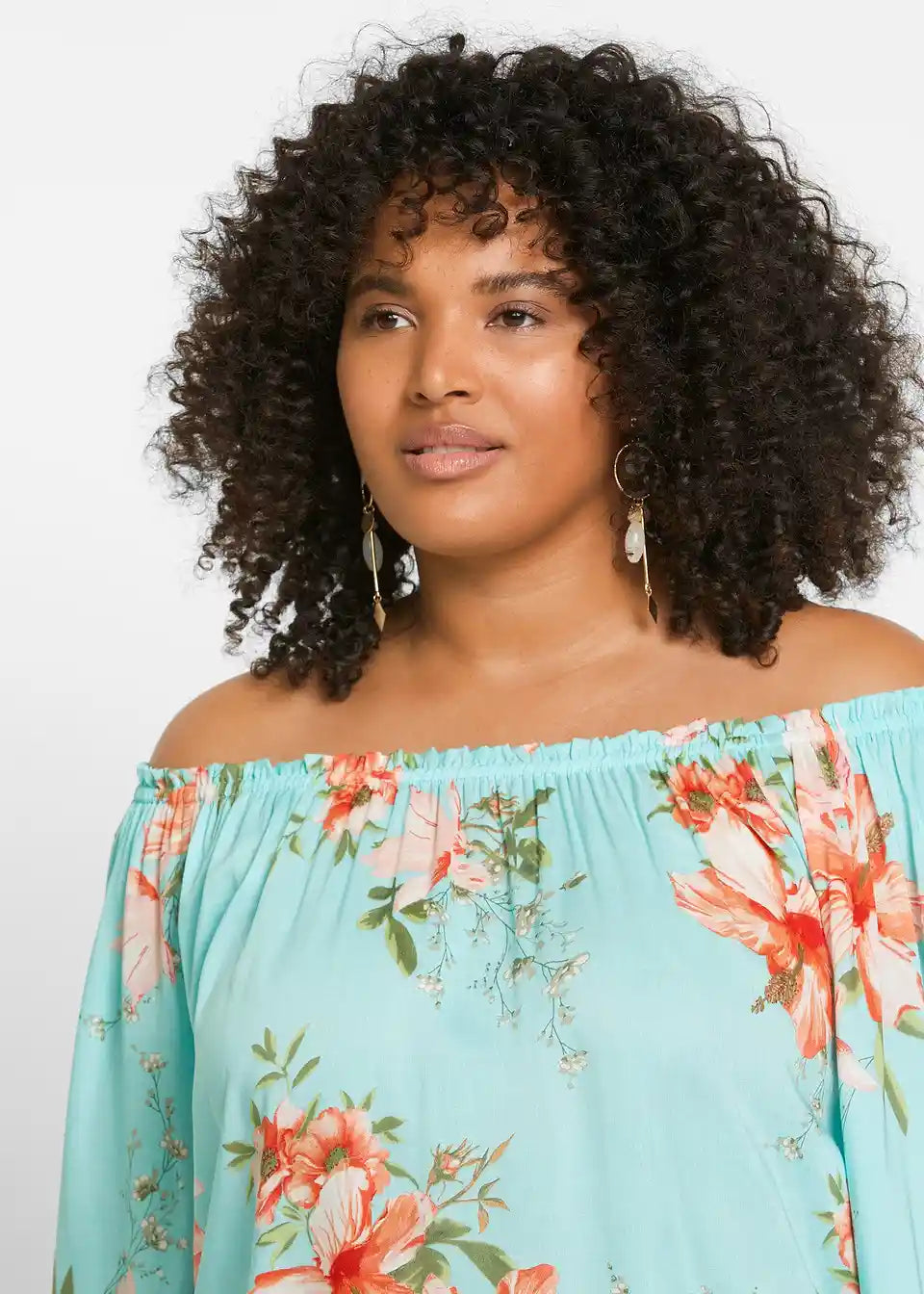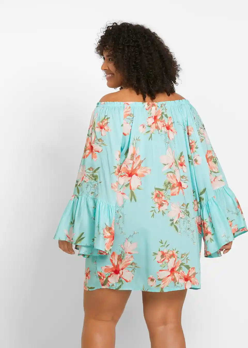 Tunika s karmin izrezom in širokimi volan rokavi.