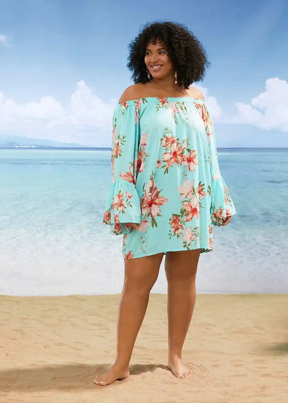 Elegantna, široka plažna tunika z modnim karmin izrezom