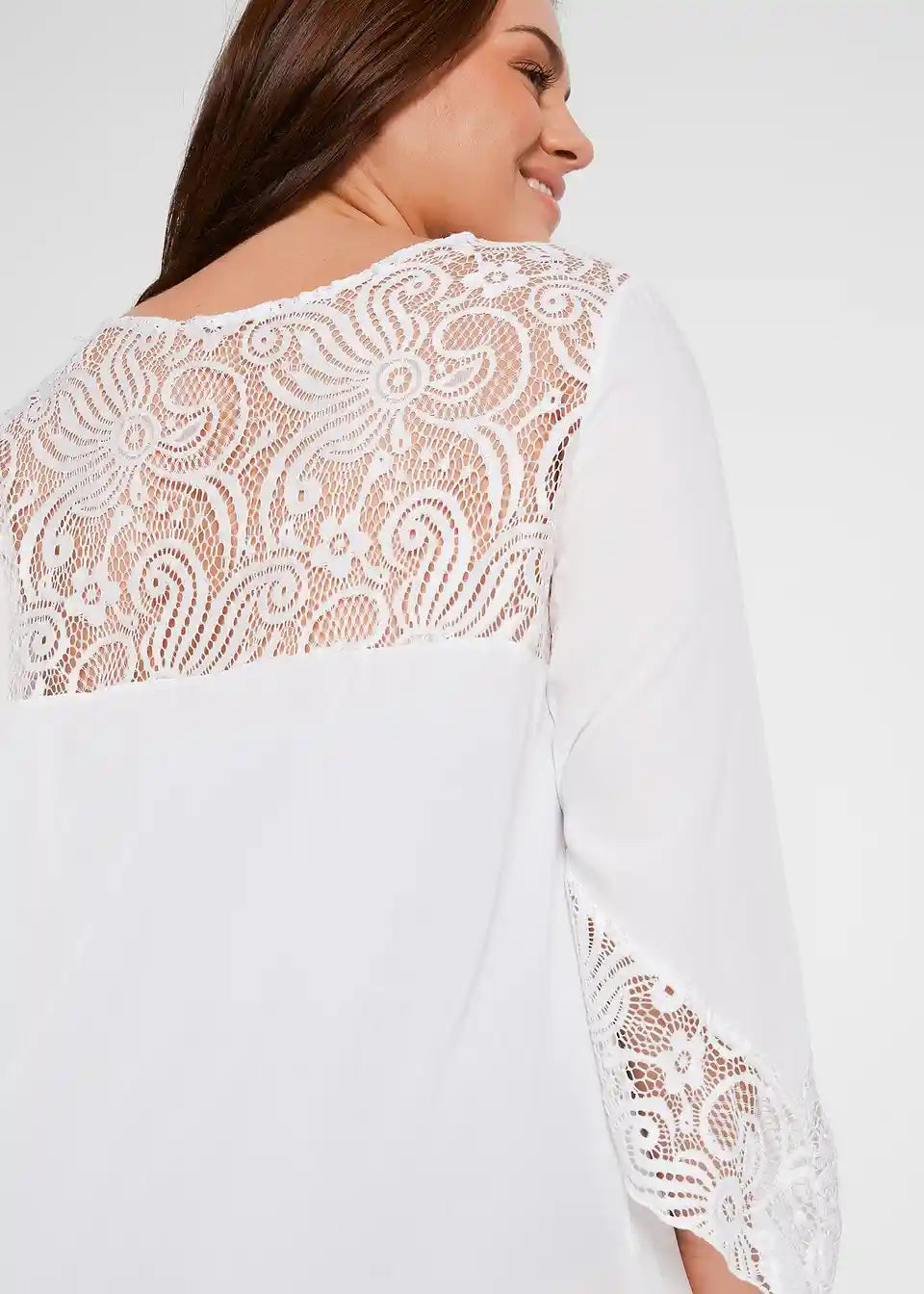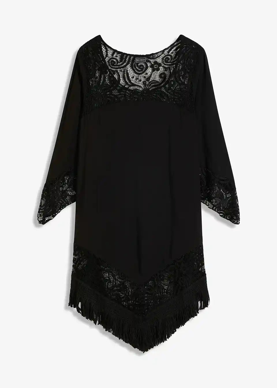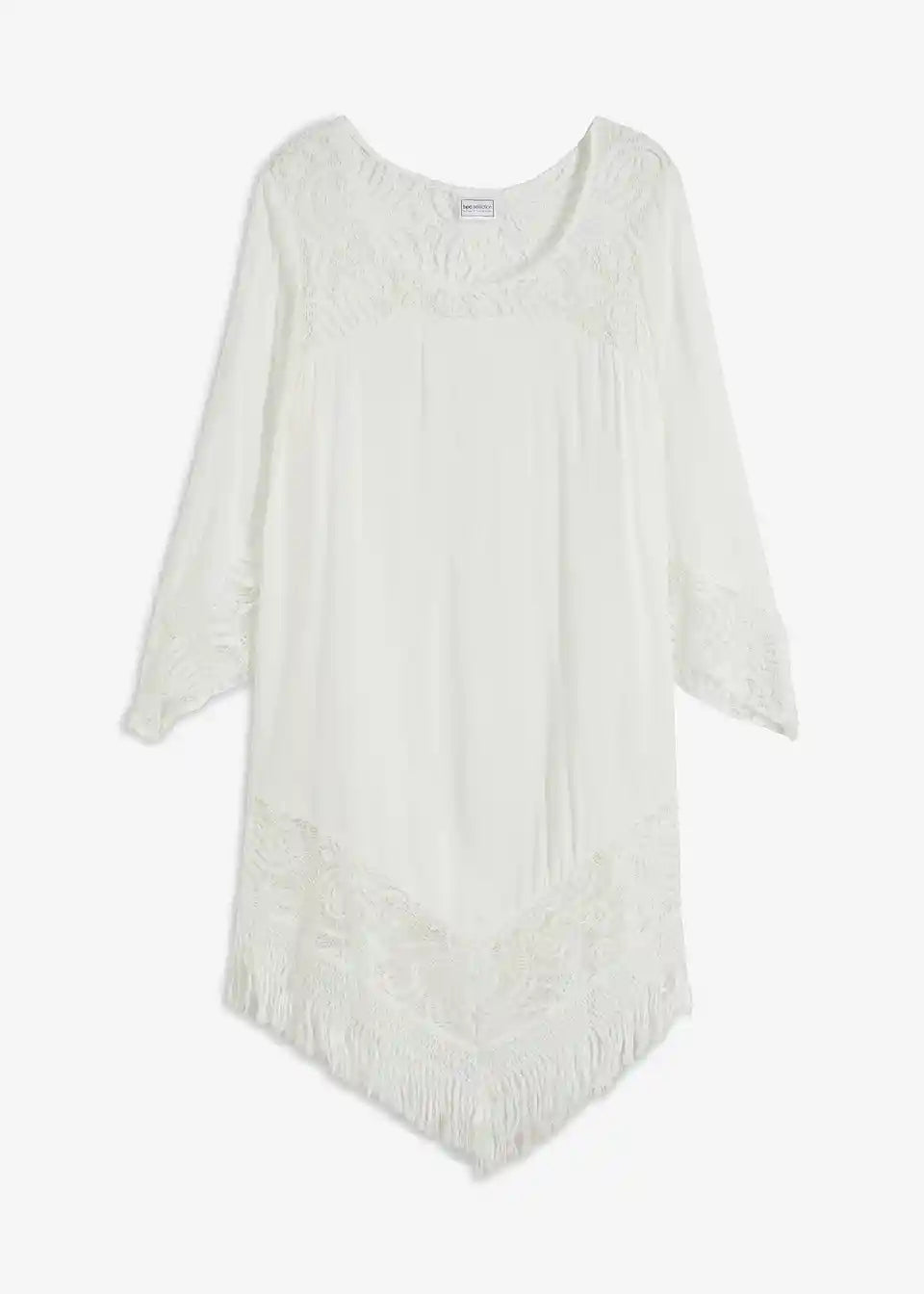 Rahlo prosojna plažna tunika znamke bpc selection navdušuje z nežno čipko in privlačnim dizajnom. Kvačkani čipkasti vstavki na izrezu, robu in rokavih dajejo tuniki eleganten videz in omogočajo, da zagorela koža pride do izraza. Poševno krojen rob z okrasnimi resami poudarja ženstven videz. Tunika je na plaži idealna v kombinaciji z elegantnimi kopalkami.