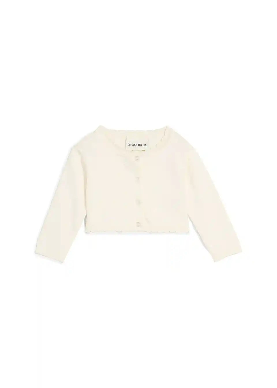 Pleten bolero iz mehkane mešanice viskoze v kremno beli barvi. S praktičnimi pritiskači in dekorativnim valovitim robom na izrezu. Lahek in prijeten za nošenje – popoln za slavnostne priložnosti.