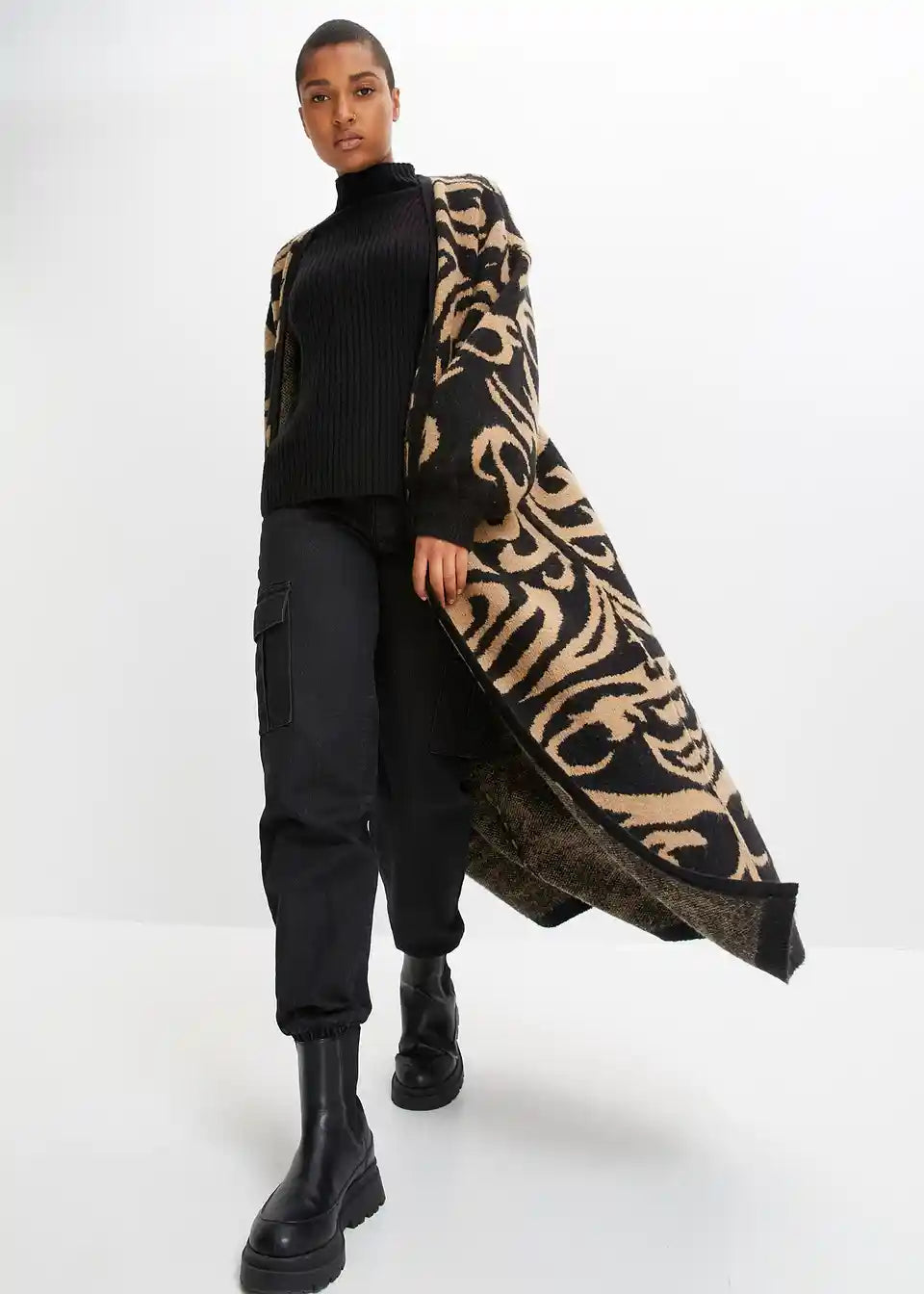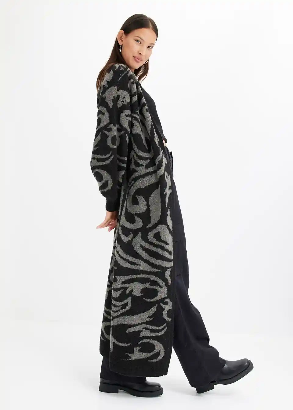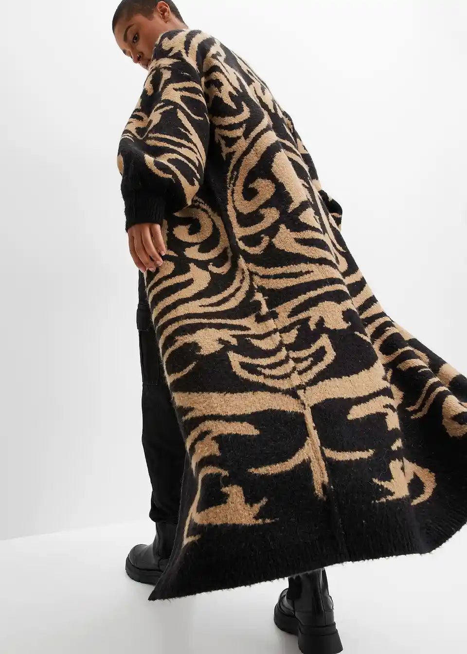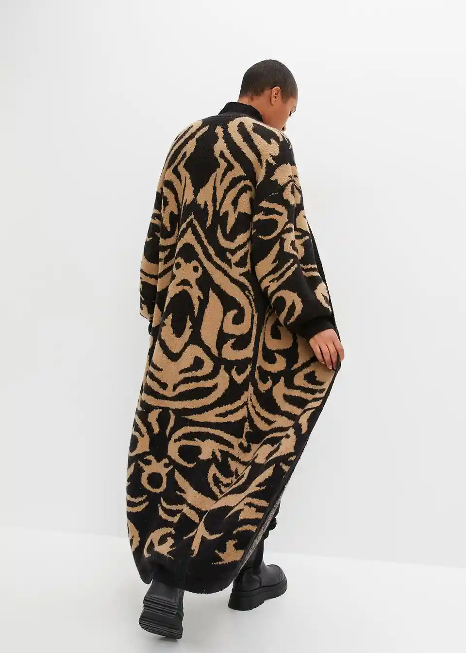 Sodoben oversize plašč, ekstra dolg, iz pletenin z jacquard vzorcem
