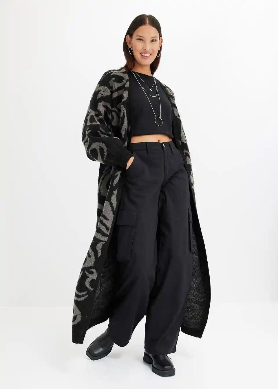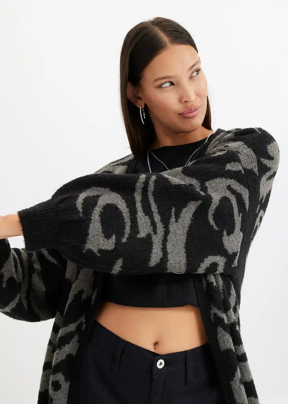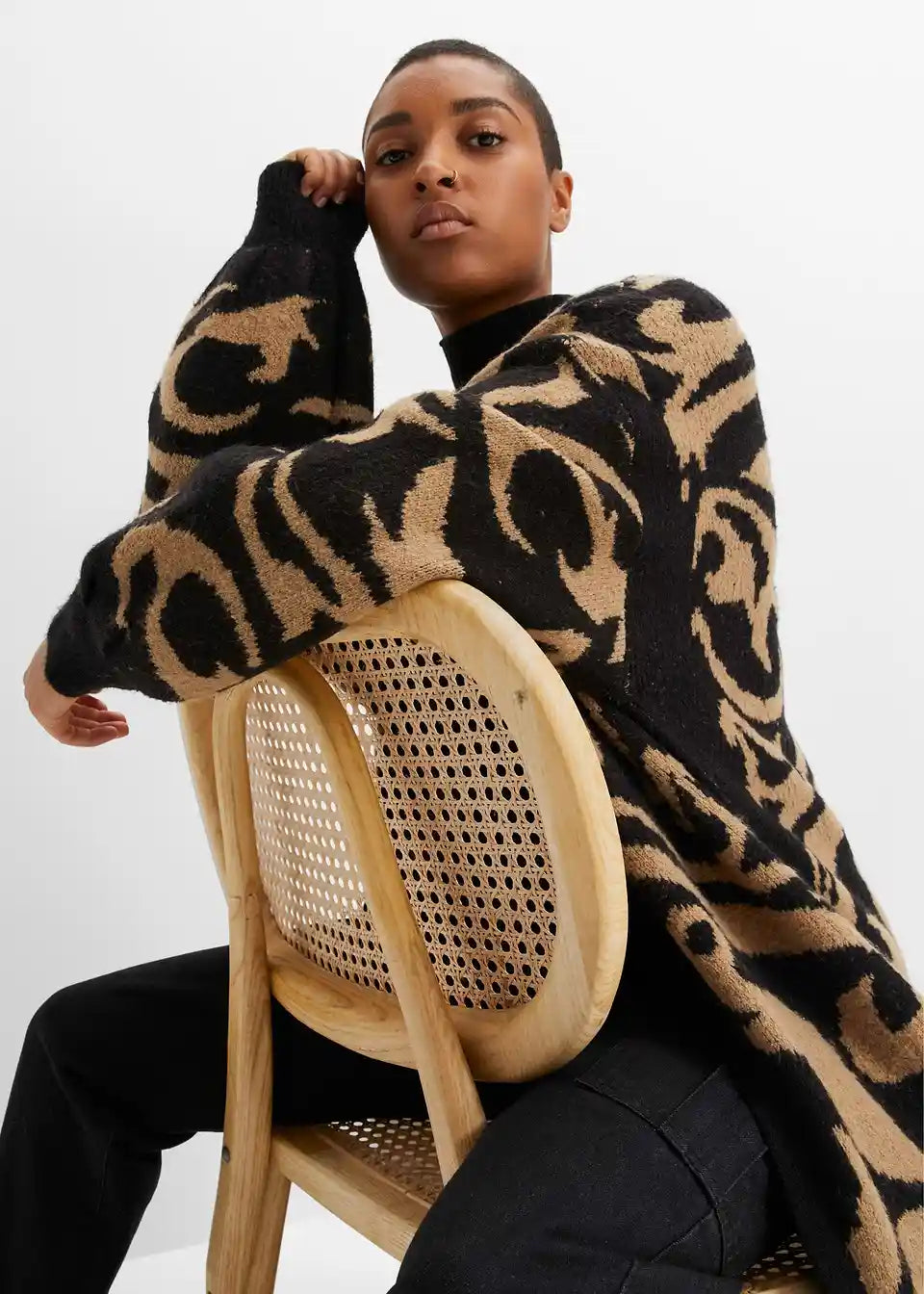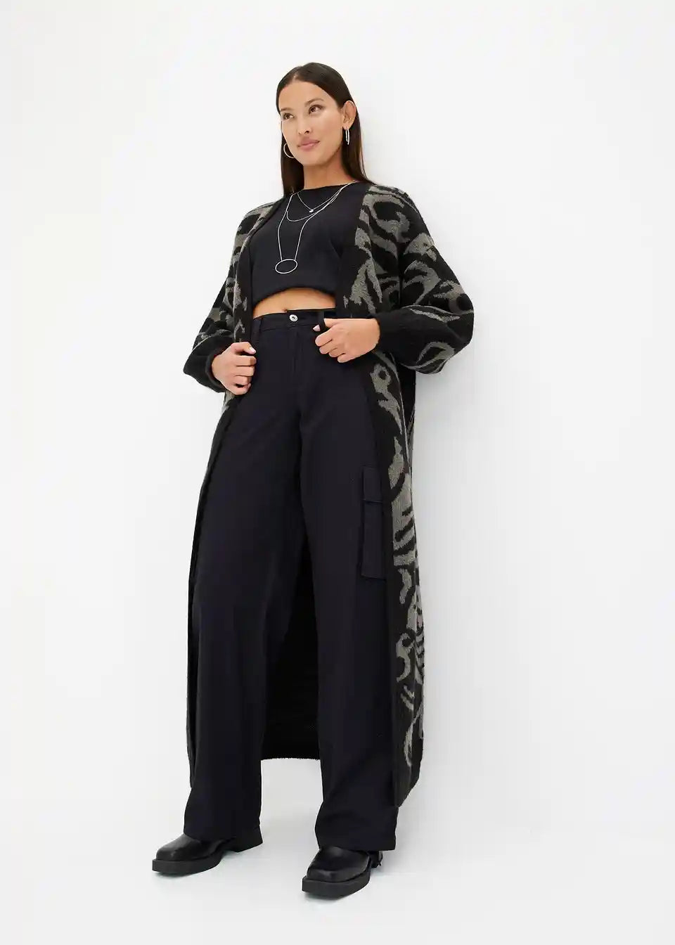 Sodoben oversize plašč, ekstra dolg, iz pletenin z jacquard vzorcem