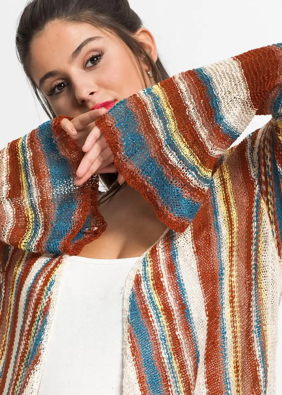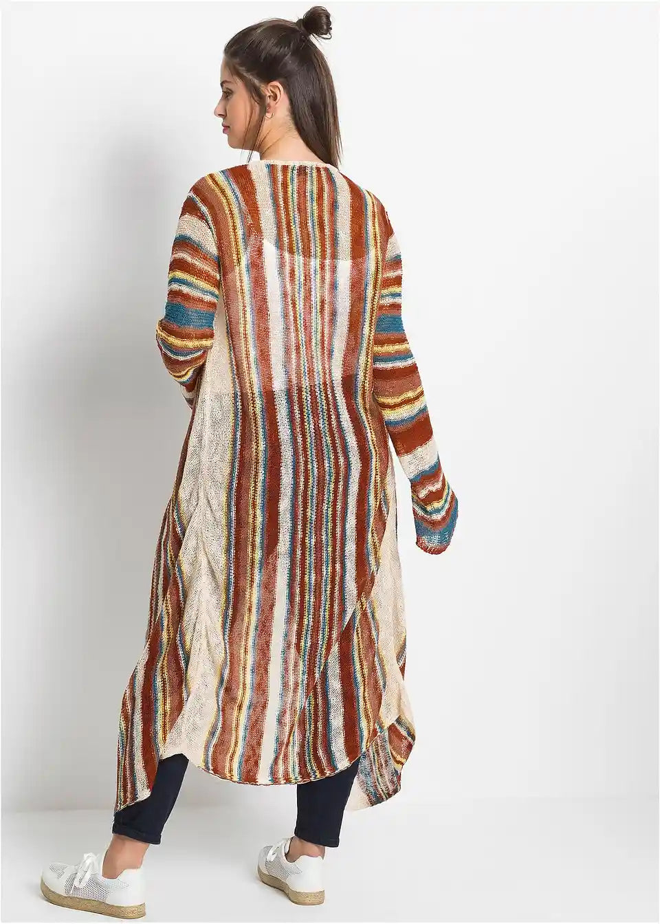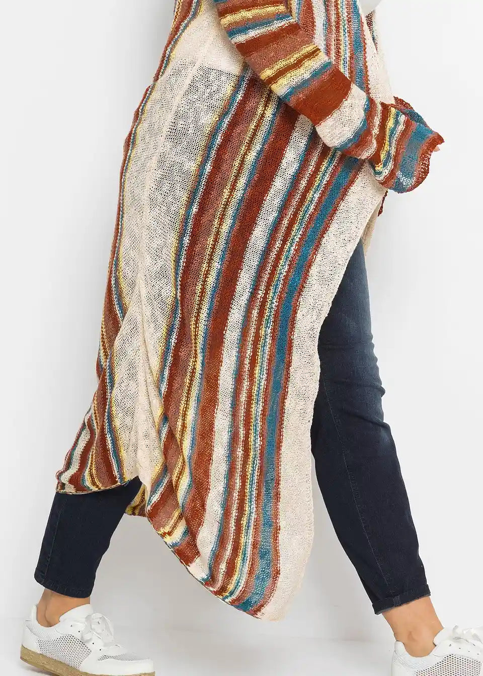 Raznobarvne črte so na tem pletenem plašču zamaknjene na trupu in rokavih. Ta podrobnost ustvarja kul učinek. Ekstra dolg model z razširjenimi rokavnimi konci dodaja pridih hipijevskega šarma. Pleten plašč brez ovratnika in zapiranja tvori izrazit privlačen kos v številnih kombinacijah. Enobarven videz z ozkimi kavbojkami in majico z dolgimi rokavi še posebej poudari izjemno zasnovo.