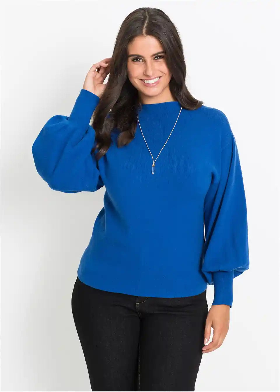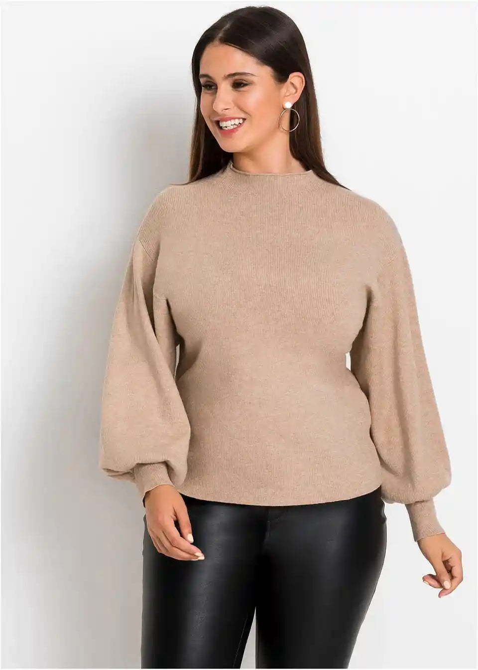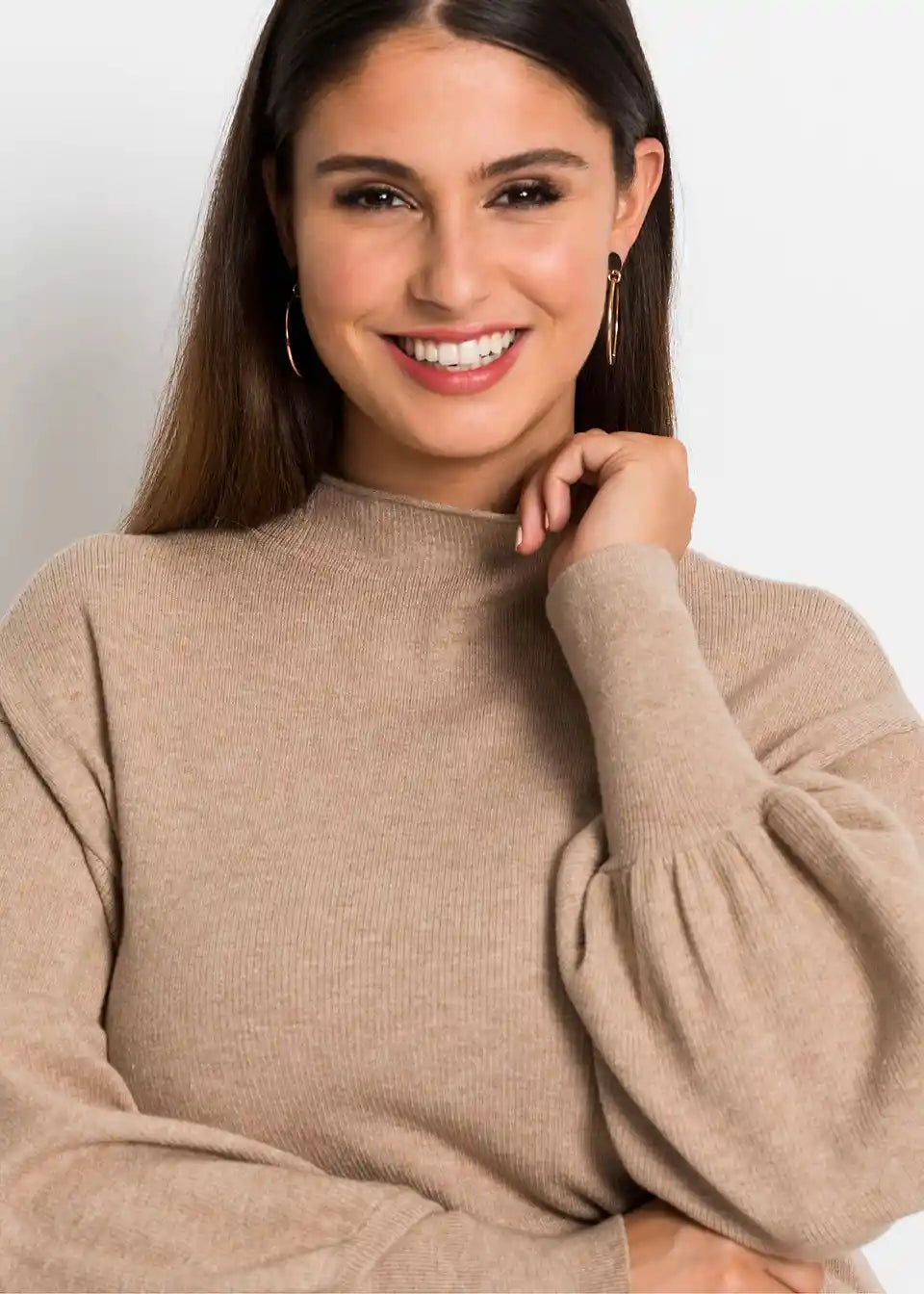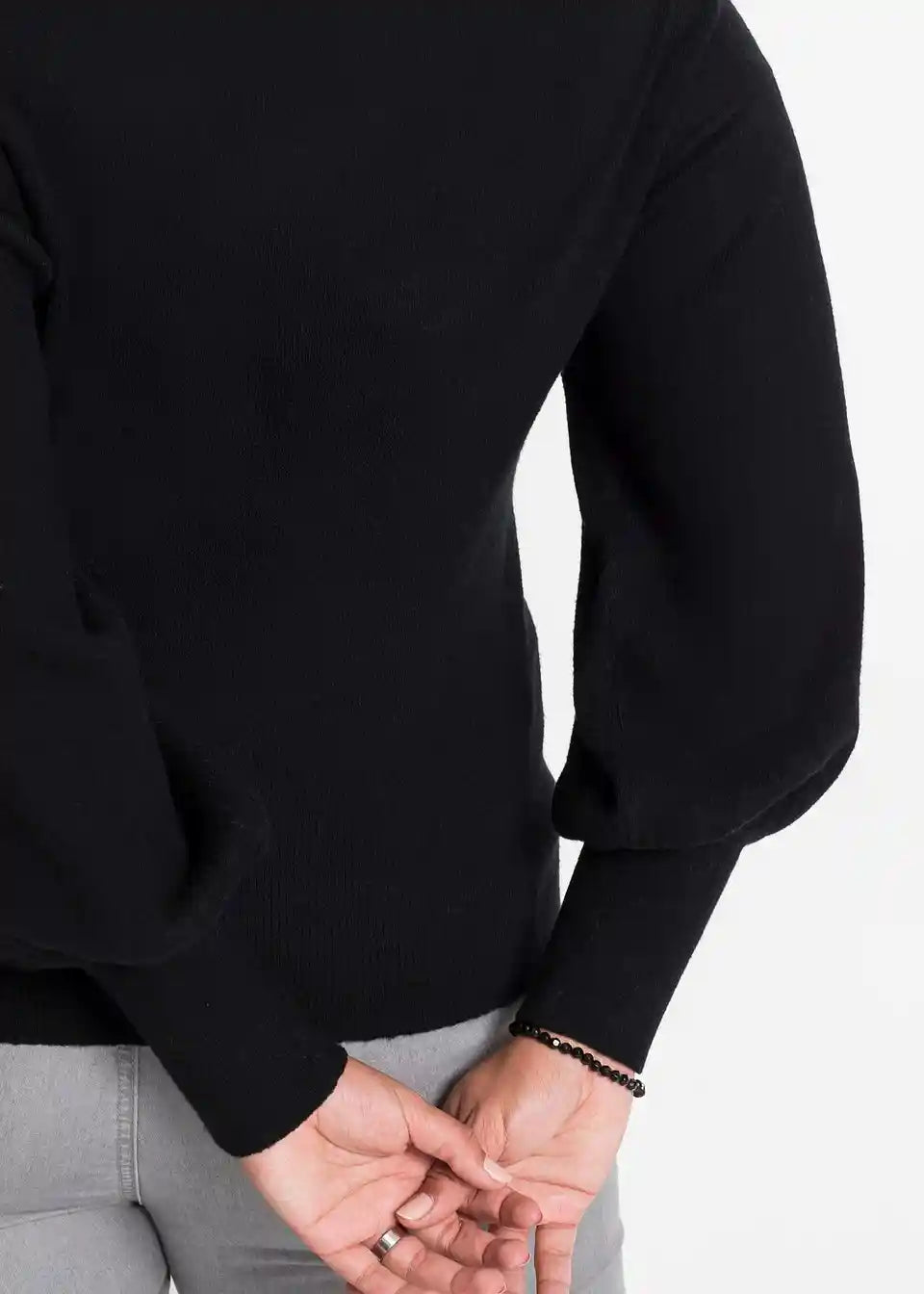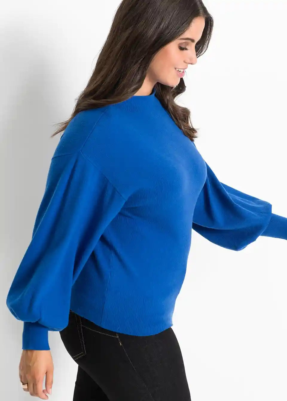 Eleganten pleten pulover z balon rokavi in stoječim ovratnikom