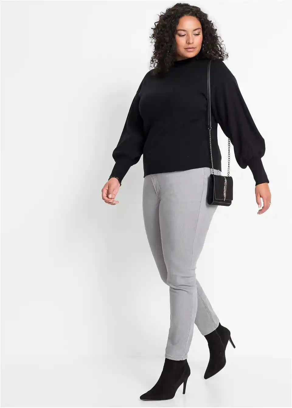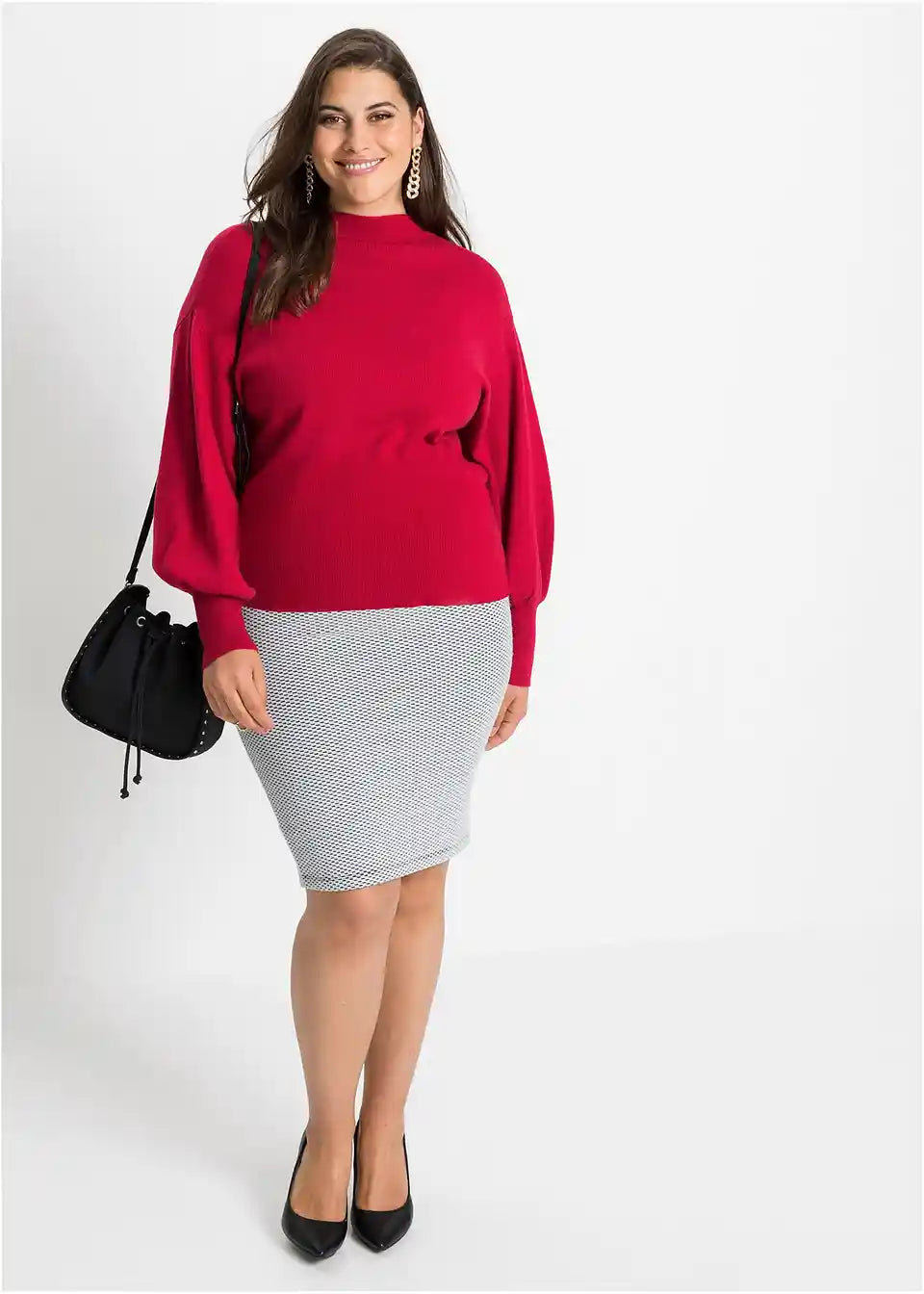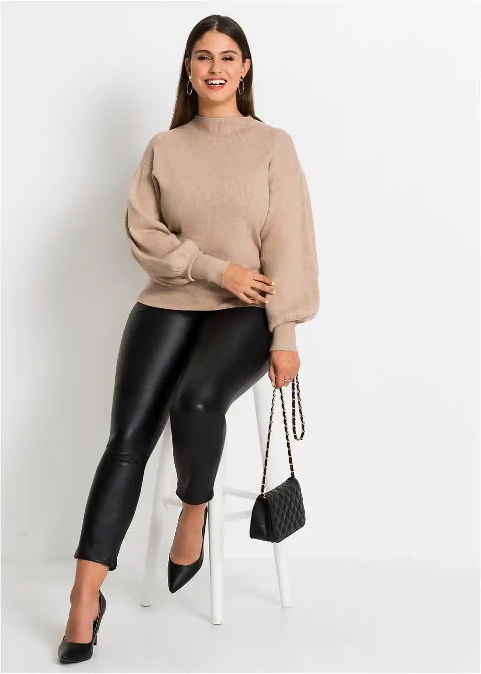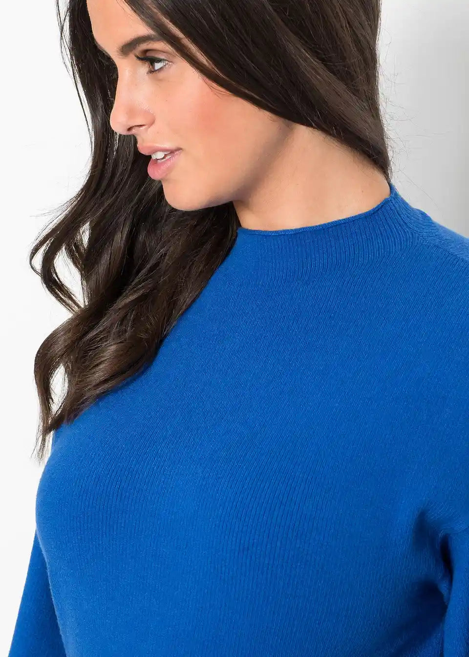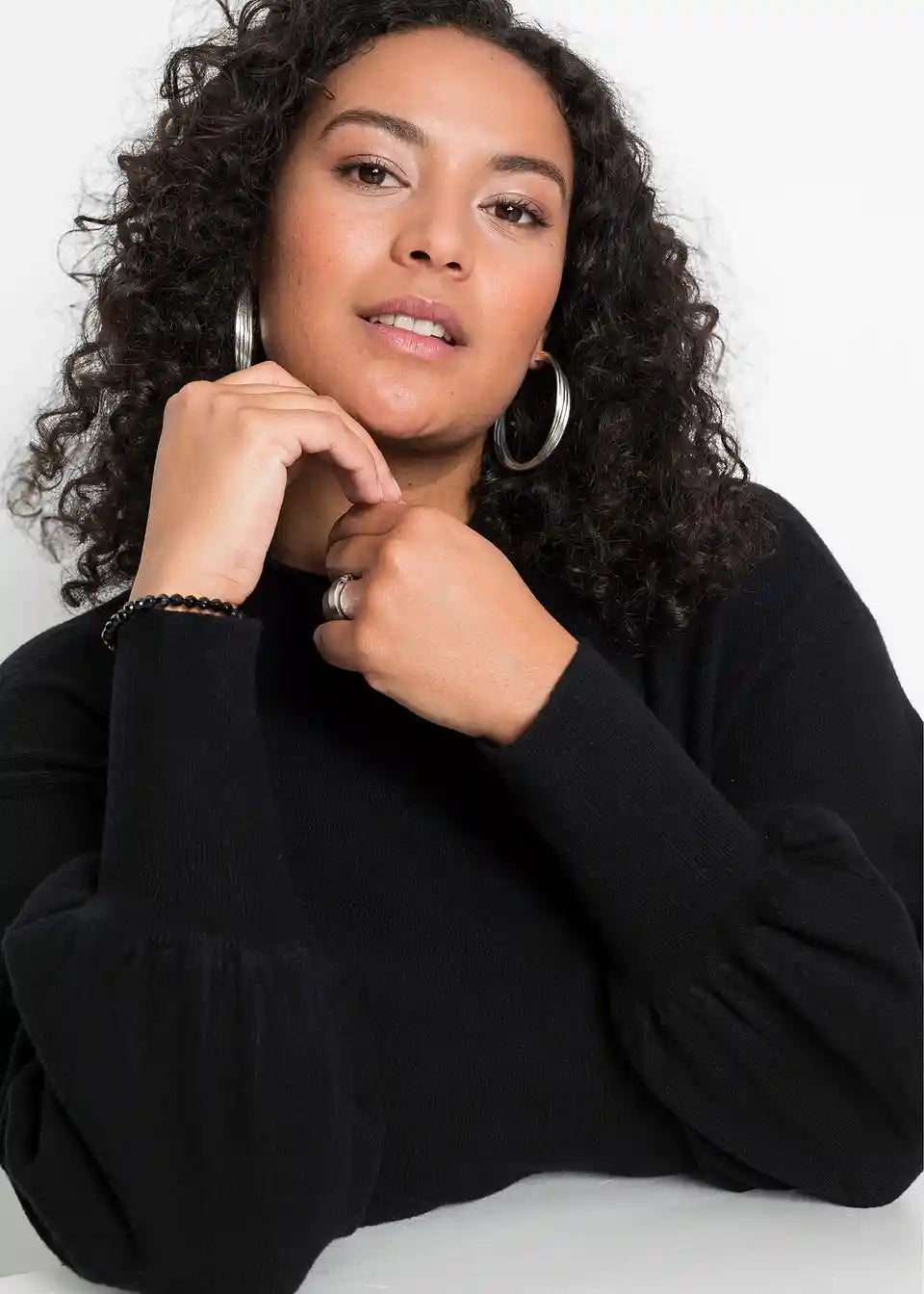 Eleganten pleten pulover z balon rokavi in stoječim ovratnikom