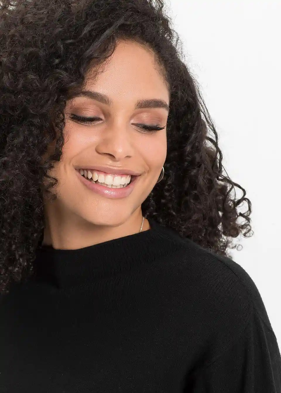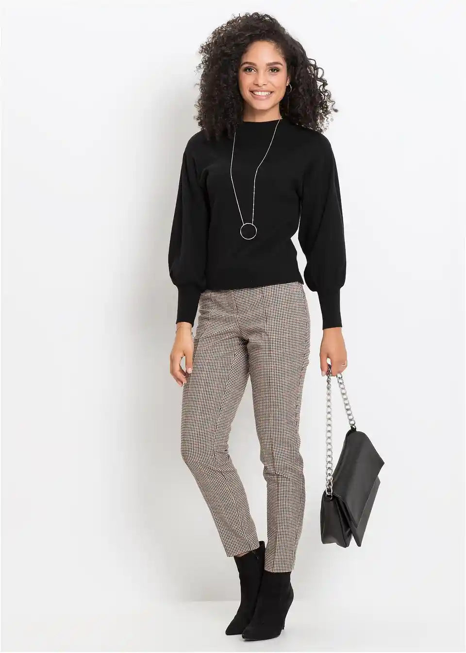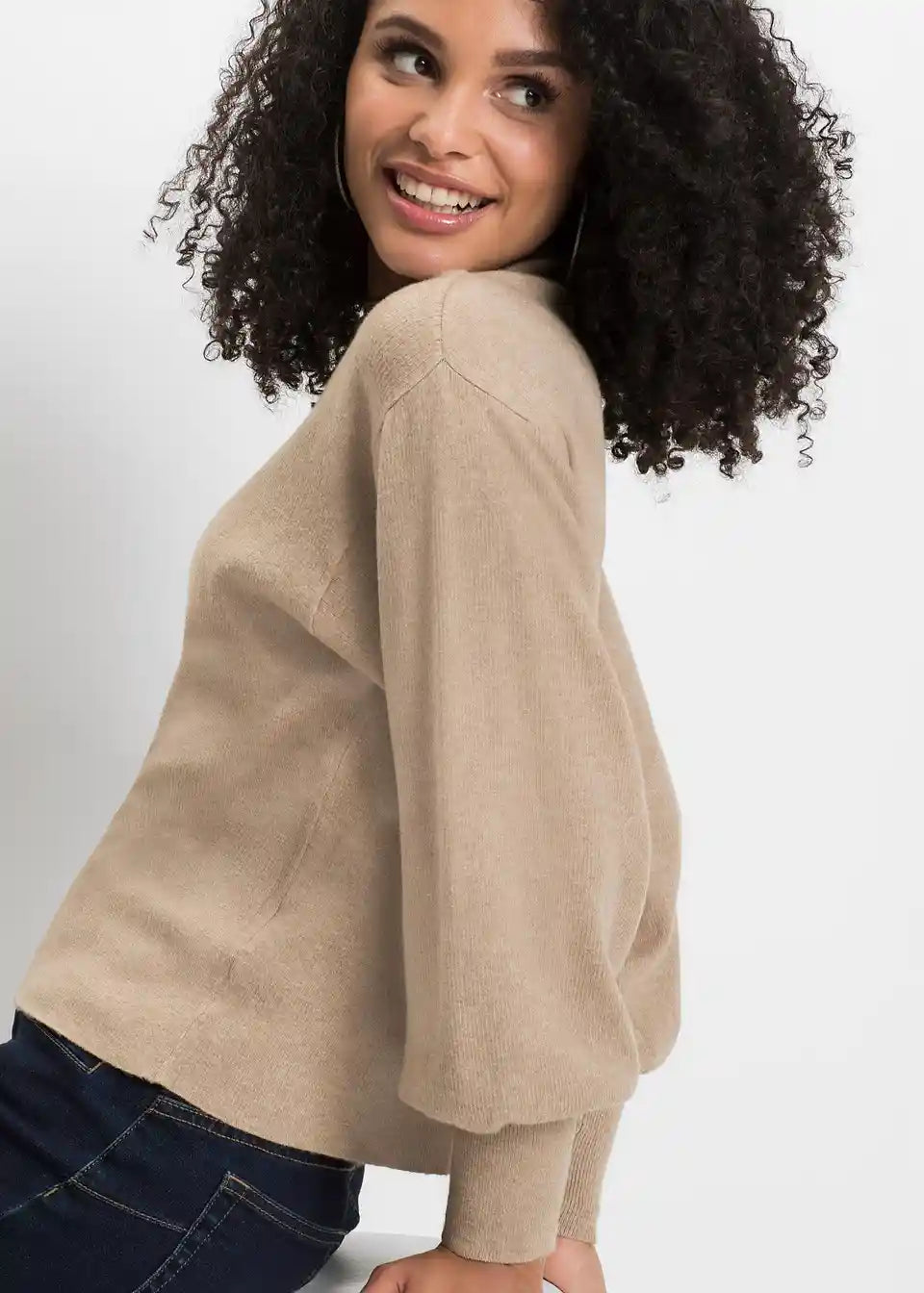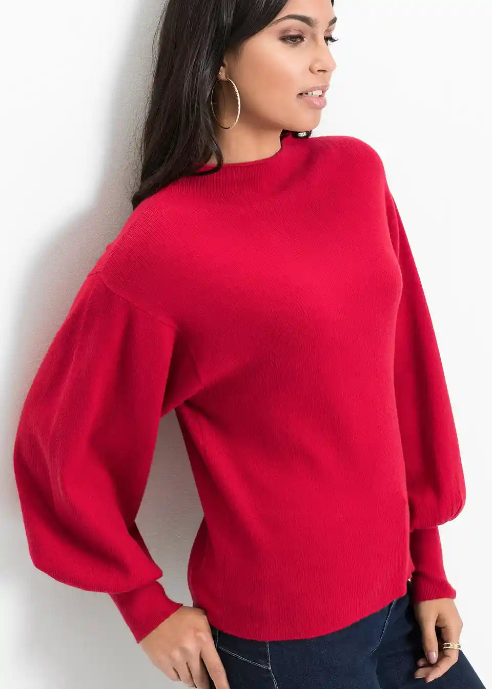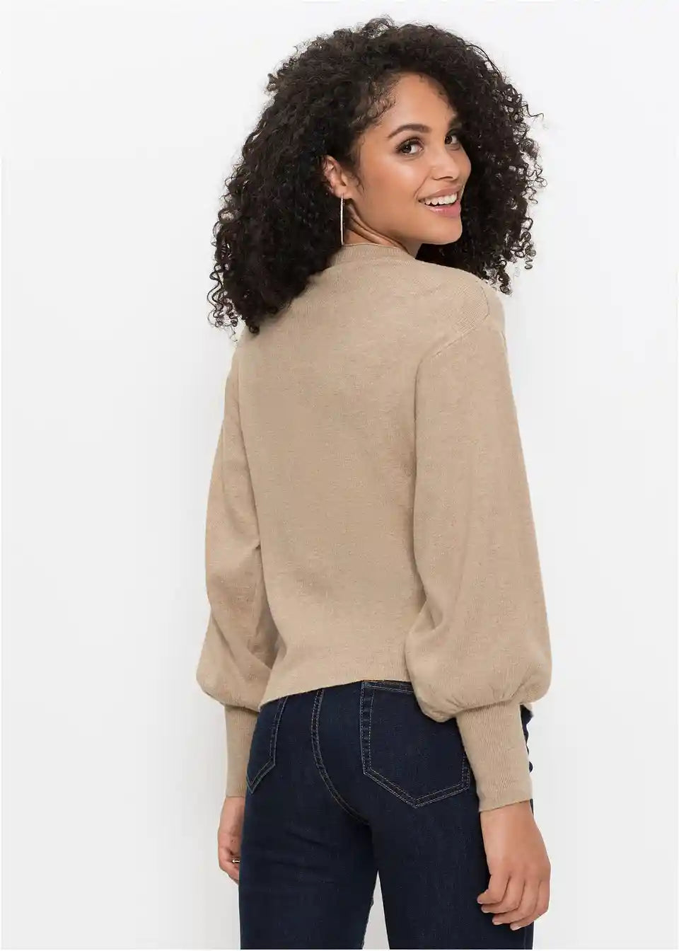 Eleganten pleten pulover z balonastimi rokavi in stoječim ovratnikom
