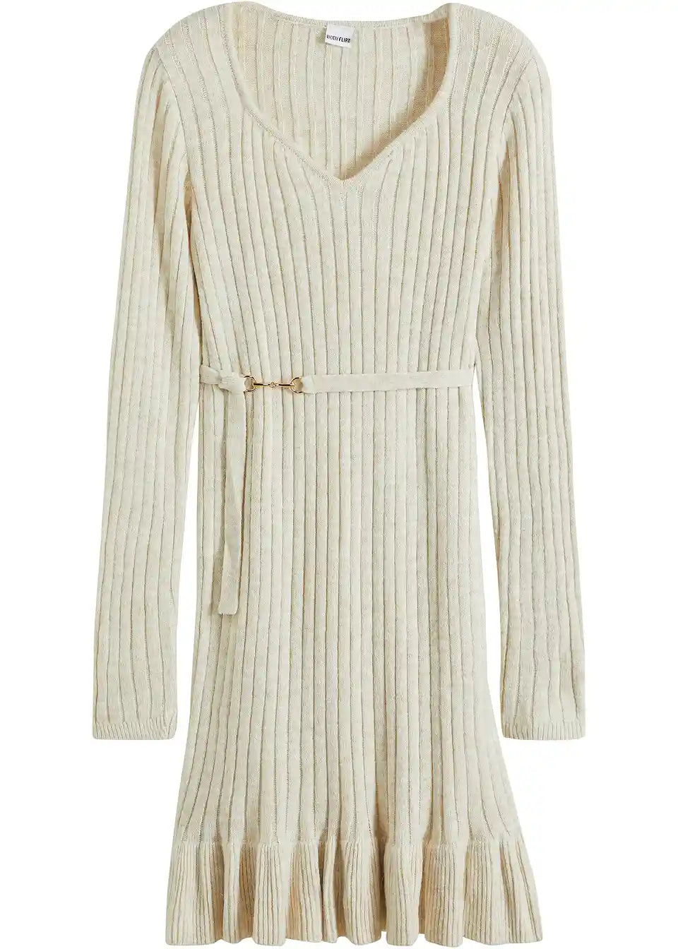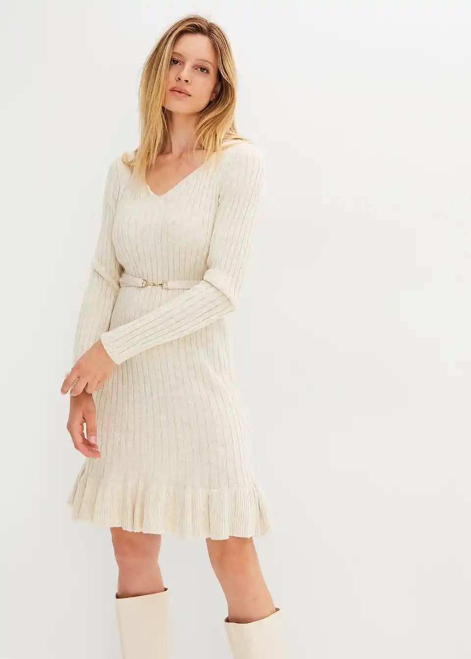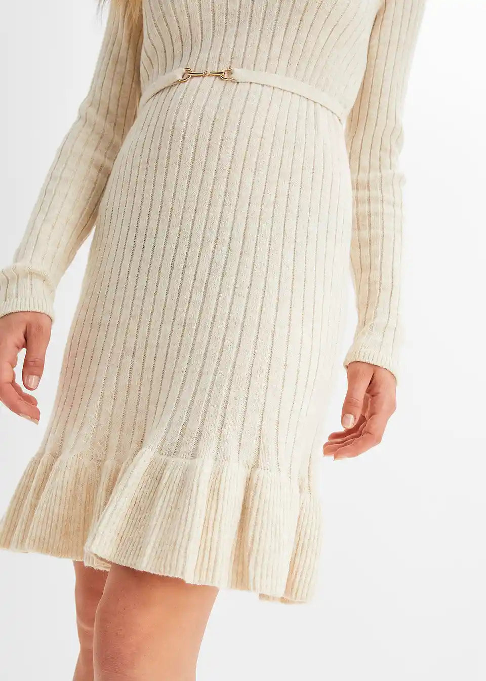 ženska pletena obleka z volanom in aplikacijo v pasu.