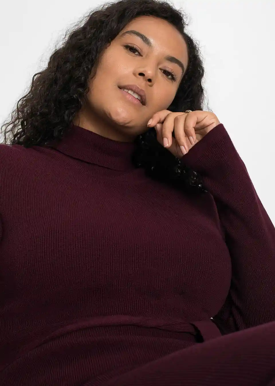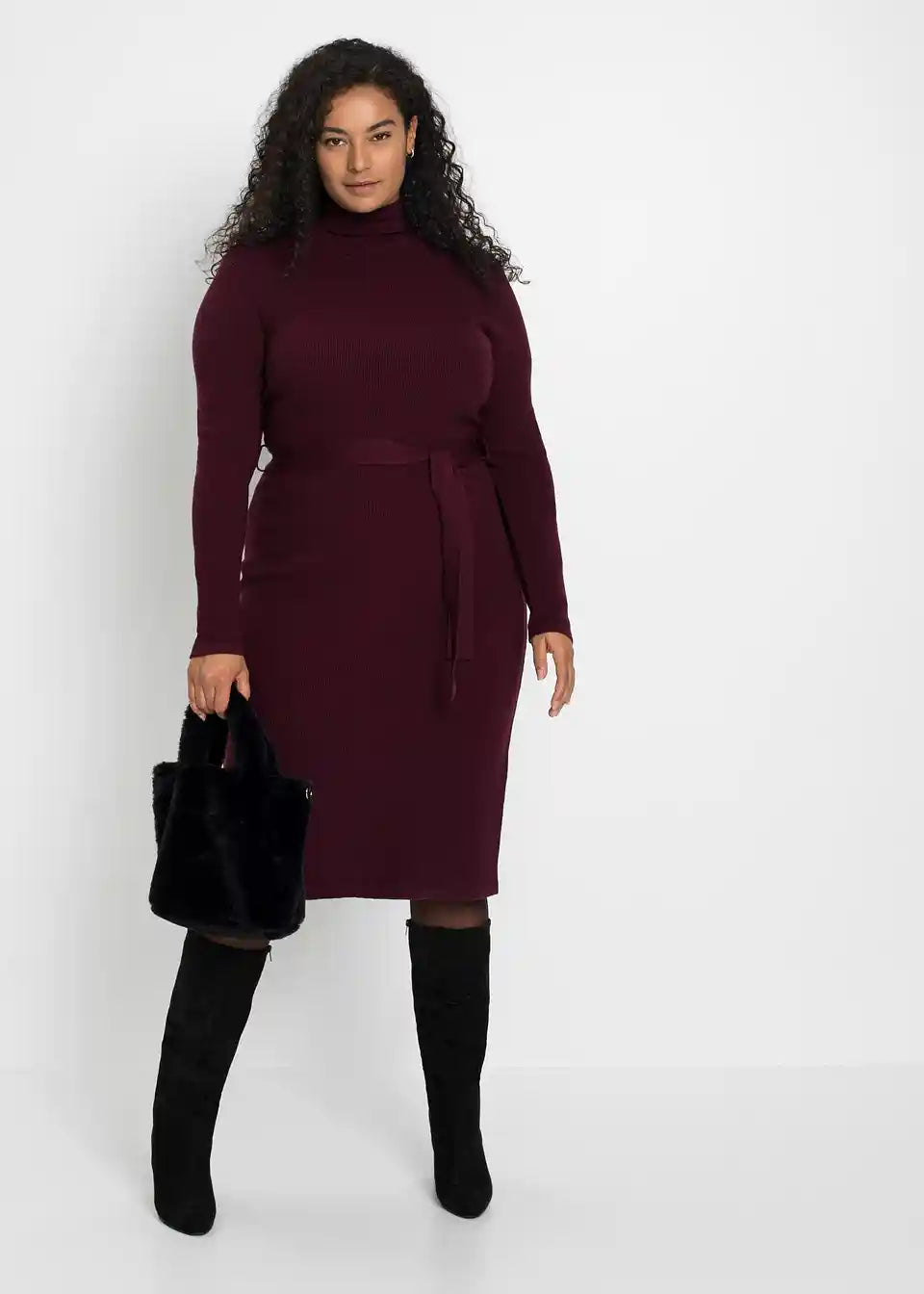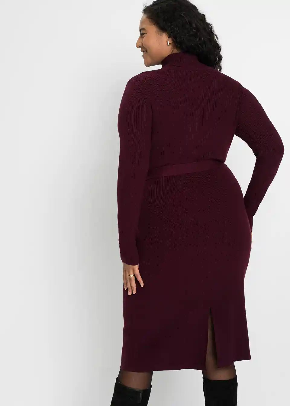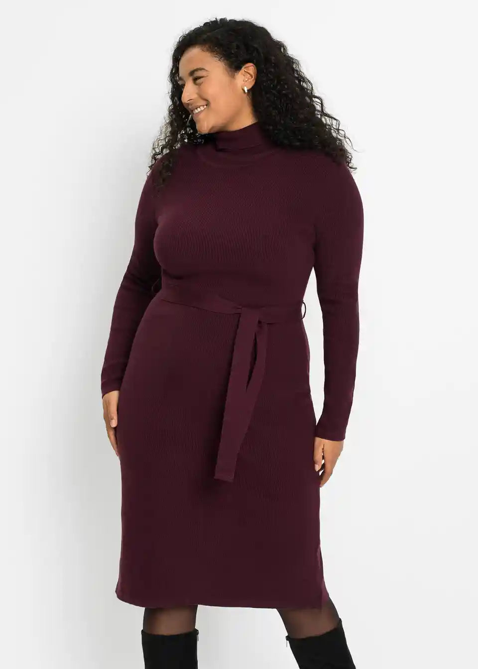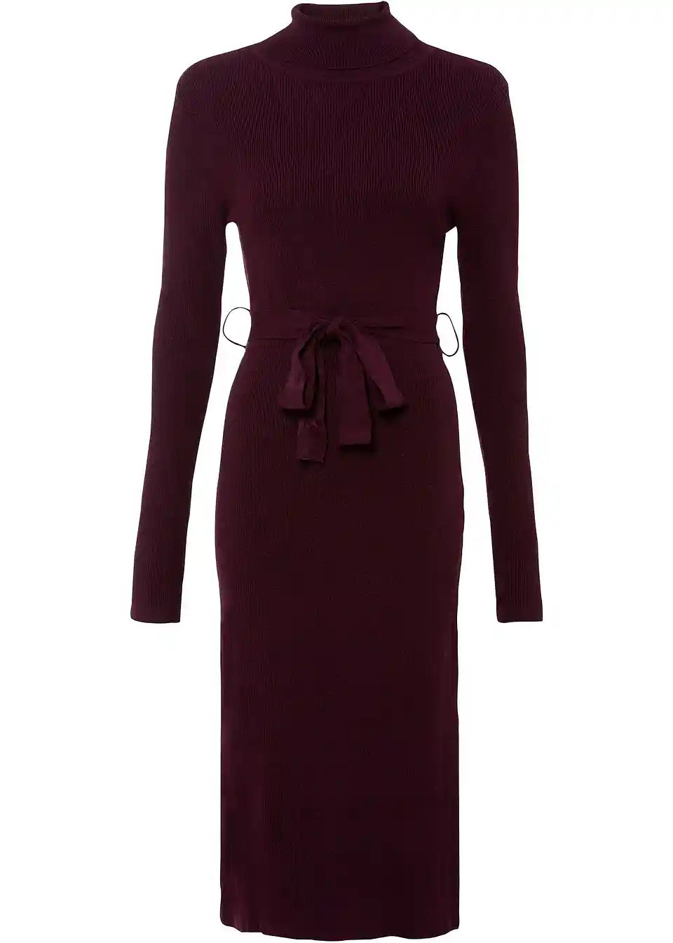 Privlačna pletena obleka s praktičnim pasom za zavezovanje okoli pasu.