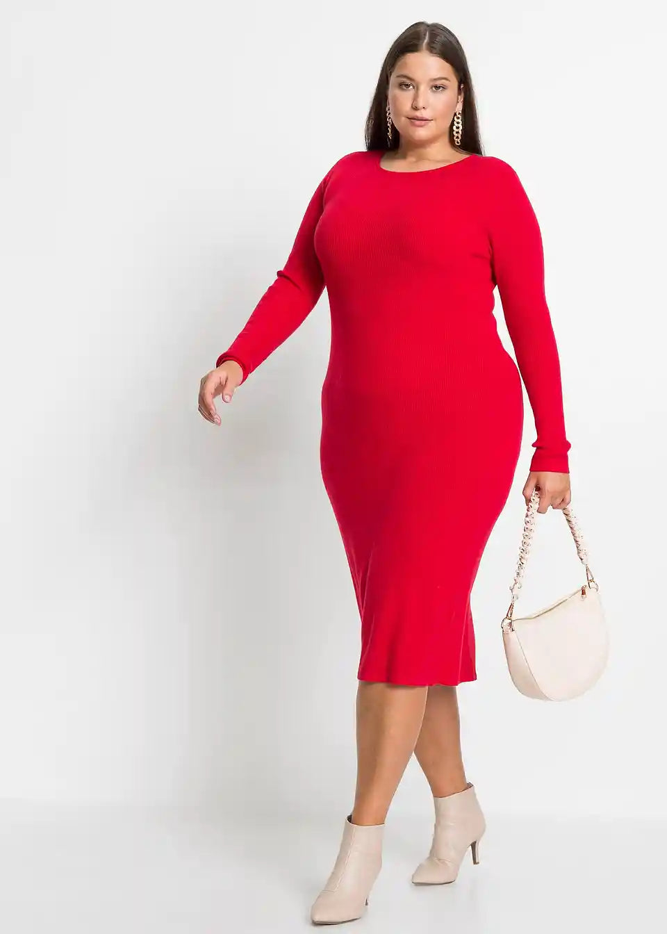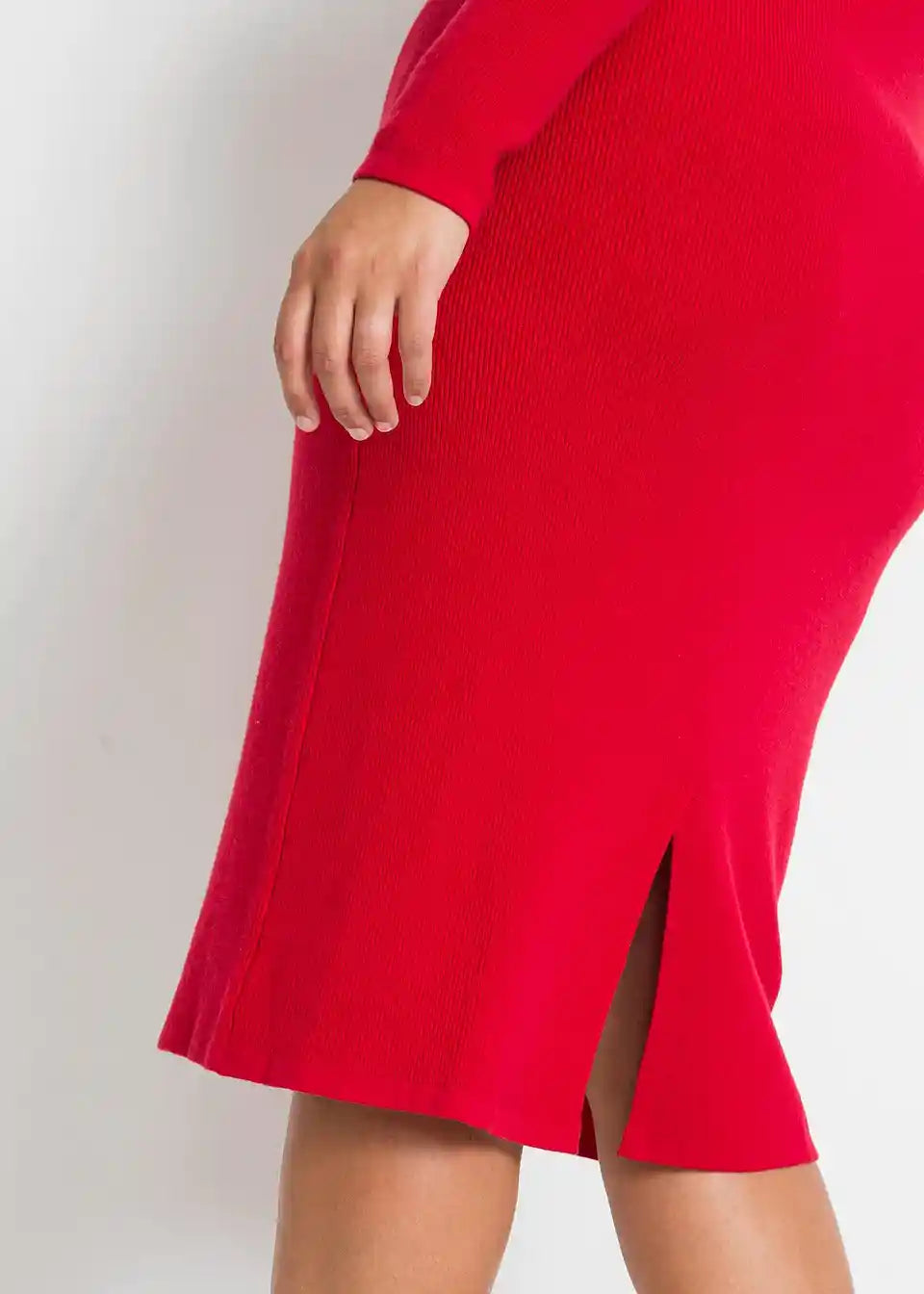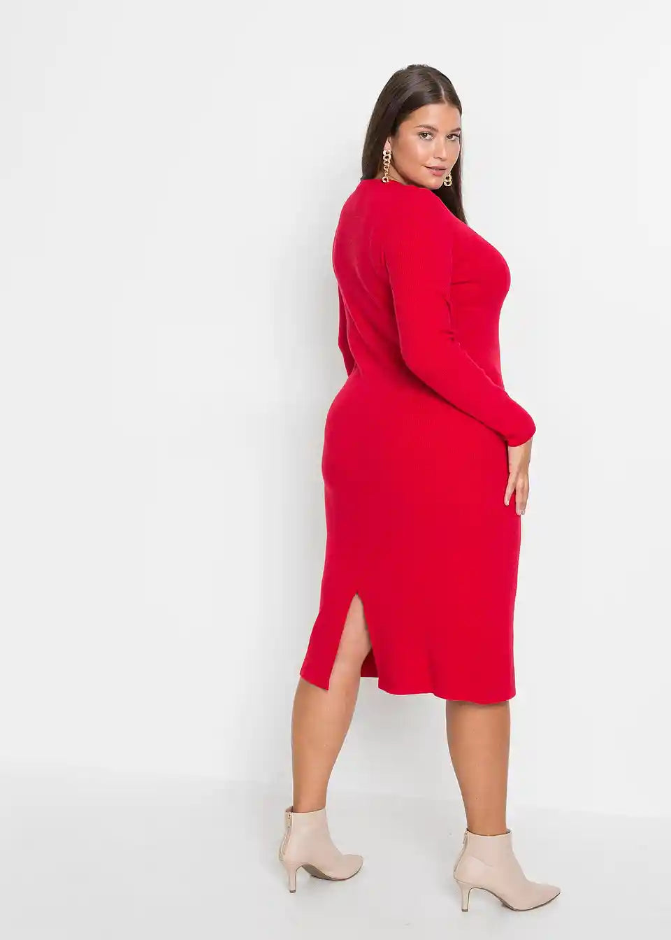 Elegantna pletena obleka z dekorativnim razporkom na hrbtni strani in ženstveno silhueto.