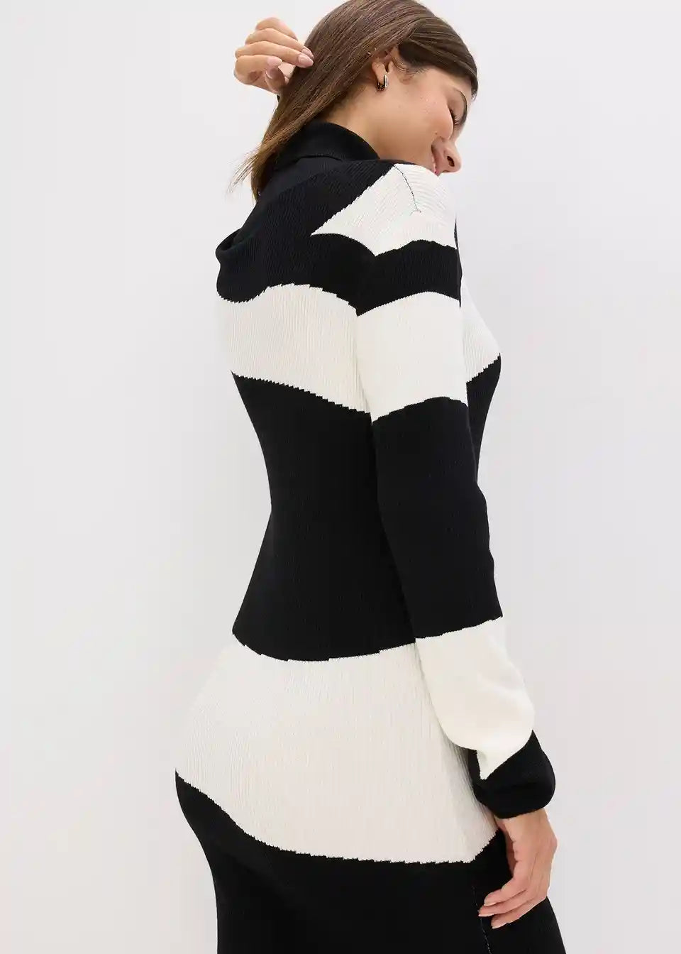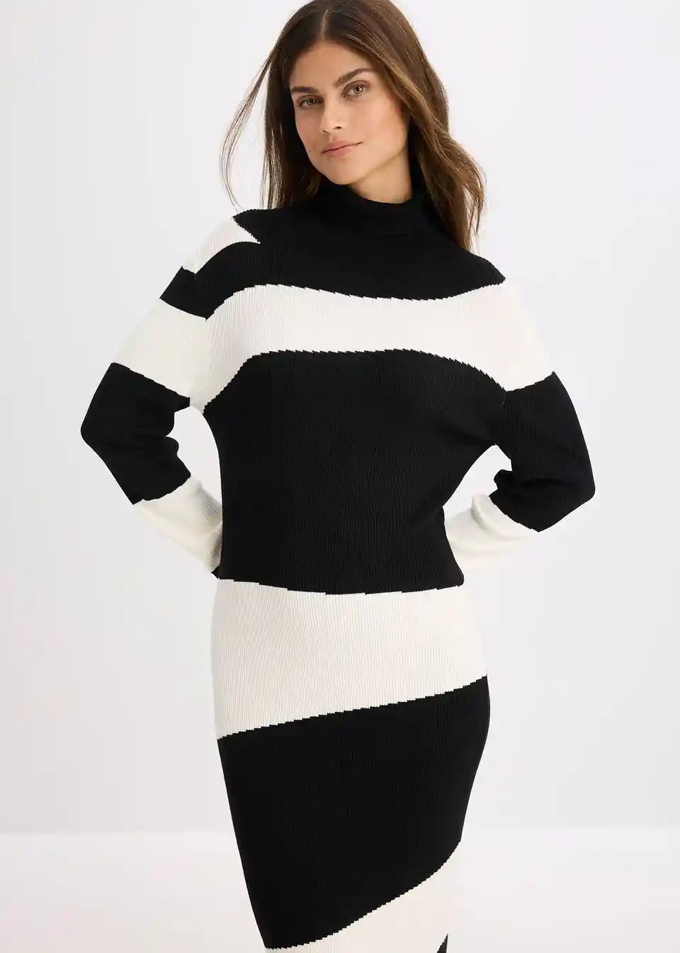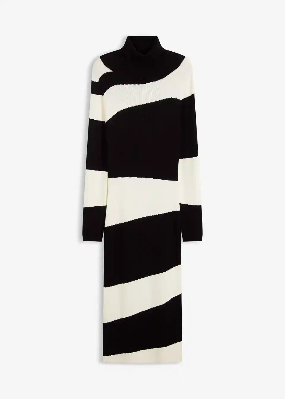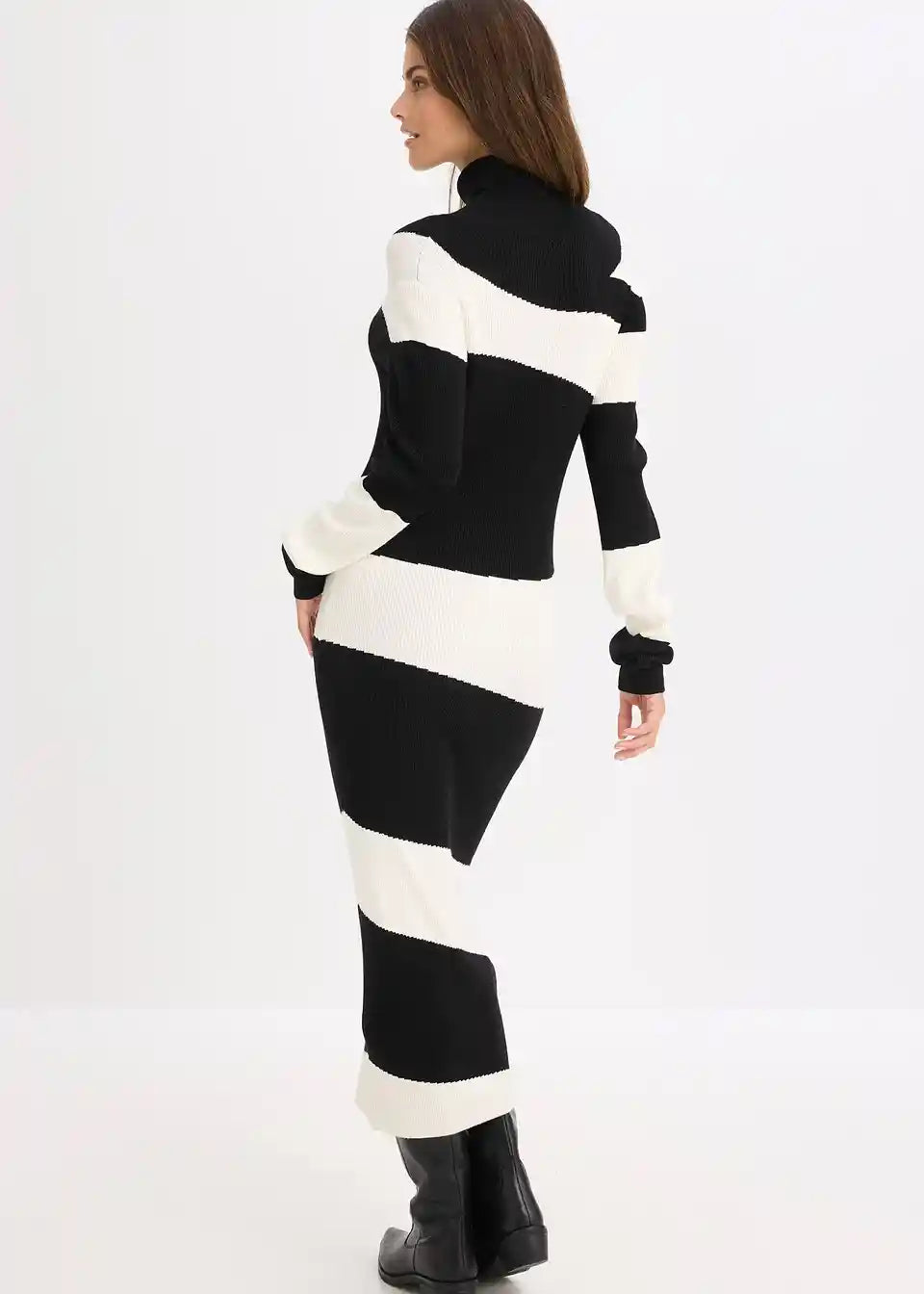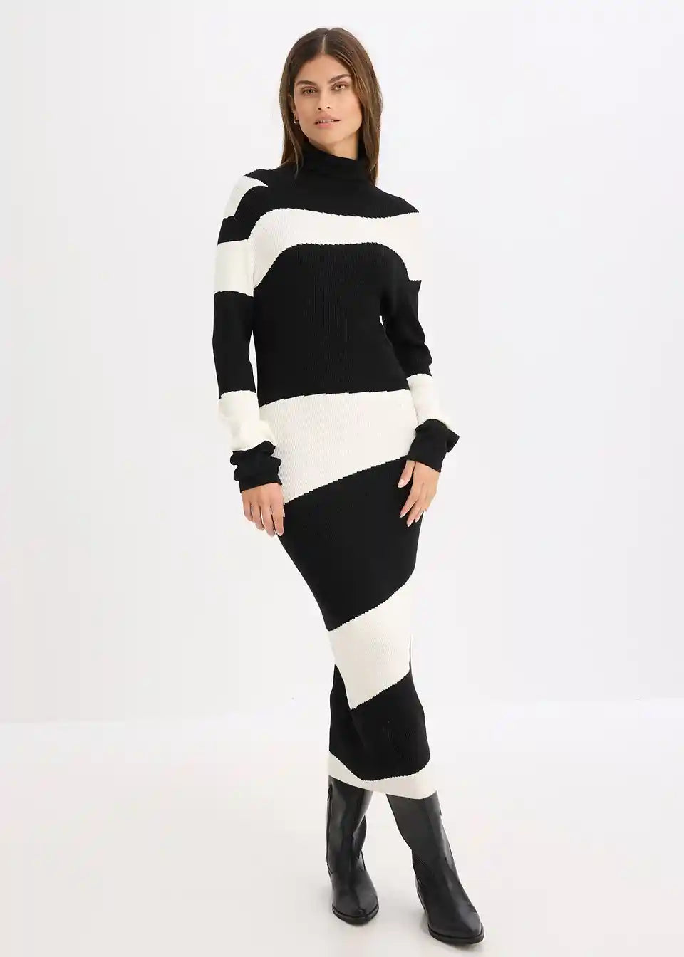 Mehka, po telesu oprijeto krojena, pletena obleka v midi dolžini