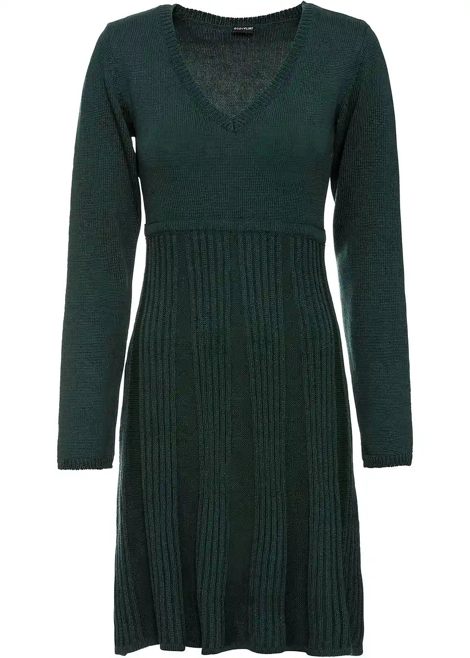 Čudovita pletena obleka z V-izrezom in modnim rebrastim vzorcem spredaj in zadaj.