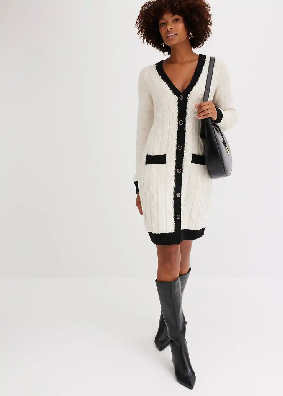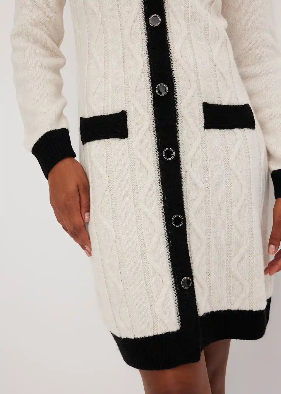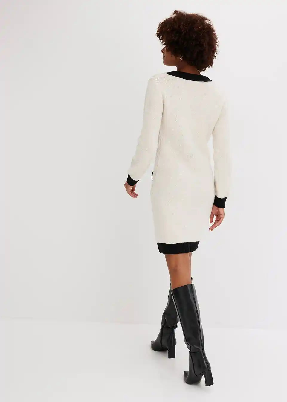 Moderna in ženstvena: pletena obleka z okrasnimi gumbi.