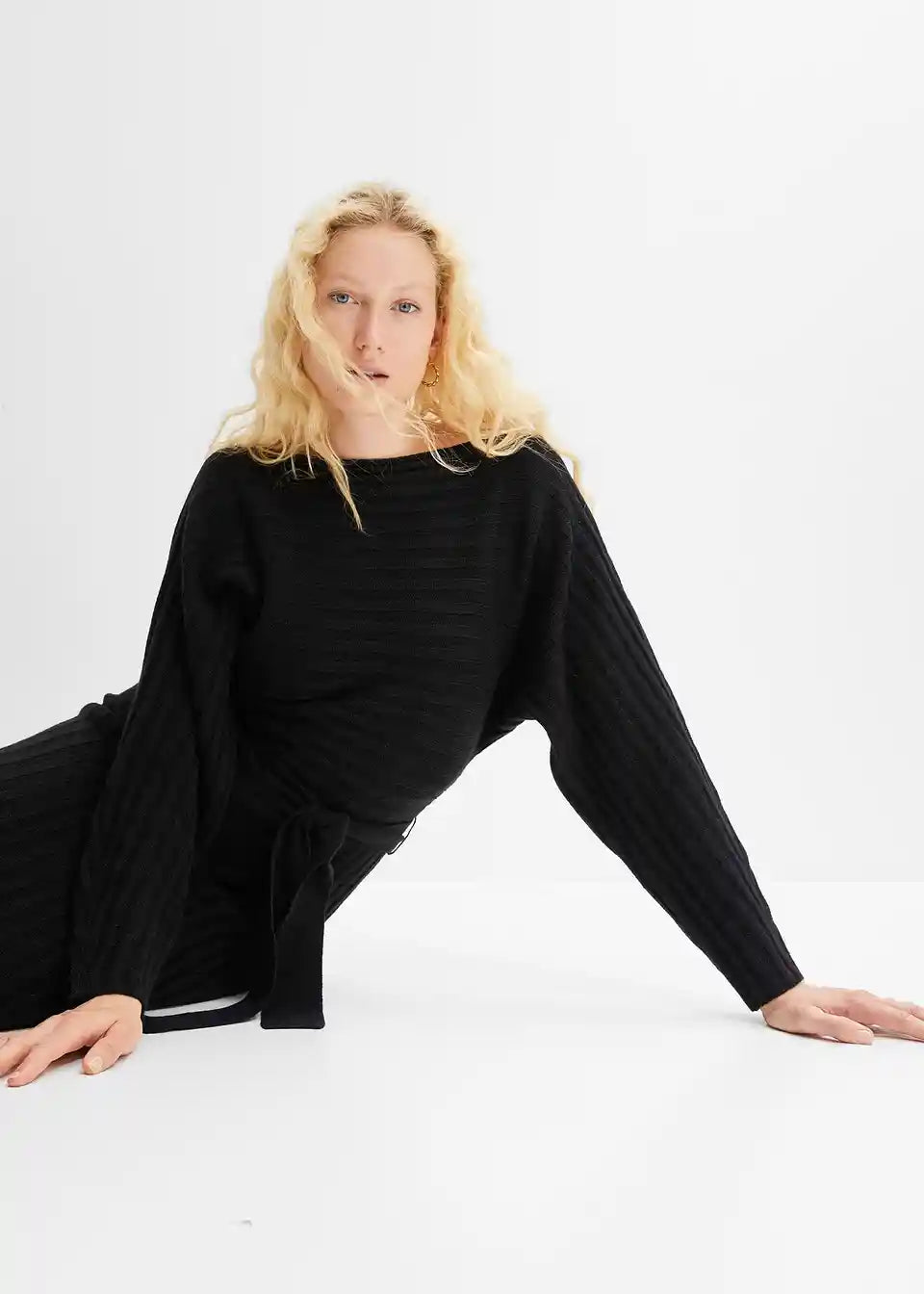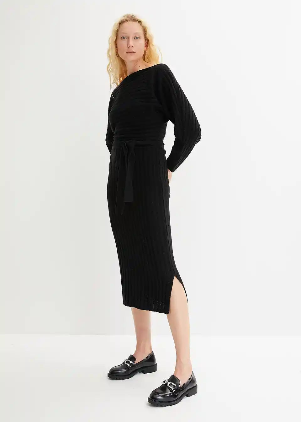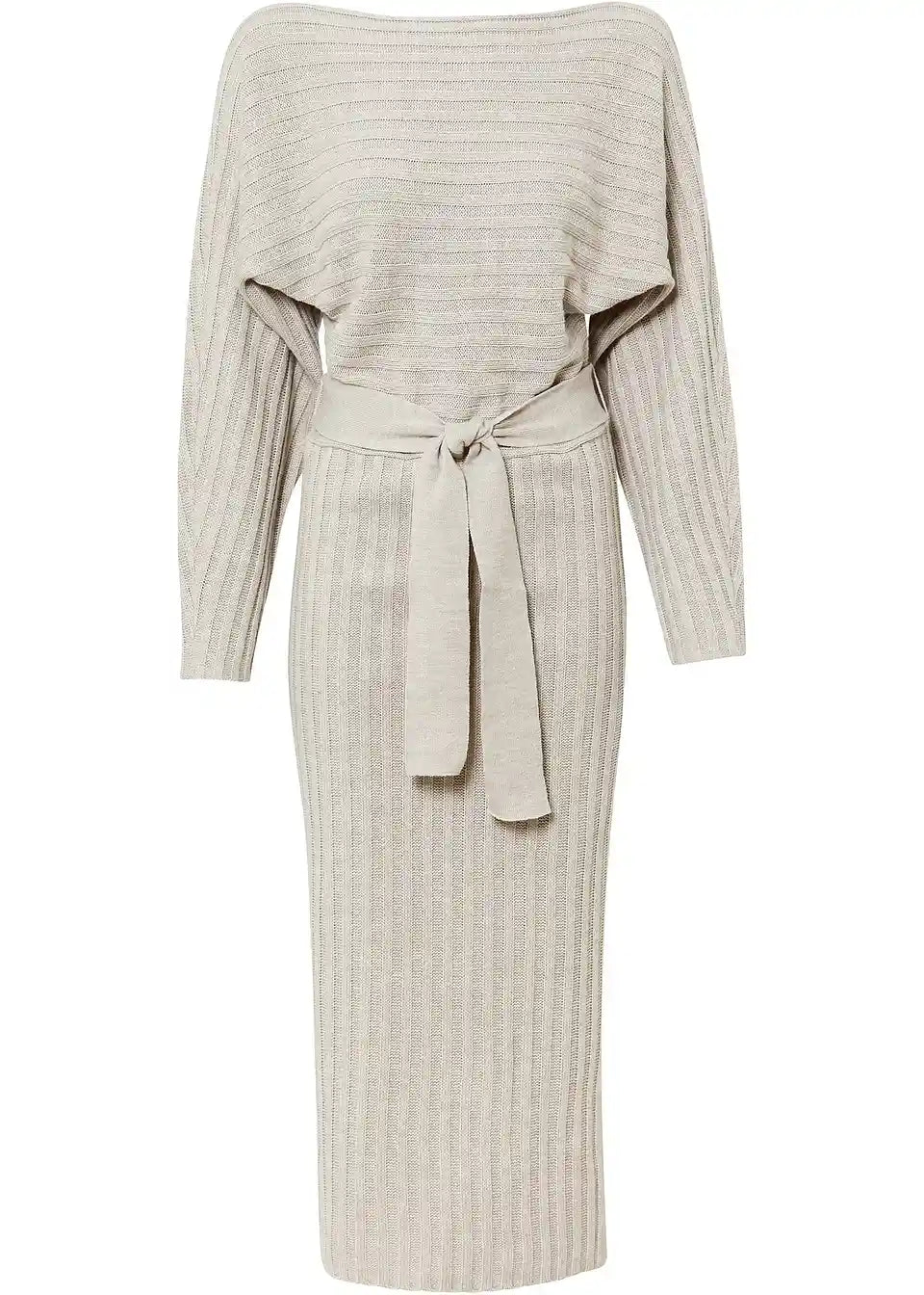 Privlačna pletena obleka z netopirskimi rokavi in širokim izrezom