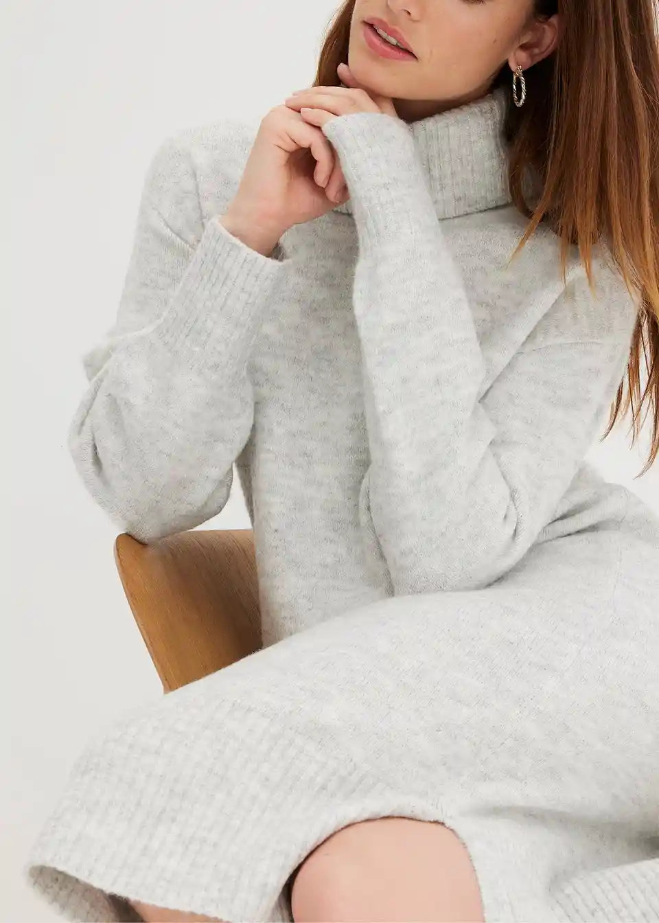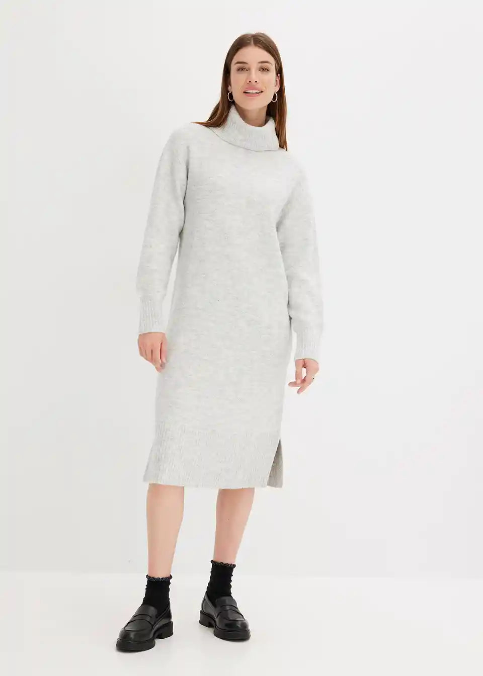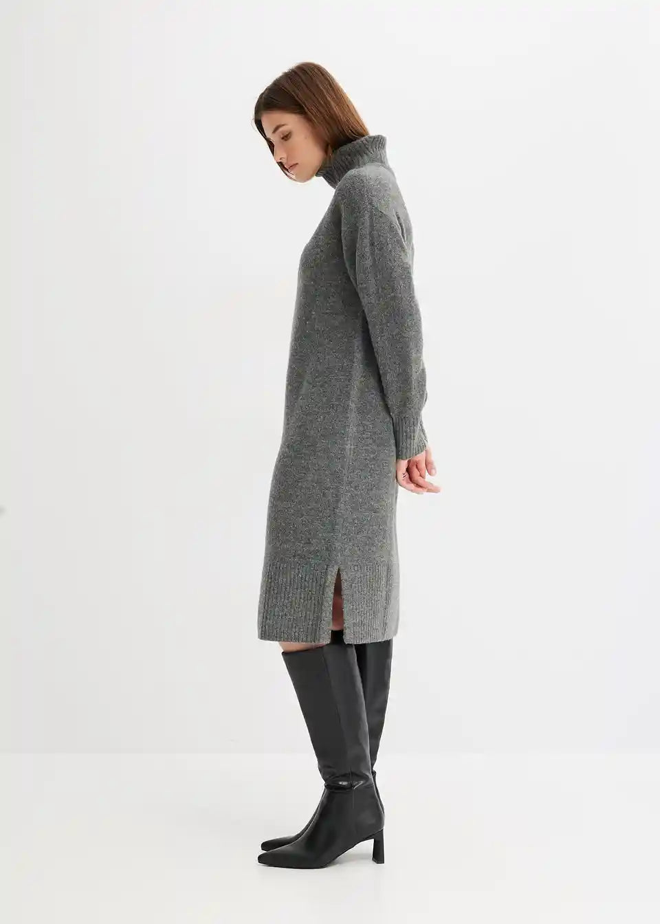 Čudovita pletena obleka midi dolžine z visokim ovratnikom in razporkom