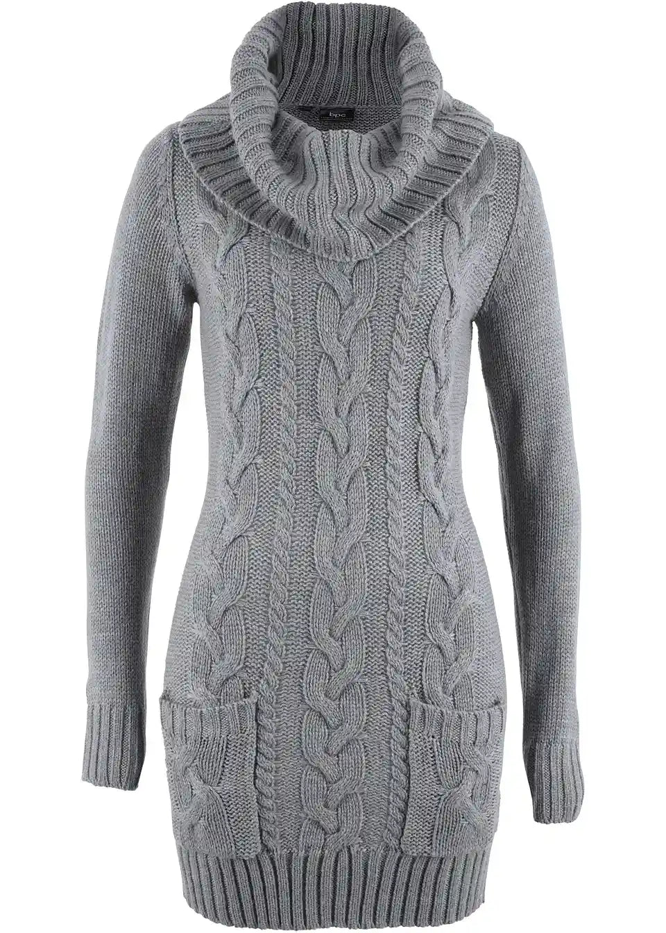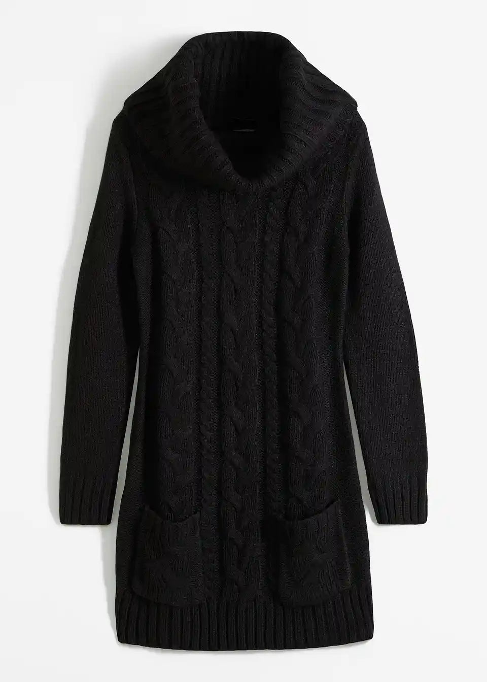 Ta oprijeta pletena obleka iz najnovejše kolekcije bpc je pravo obvezno oblačilo za zimo! Širok rol ovratnik in grobo pleteni vzorec kabele poudarjata njen modni slog. Na sprednji strani navdušuje pralna pletena obleka z dvema odprtima našitima žepoma. Odlično se ujema z ozkimi hlačami, pajkicami ali debelimi najlonkami.