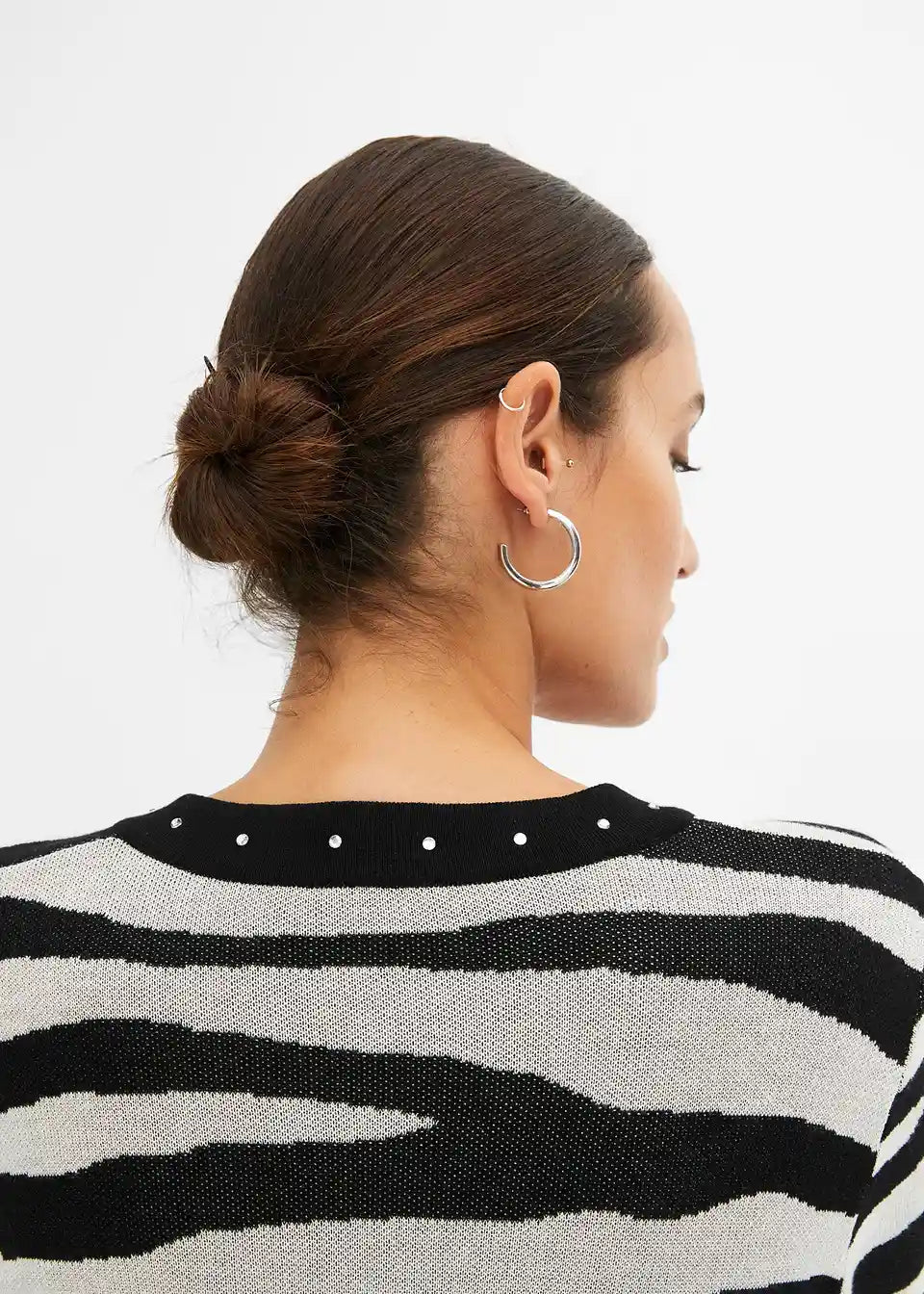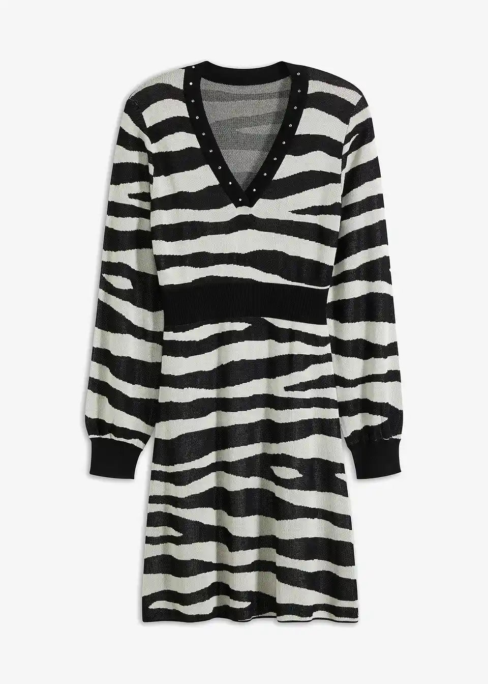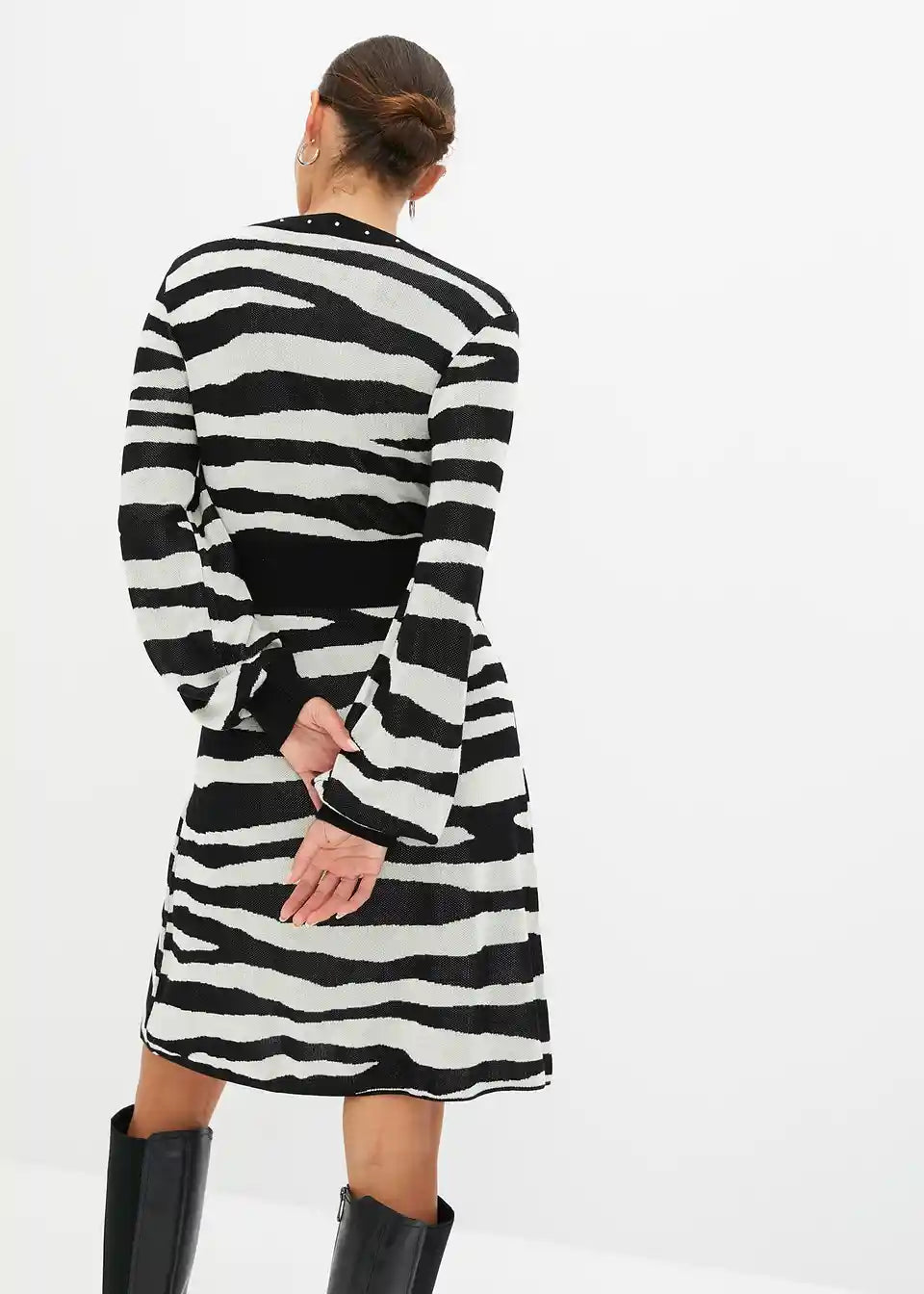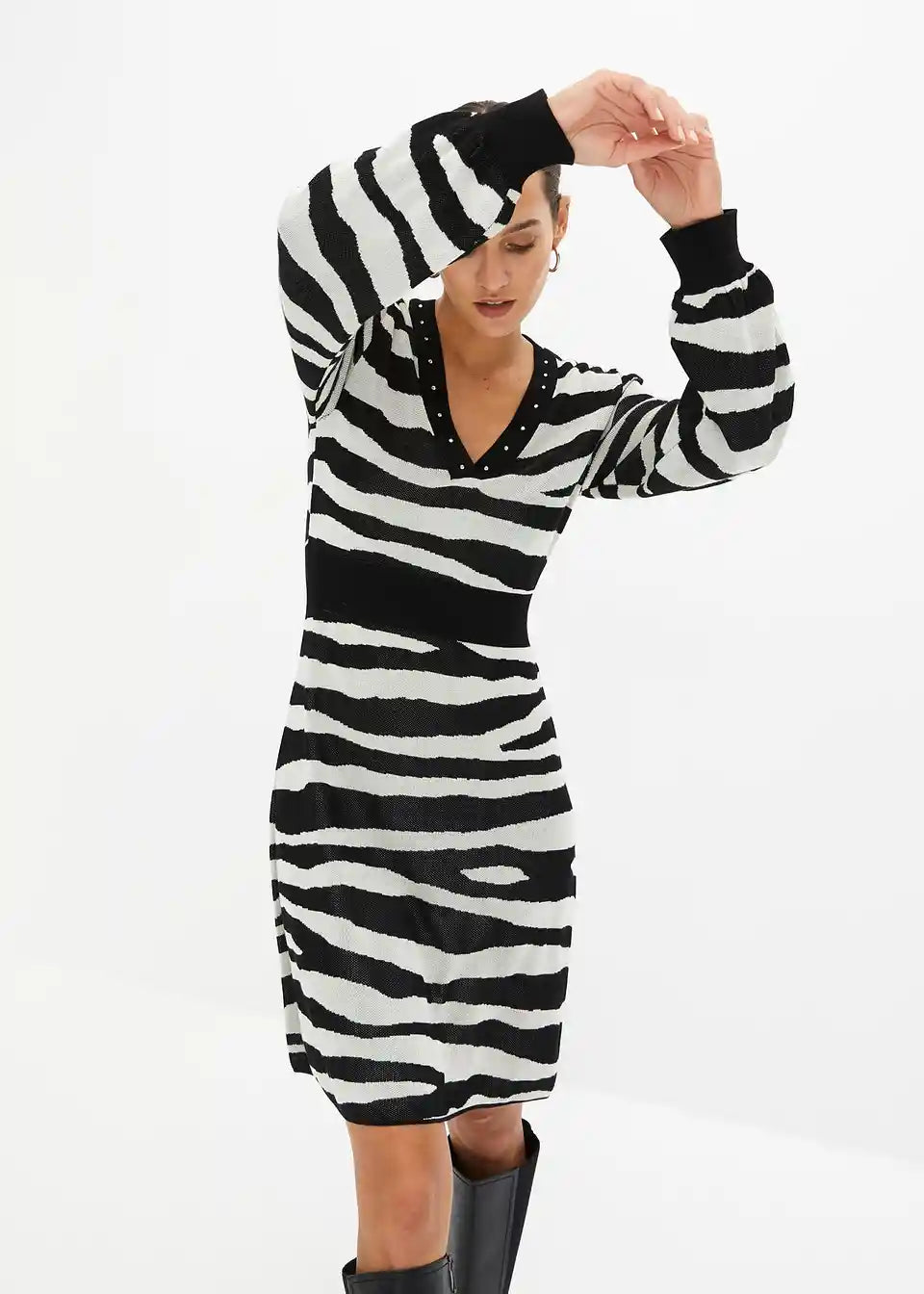 Elegantna obleka s čudovitim prileganjem in dekorativnimi zakovicami na izrezu