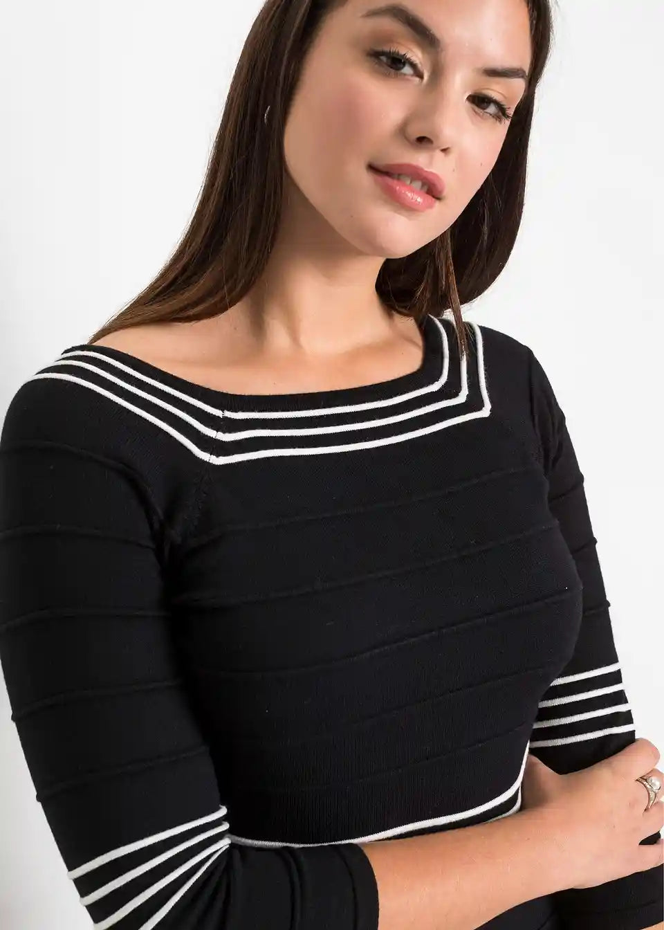Ta pletena obleka znamke BODYFLIRT poudarja žensko karizmo. Kratka obleka s 3/4 rokavi iz prijetno mehke pletenine poudarja žensko silhueto. Črte na Carmen izrezu ter v pasu, na rokavih in robu ustvarijo čudovite poudarke. Dopolnite to pleteno obleko s salonarji ter elegantnimi zapestnimi in vratnimi okraski.