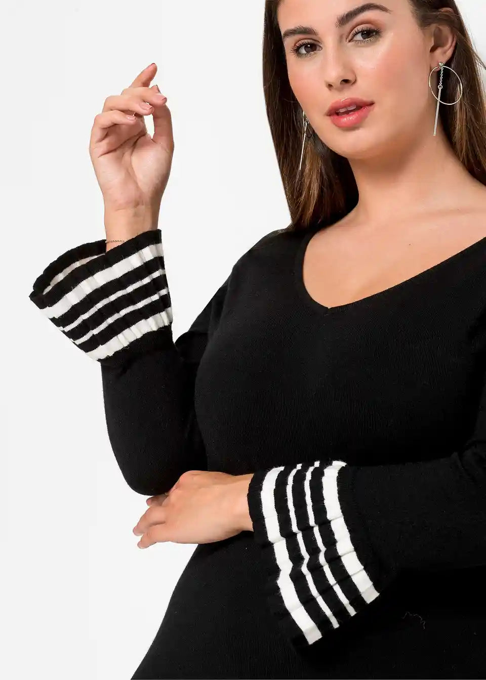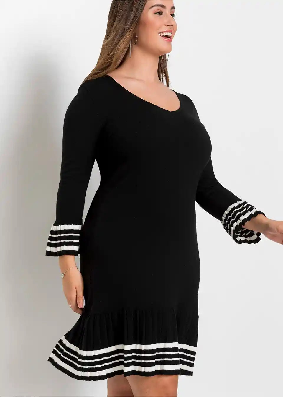 Igriva pletena obleka znamke BODYFLIRT. Pletena obleka ima všite plisirane detajle na krilu in manšetah rokavov. Dolžina pri vel. 36/38 približno 90 cm.
