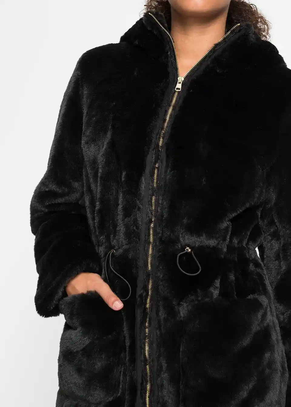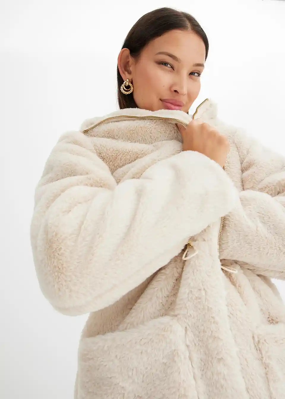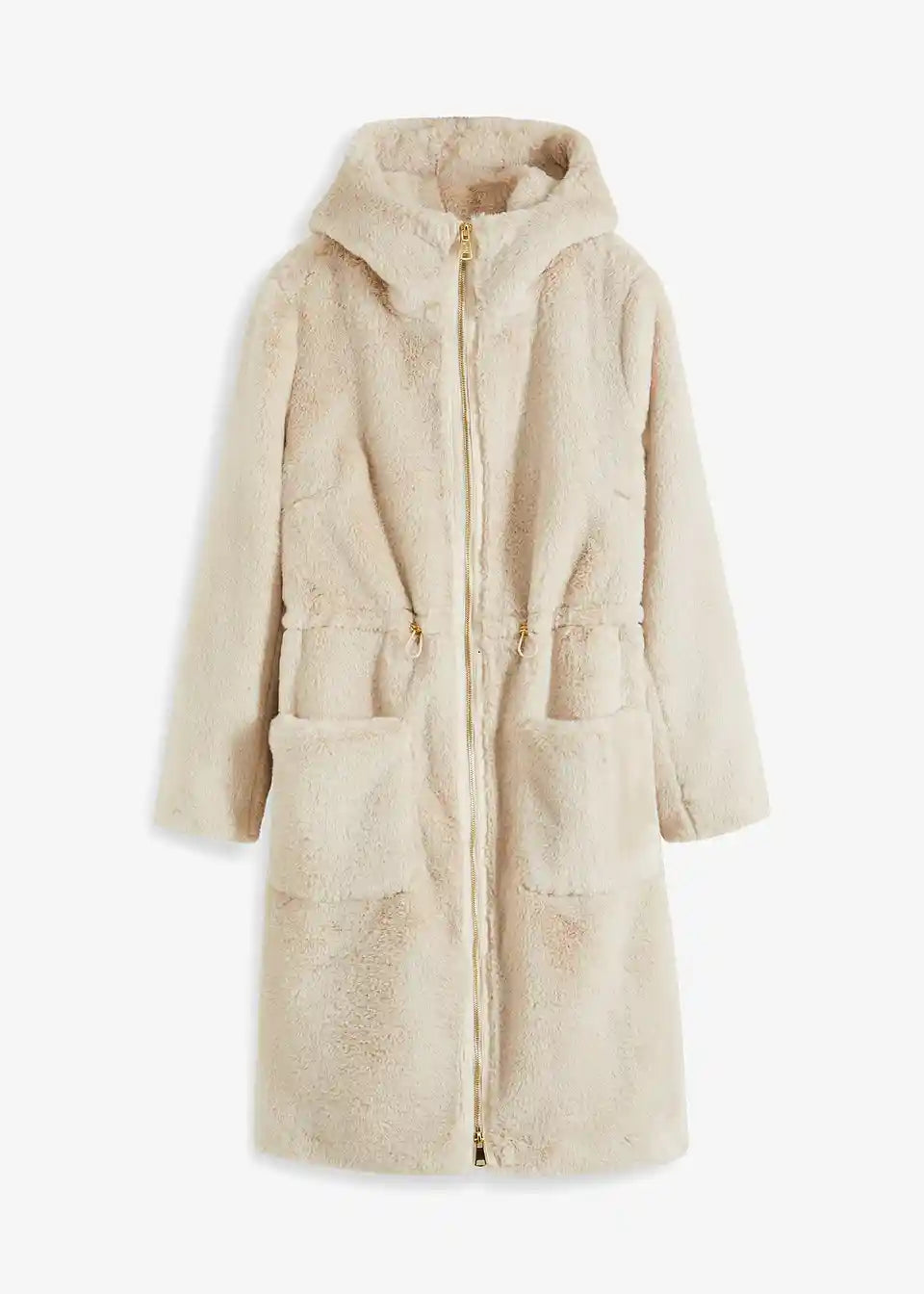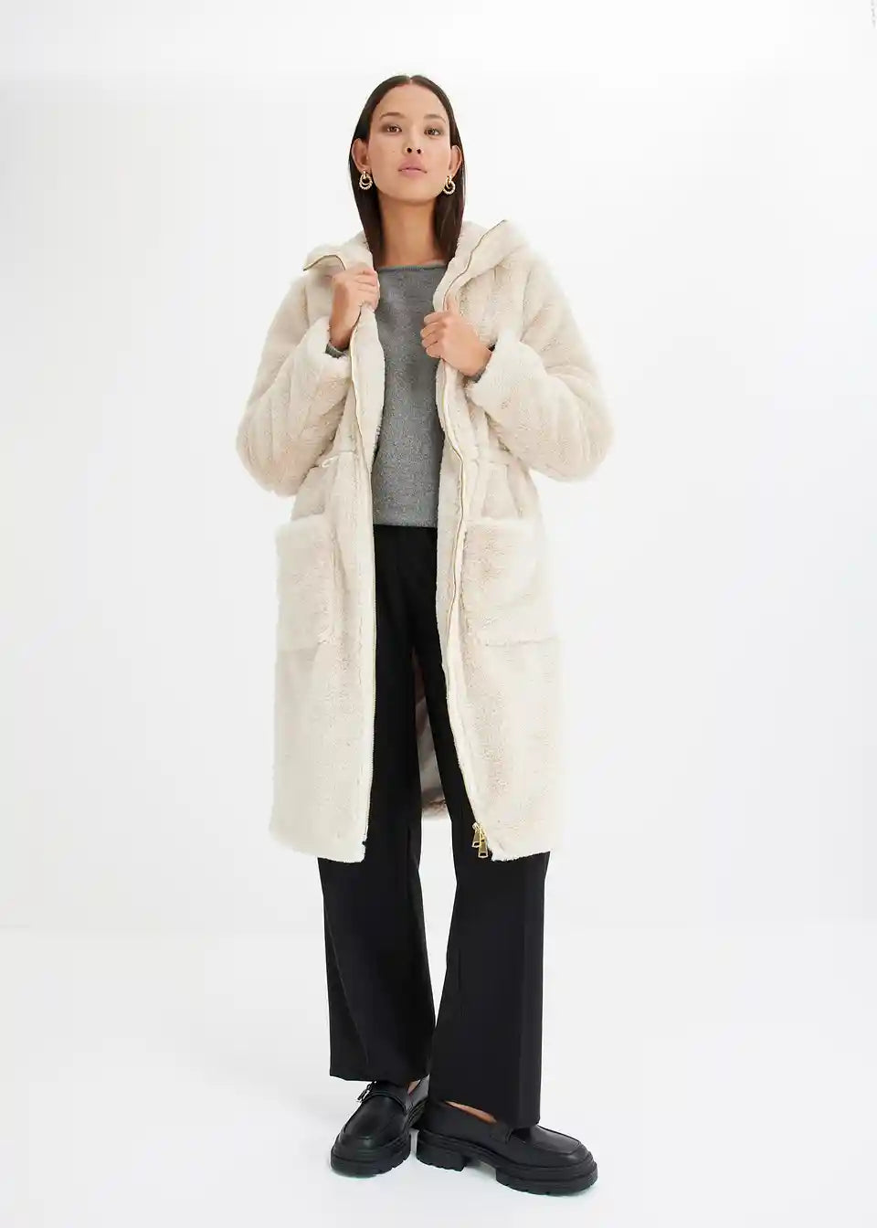 Prijeten zimski plašč iz plišastega materiala z velikimi žepi in kapuco