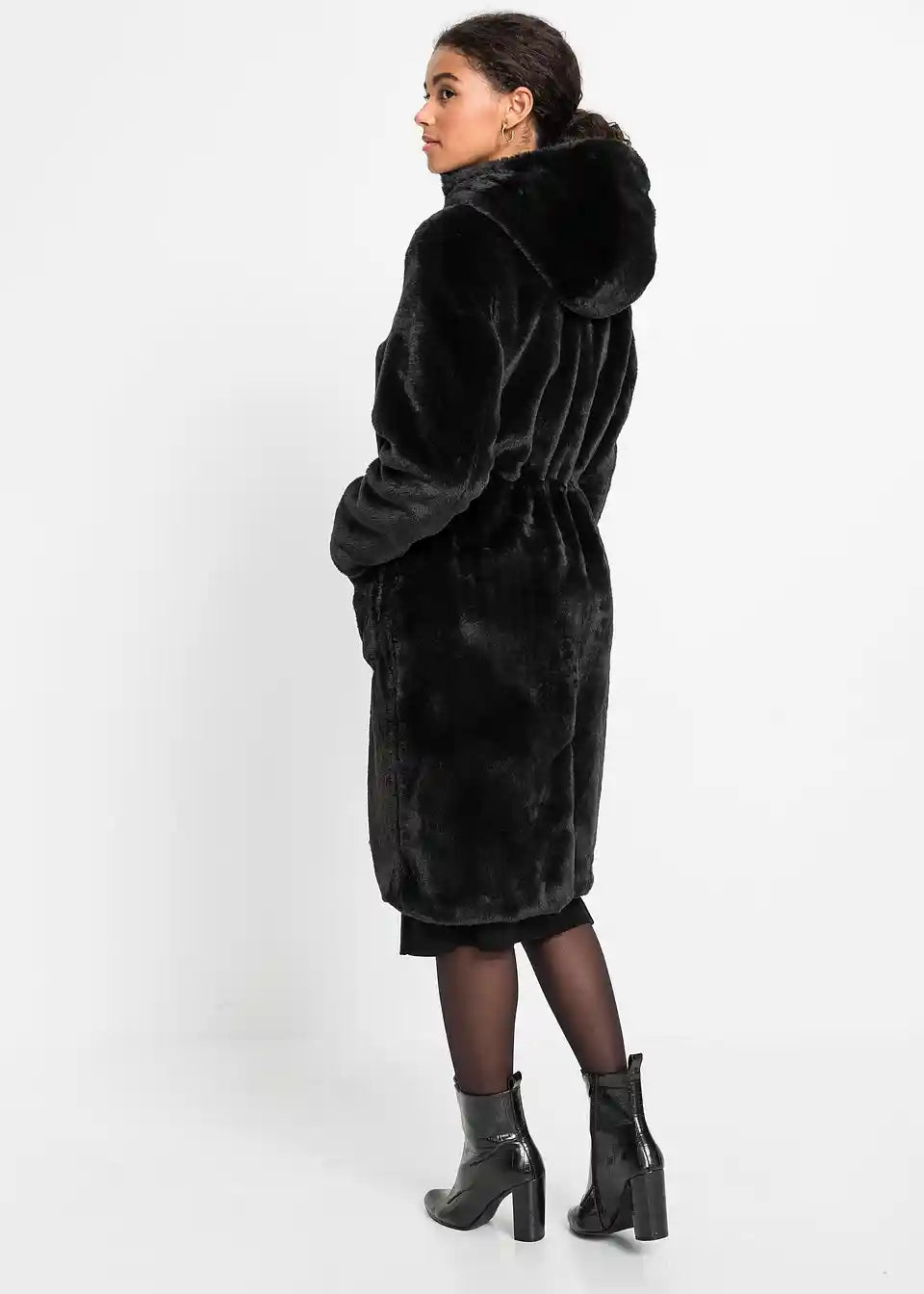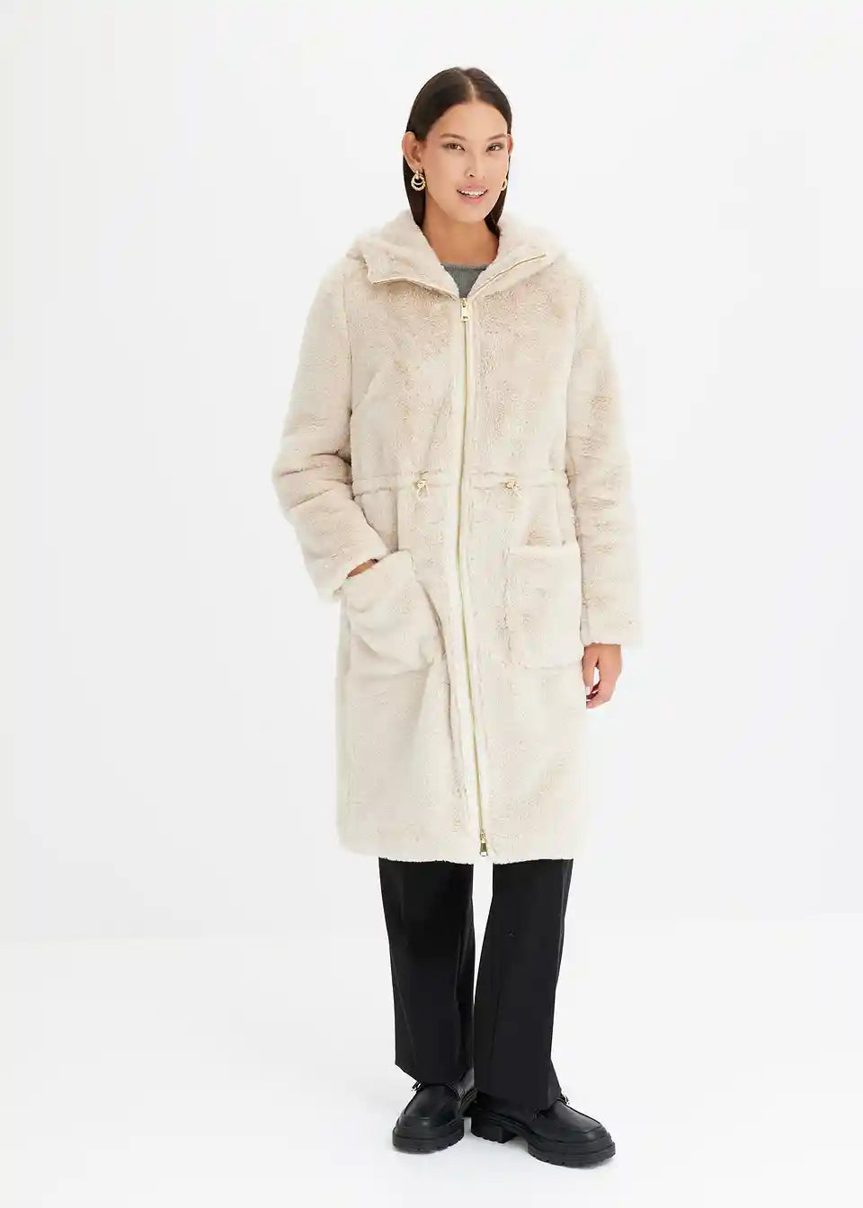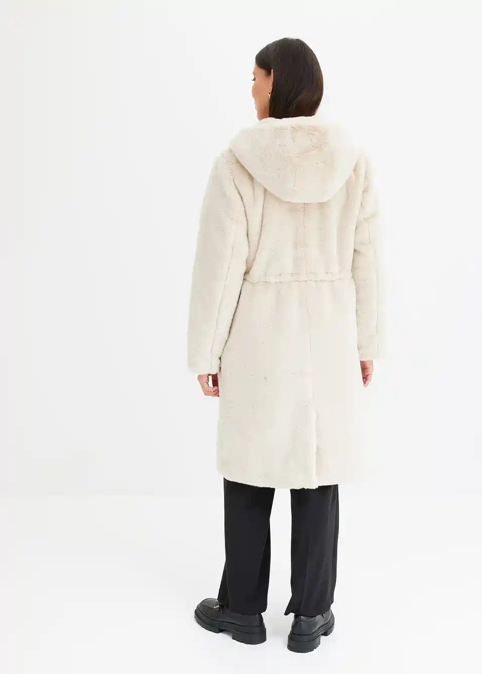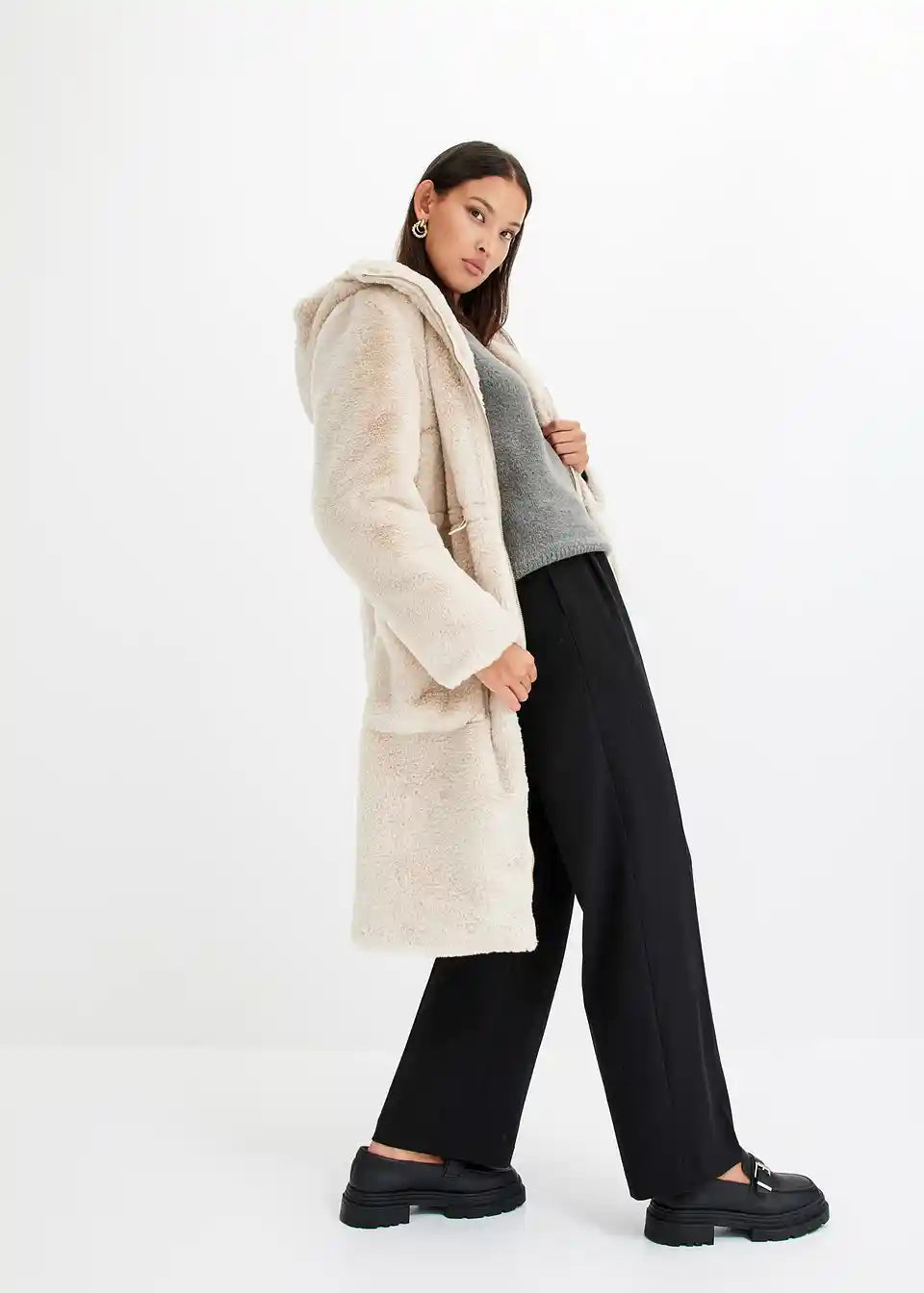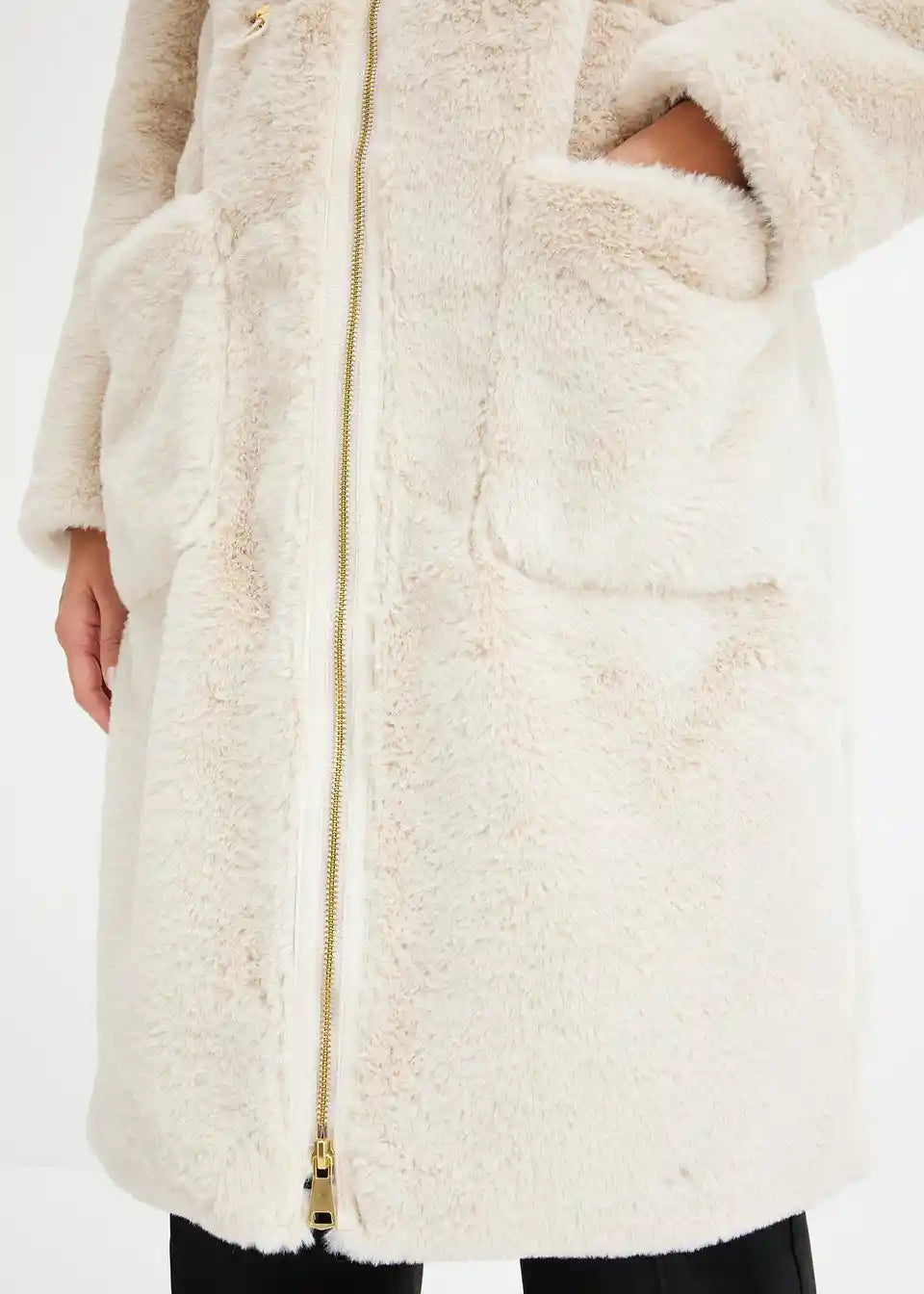 Prijeten zimski plašč iz plišastega materiala z velikimi žepi in kapuco