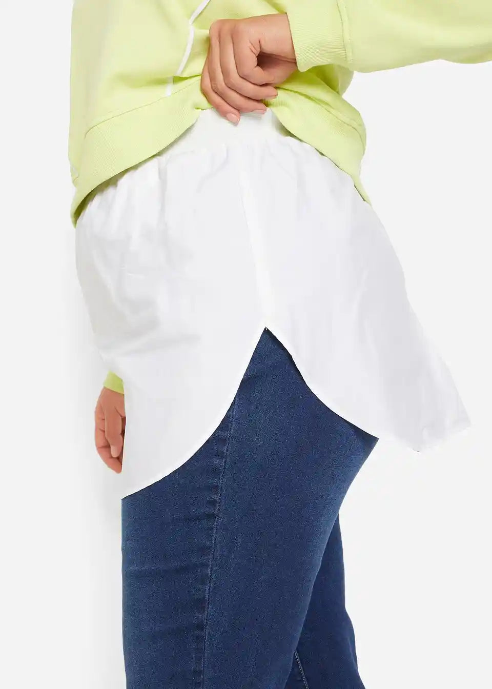 Moden podaljšek za zgornja oblačila z zaobljenimi stranskimi razporki in popolnoma elastičnim pasom