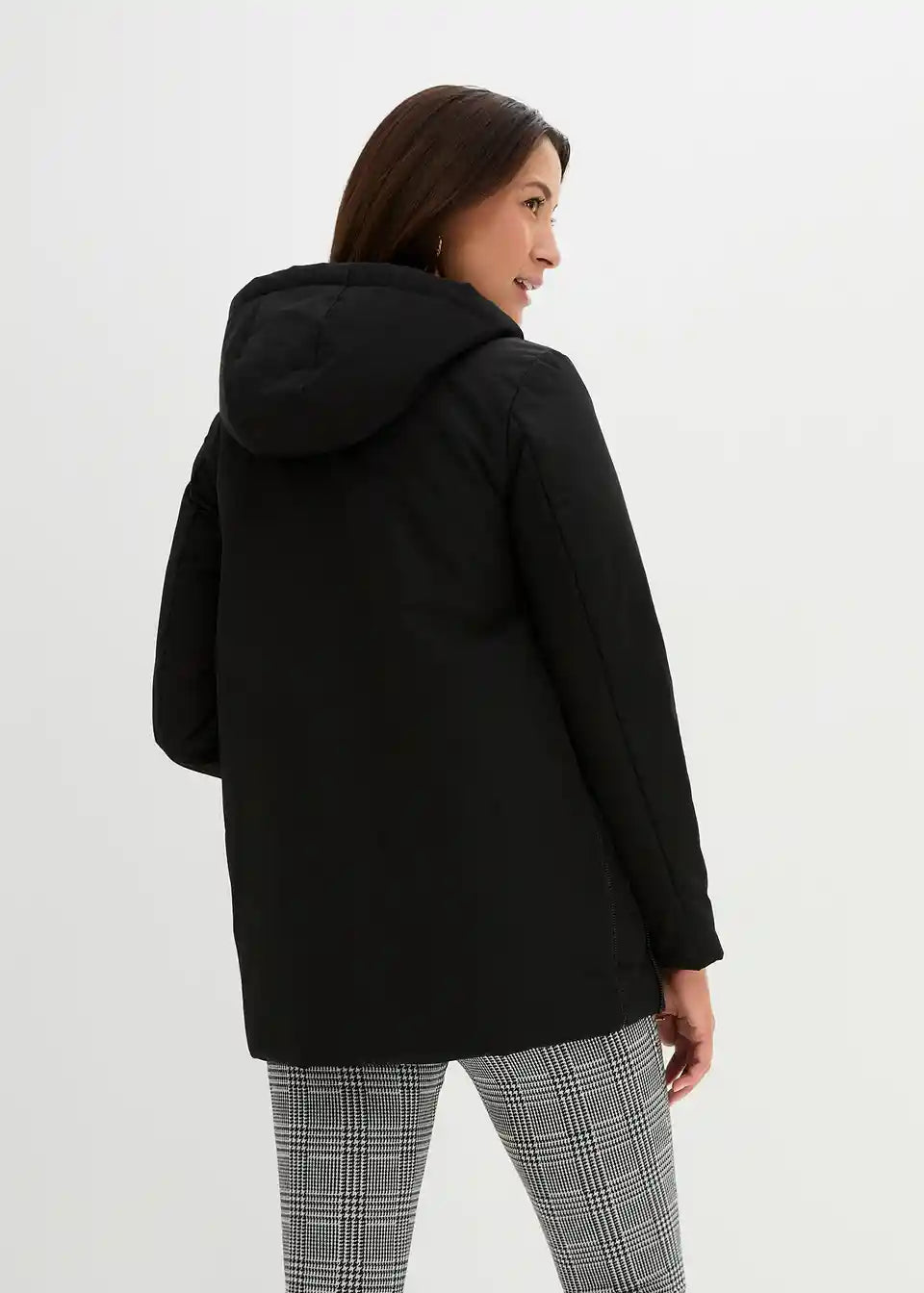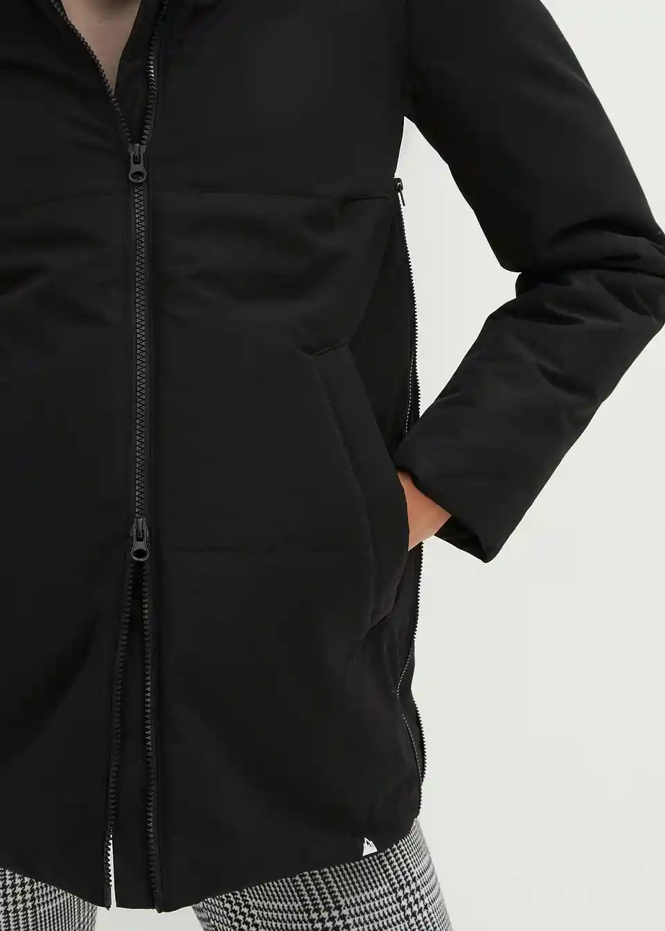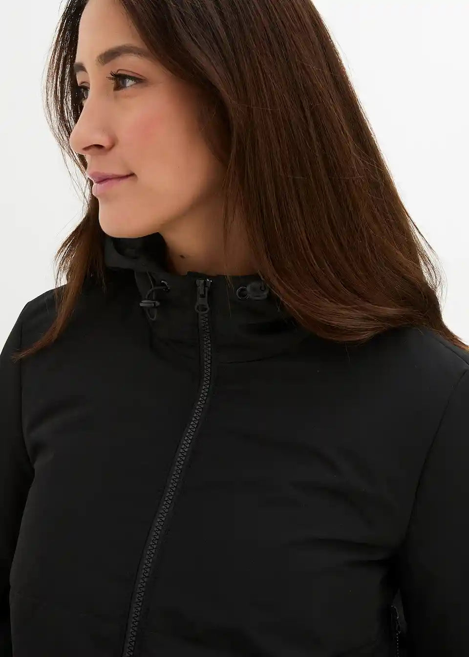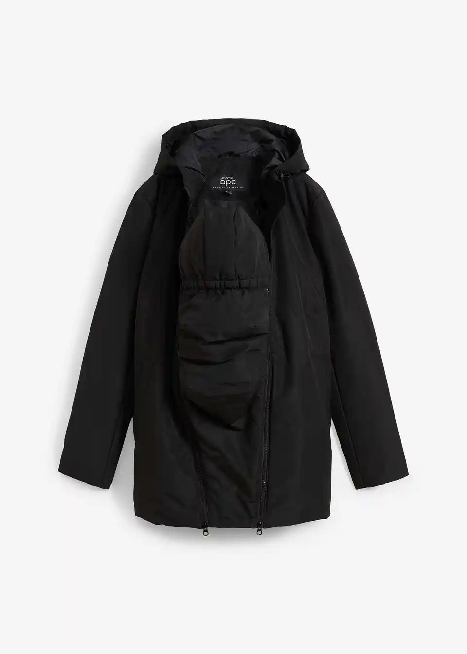 Dežju in vetru odporna funkcijska jakna z vložkom za nošenje z majhno kapuco za otroka. Spredaj z žepi in kapuca z vrvico. Stranske zadrge omogočajo prilagoditev širine, kar omogoča nošenje tako med nosečnostjo kot tudi po njej. Z dvosmerno zadrgo.