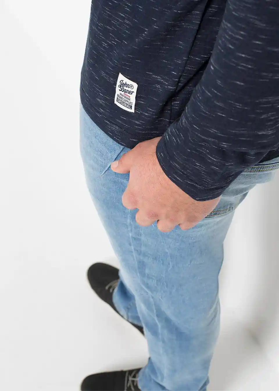 Karakteristična dolga polo majica z jeans ovratnikom.